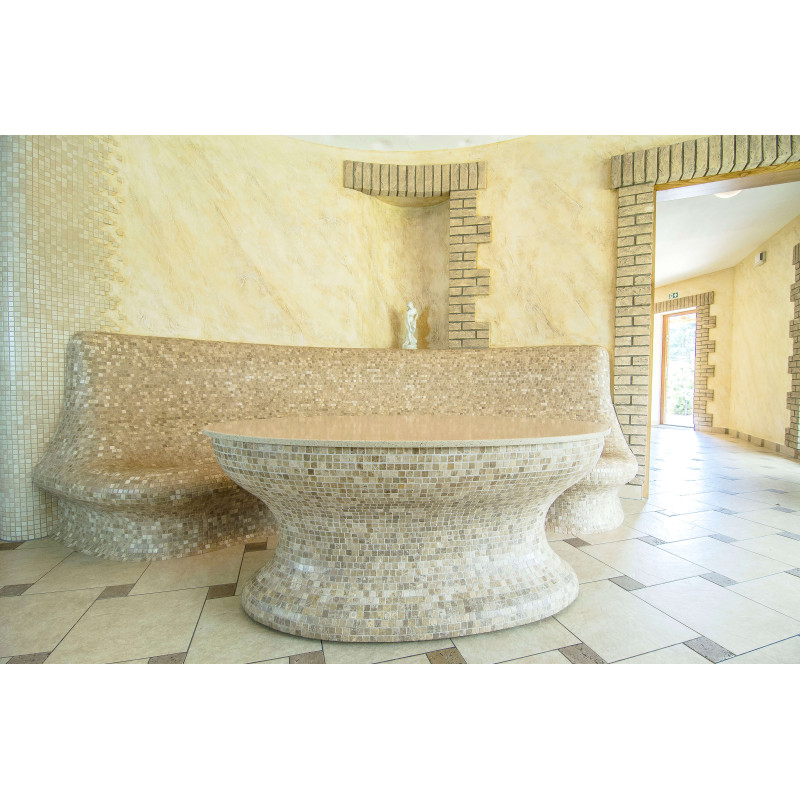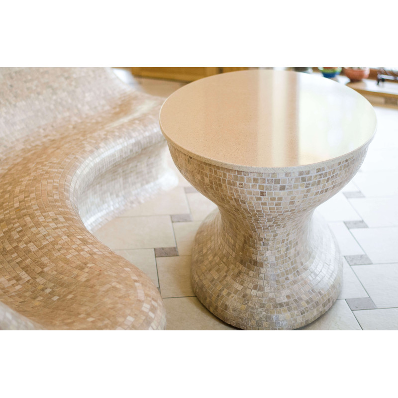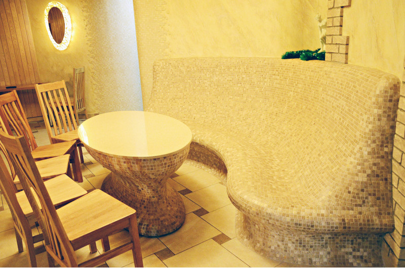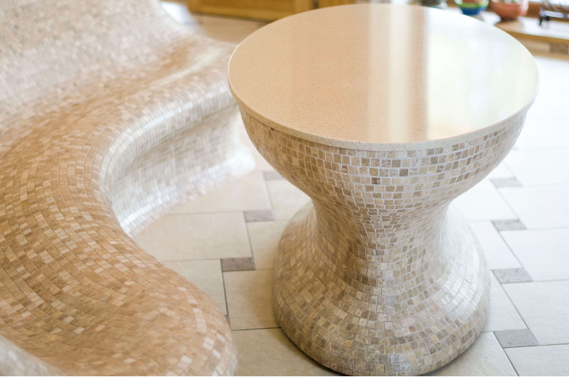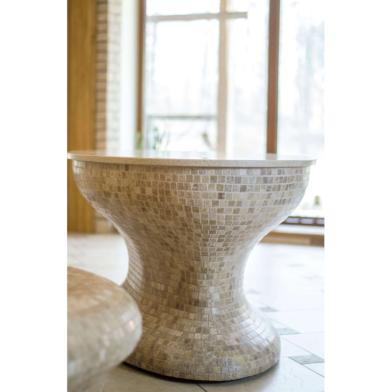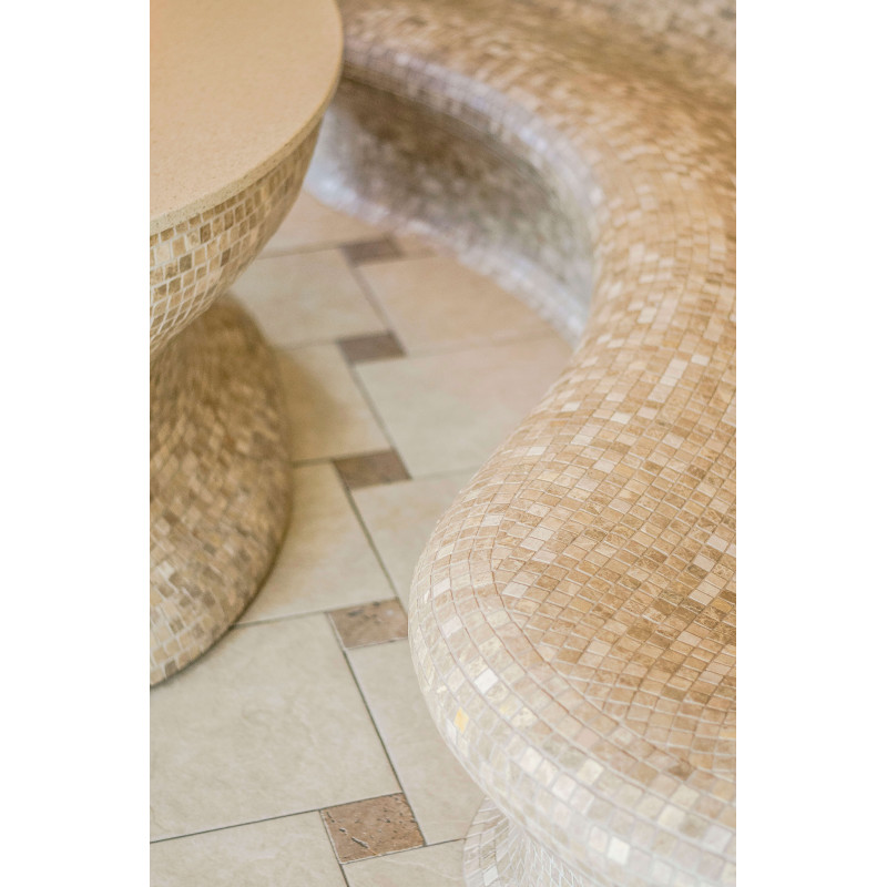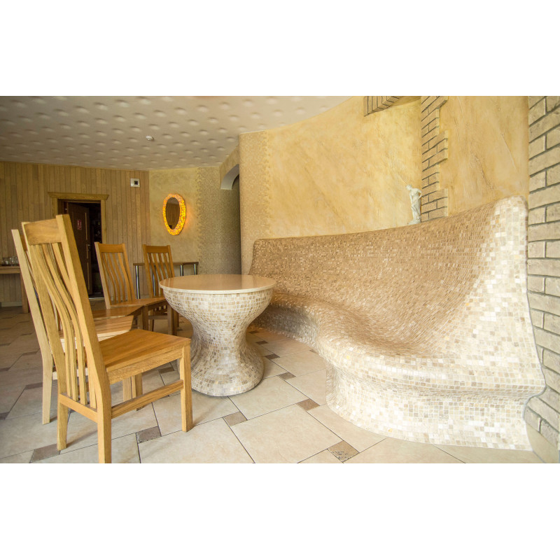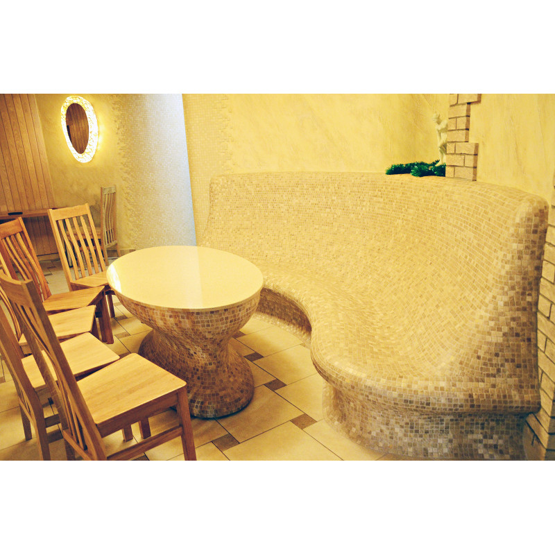 Opvarmede bænke- og bordformer er lavet individuelt af speciel ekstruderet polystyren. Bordplade - marmor. Finish - mosaikfliser. Bænken opvarmes fra varmesystemet.