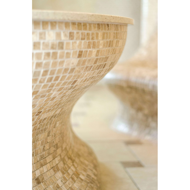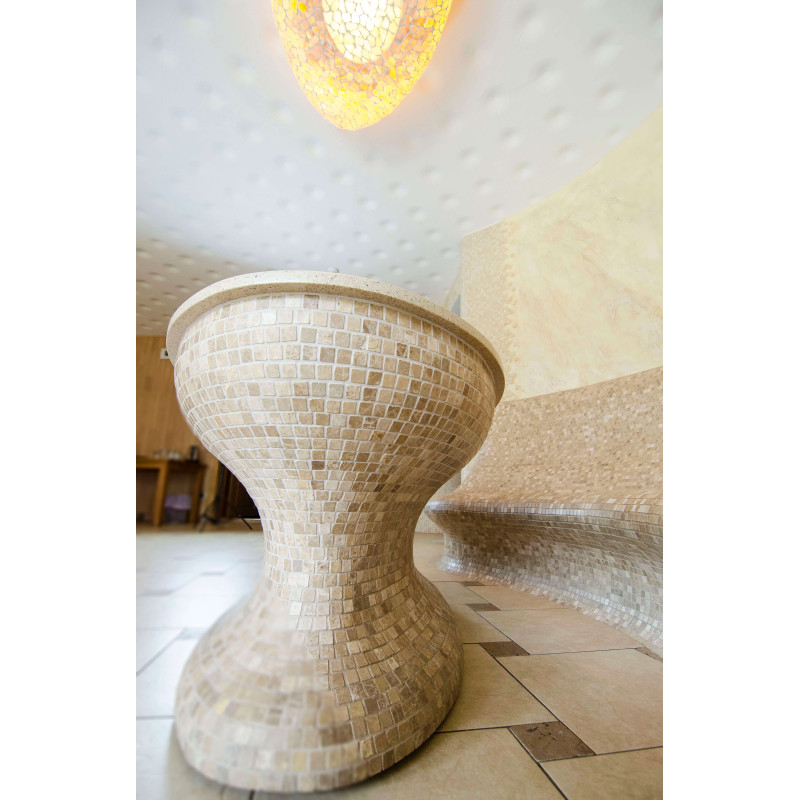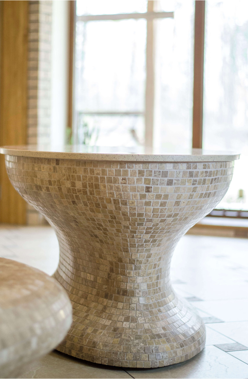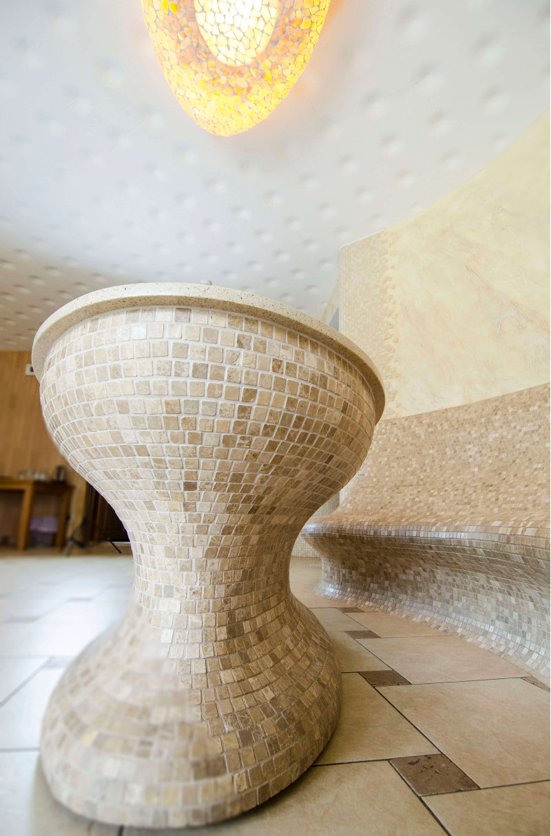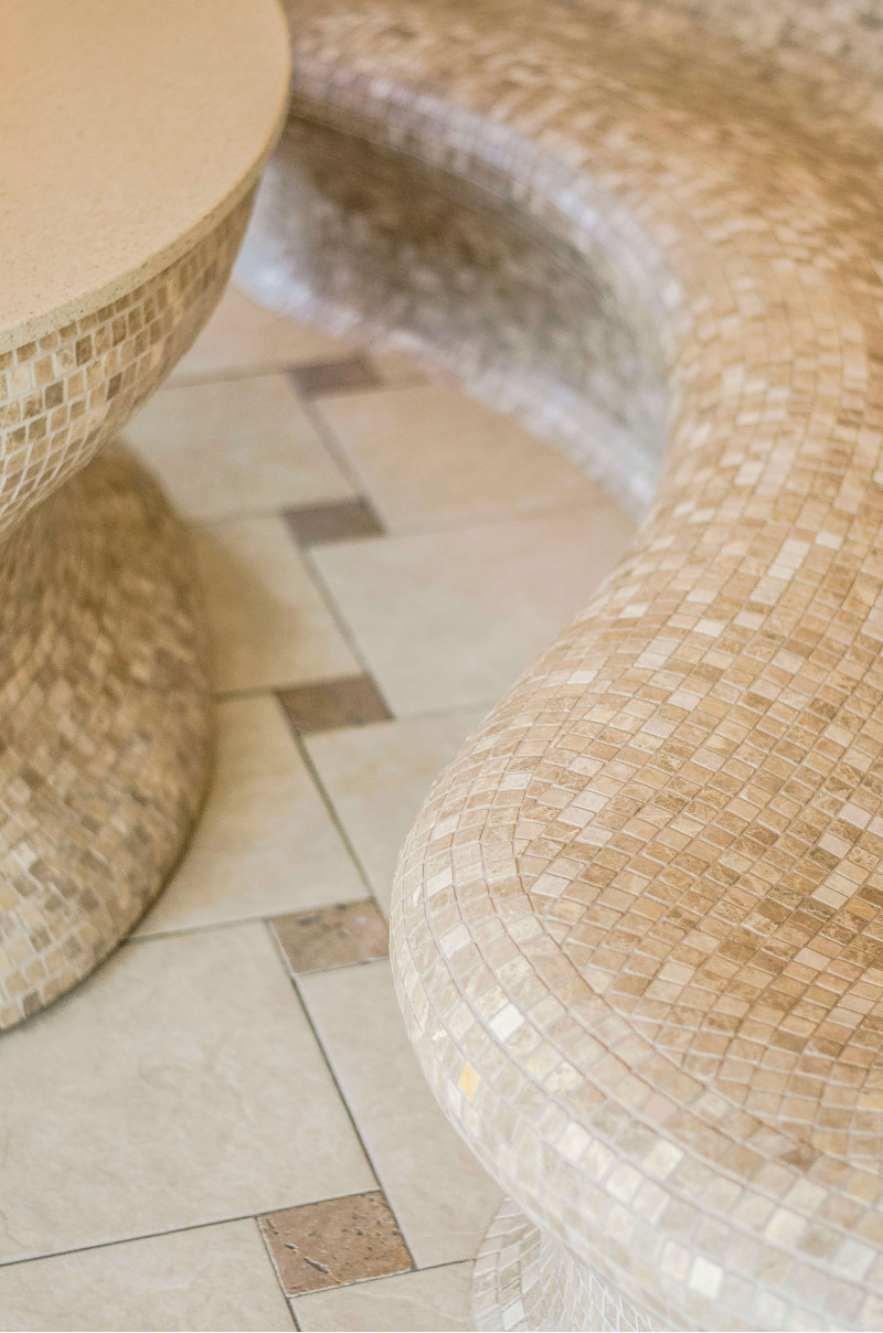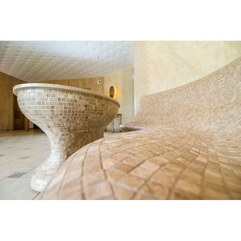 Opvarmede bænke- og bordformer er lavet individuelt af speciel ekstruderet polystyren. Bordplade - marmor. Finish - mosaikfliser. Bænken opvarmes fra varmesystemet.