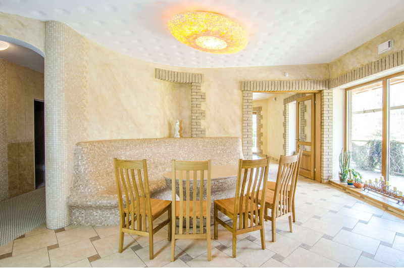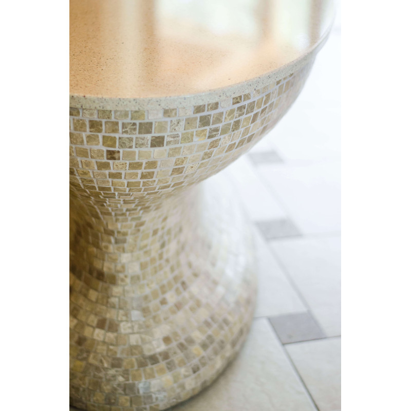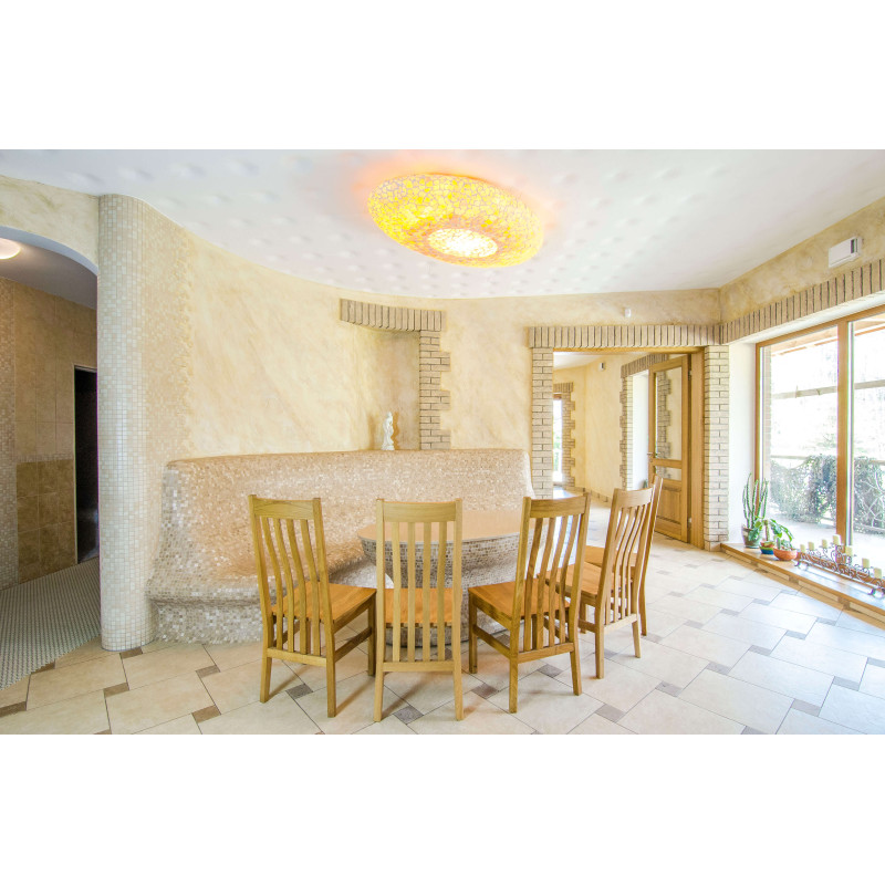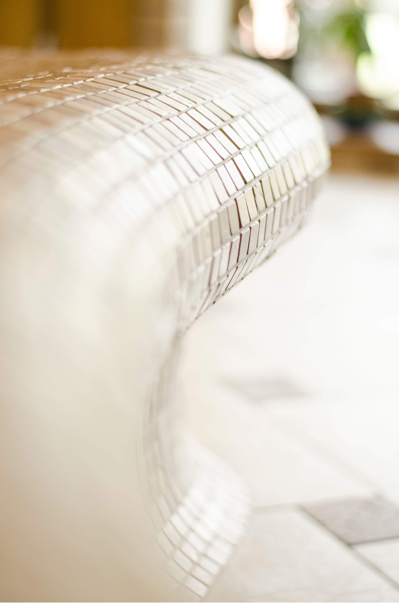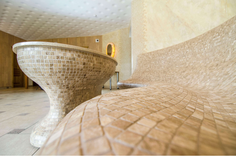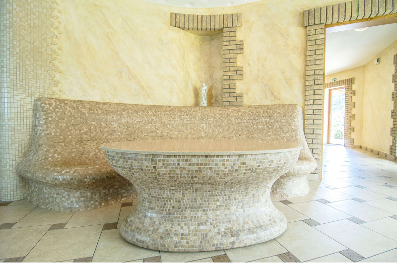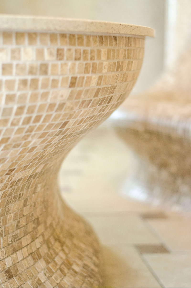 Opvarmede bænke- og bordformer er lavet individuelt af speciel ekstruderet polystyren. Bordplade - marmor. Finish - mosaikfliser. Bænken opvarmes fra varmesystemet.