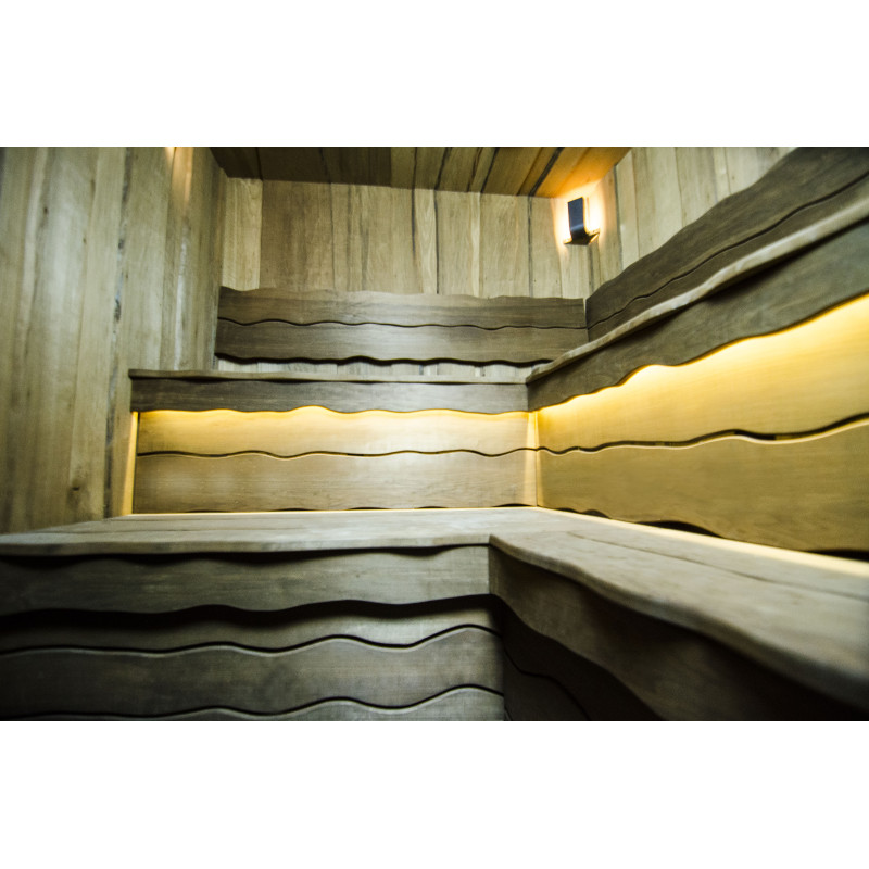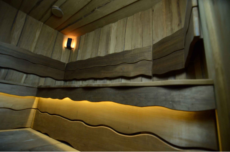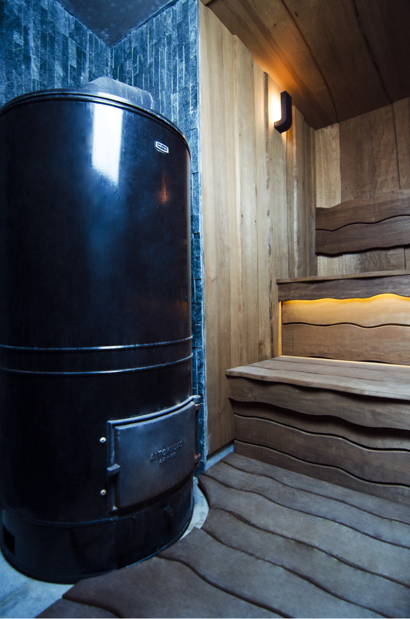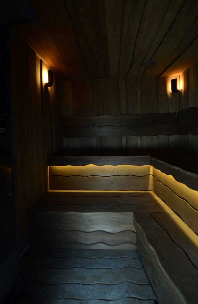 Brændt aspetræ blev brugt til at dekorere saunaens vægge og loft samt bænke og ryglæn. Høvlede enkeltskårne brædder er valgt for at give saunaen hygge og naturlighed.