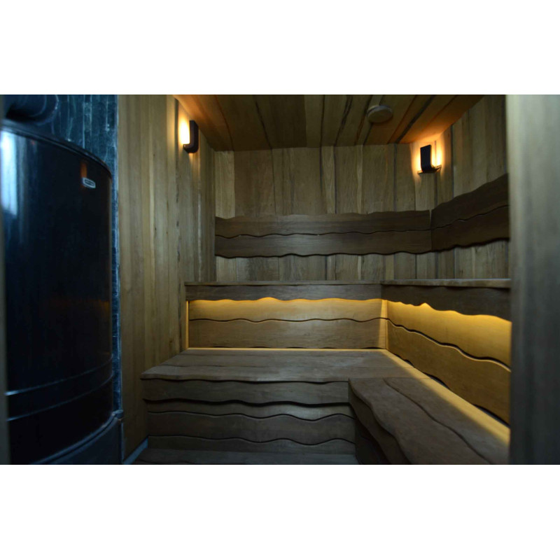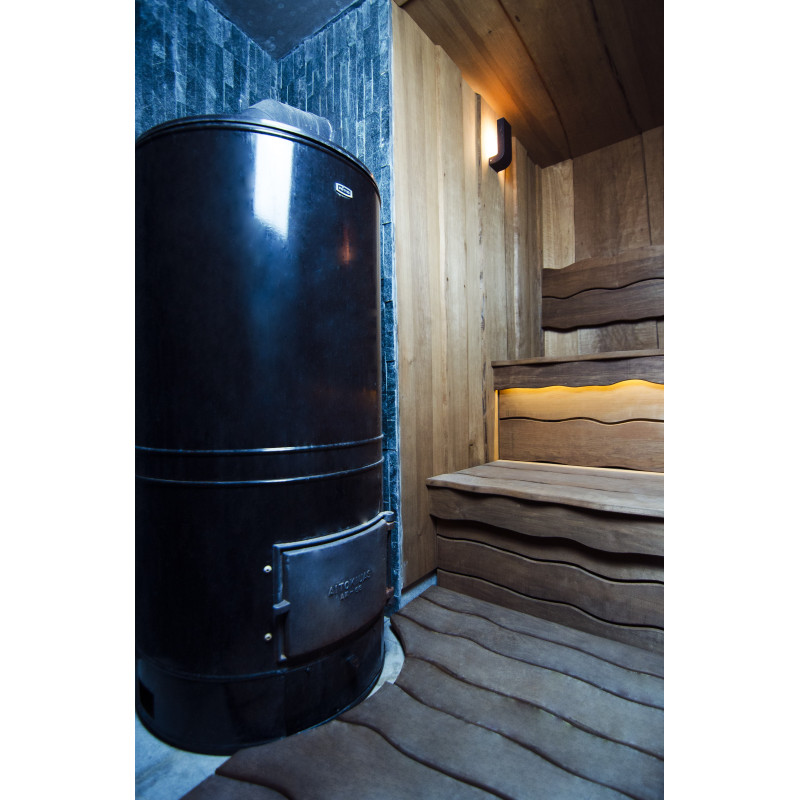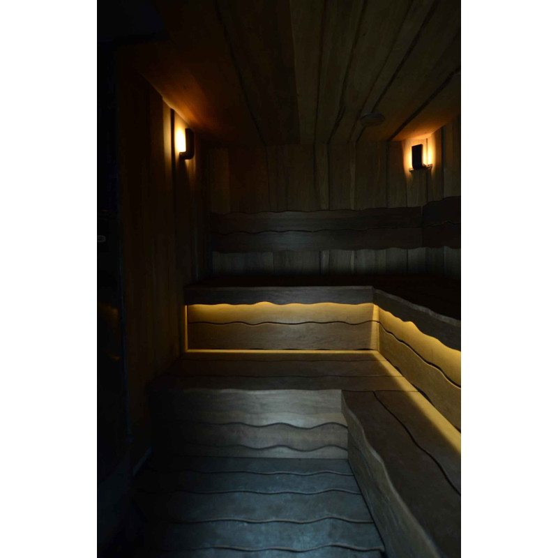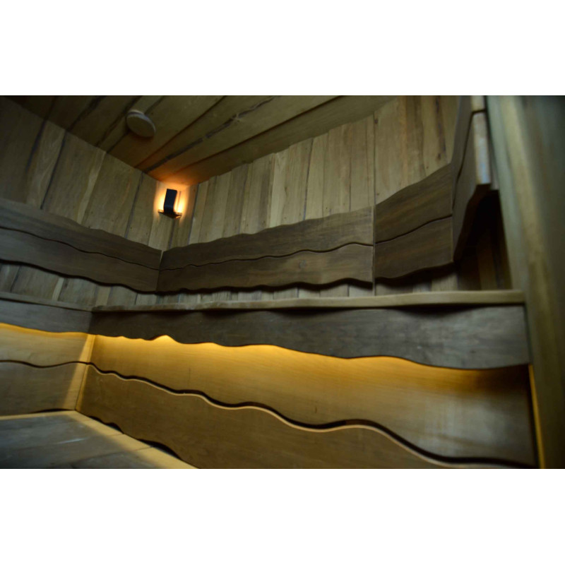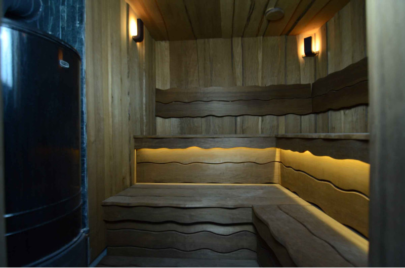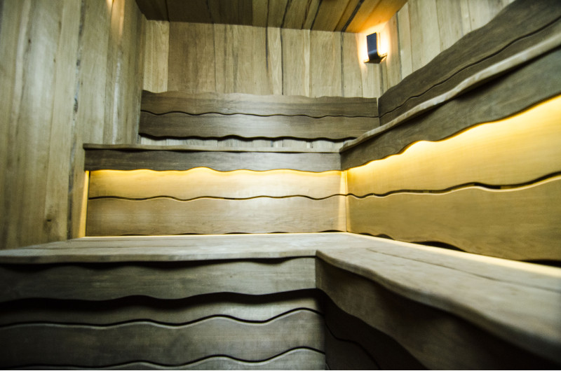Brændt aspetræ blev brugt til at dekorere saunaens vægge og loft samt bænke og ryglæn. Høvlede enkeltskårne brædder er valgt for at give saunaen hygge og naturlighed.