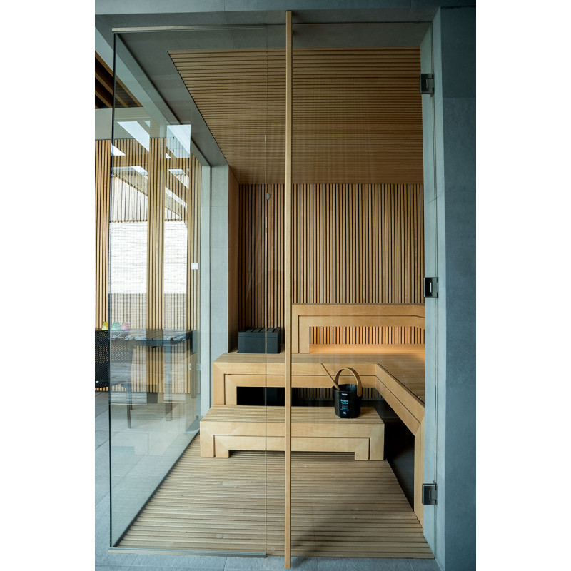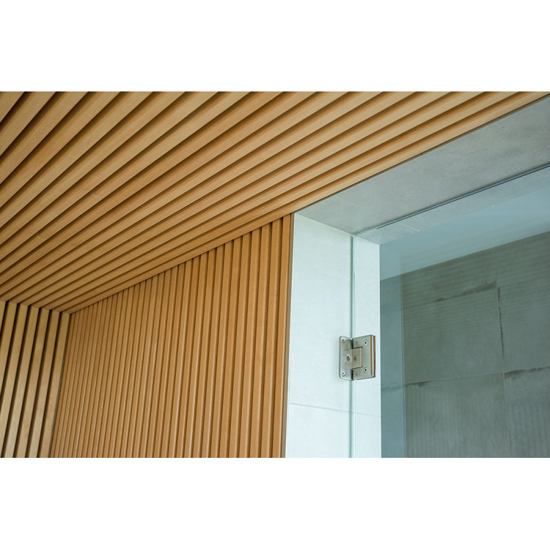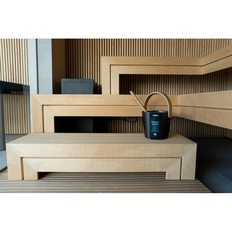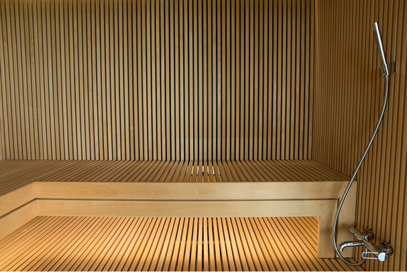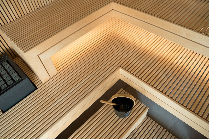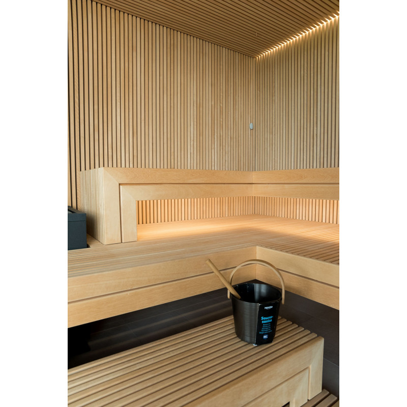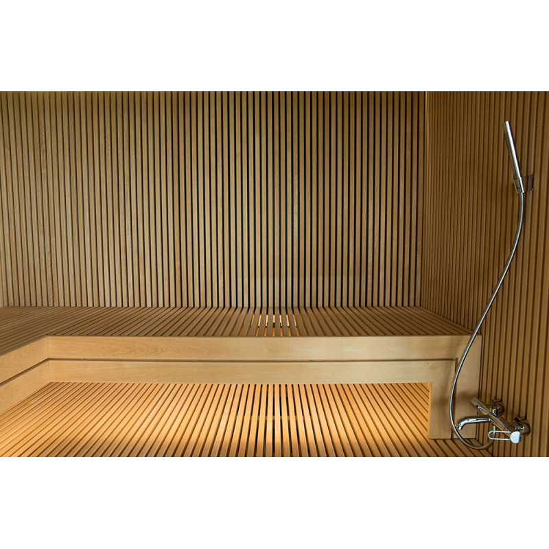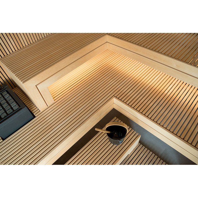 Det meget lyse træ, der er valgt, er abachi. Blød og lav varme. Denne positive funktion giver dig mulighed for at nyde saunaens fornøjelser i komfort. Fiberoptisk belysning understreger træets struktur. Belysningen under liggestolene og loftet snor sig vandret hen over hele væggen og oplyser de gennembrudte trælister komfortabelt.