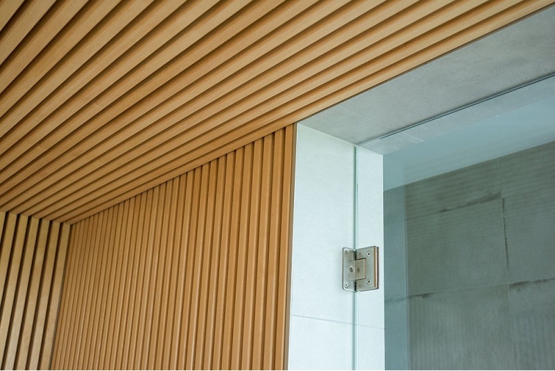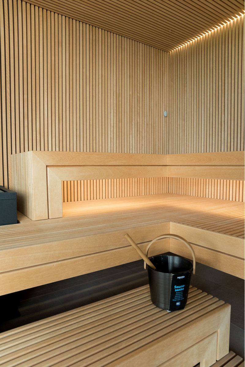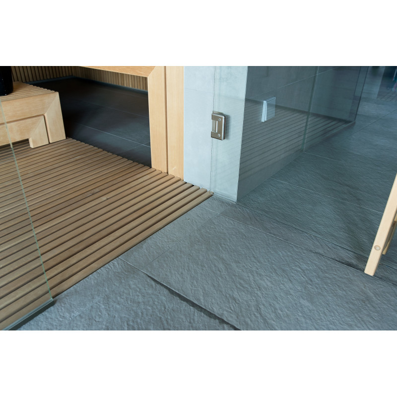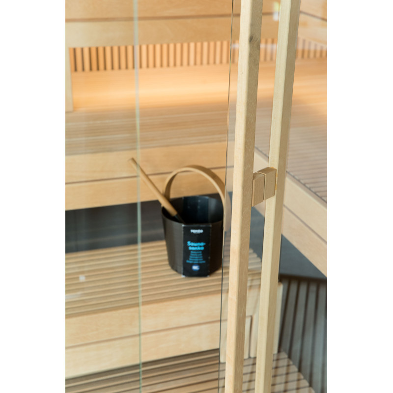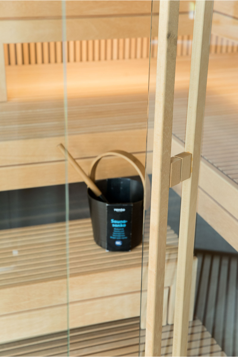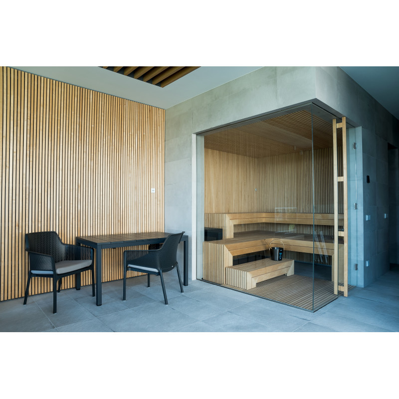 Det meget lyse træ, der er valgt, er abachi. Blød og lav varme. Denne positive funktion giver dig mulighed for at nyde saunaens fornøjelser i komfort. Fiberoptisk belysning understreger træets struktur. Belysningen under liggestolene og loftet snor sig vandret hen over hele væggen og oplyser de gennembrudte trælister komfortabelt.