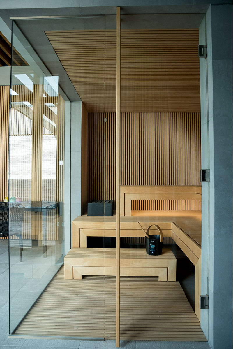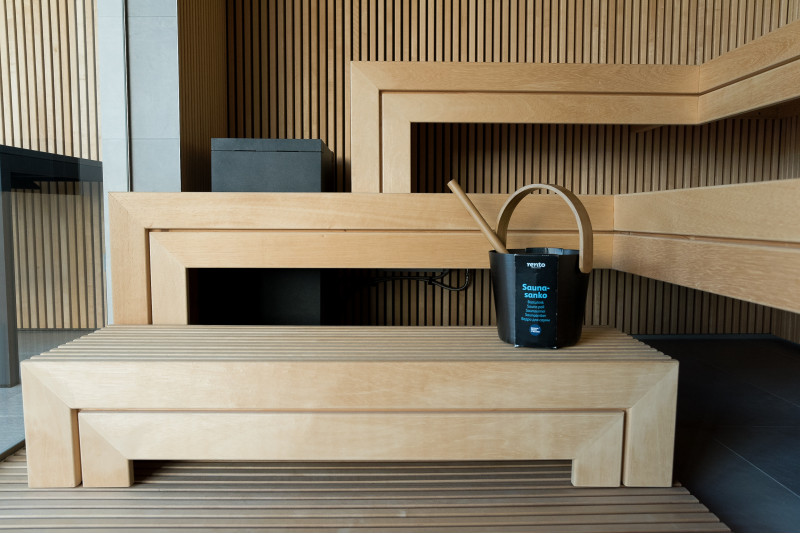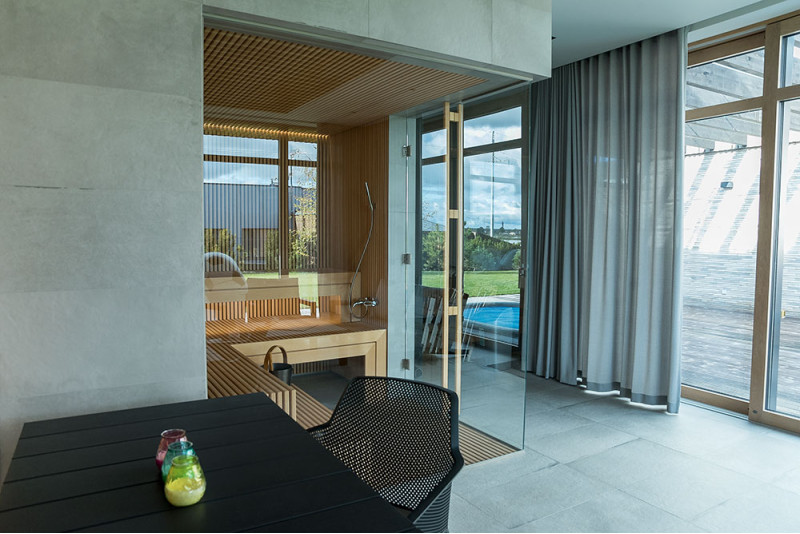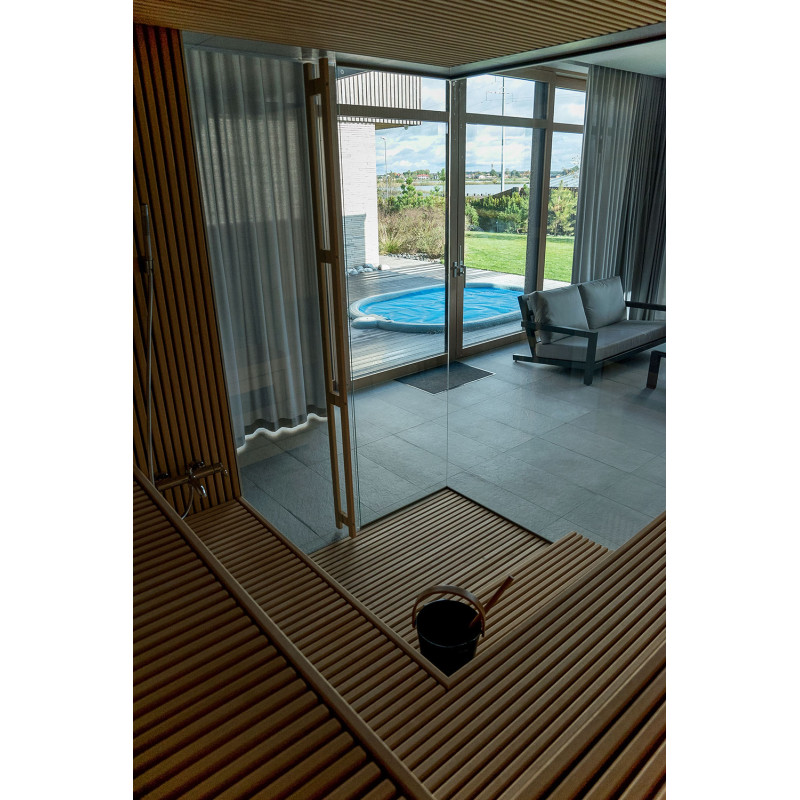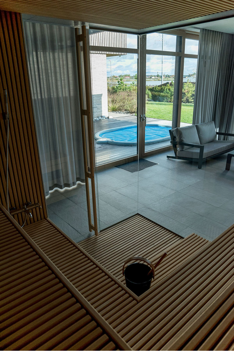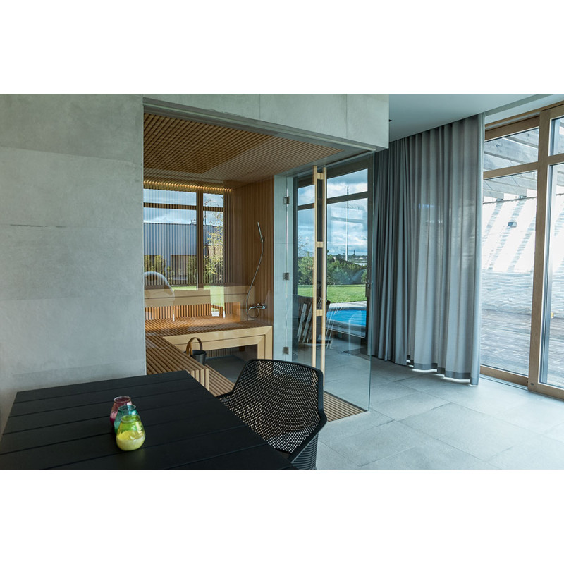 Det eksklusive design af denne sauna er skabt ved at dekorere med gennembrudt træ i Bruxelles. Gentagende træmotiver blev også brugt i saunaen. Der er skabt et rent og harmonisk rum, det er ikke opdelt af en saunaglasmontre, men tværtimod - det udvider og åbner udsigten til den vidunderlige natur.