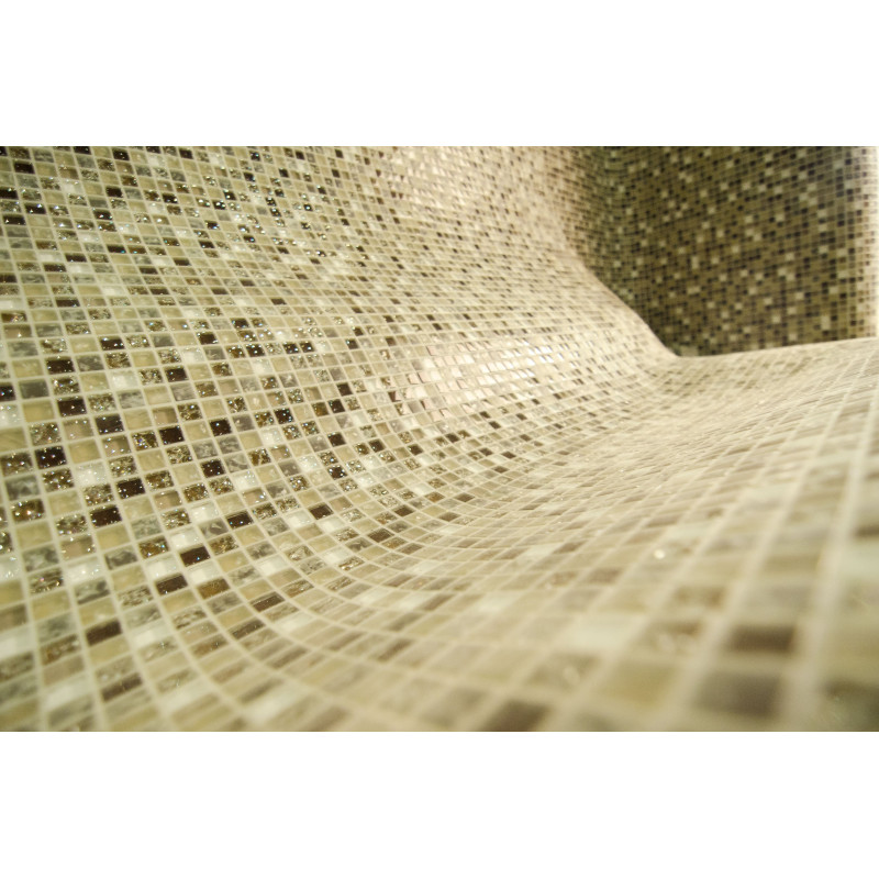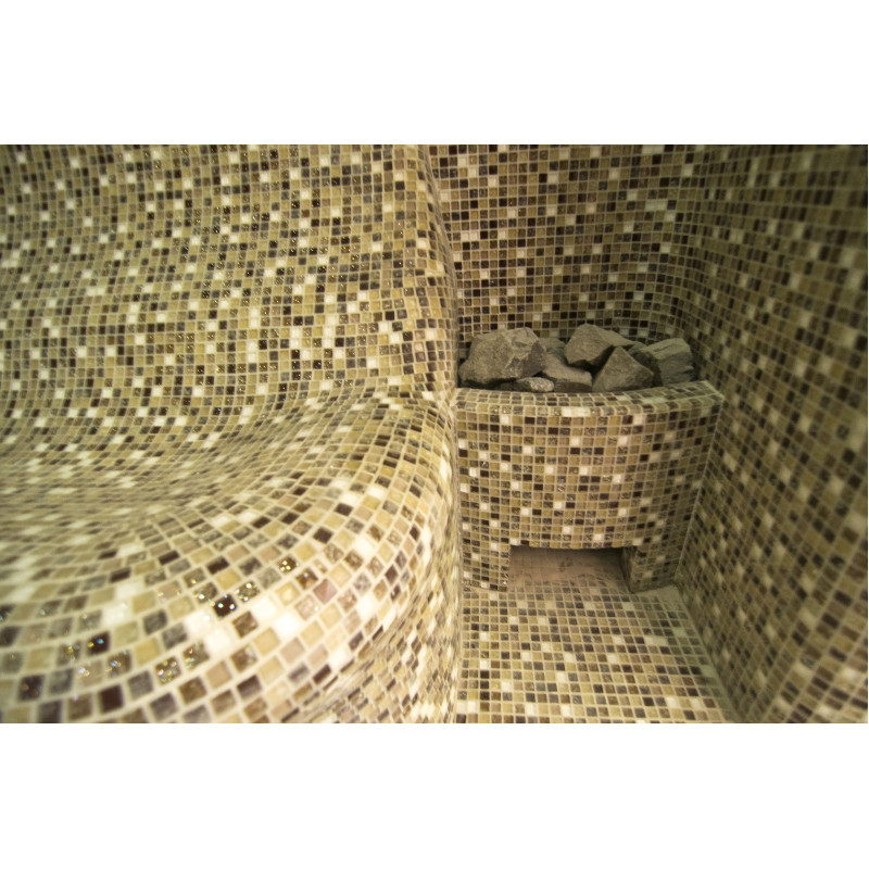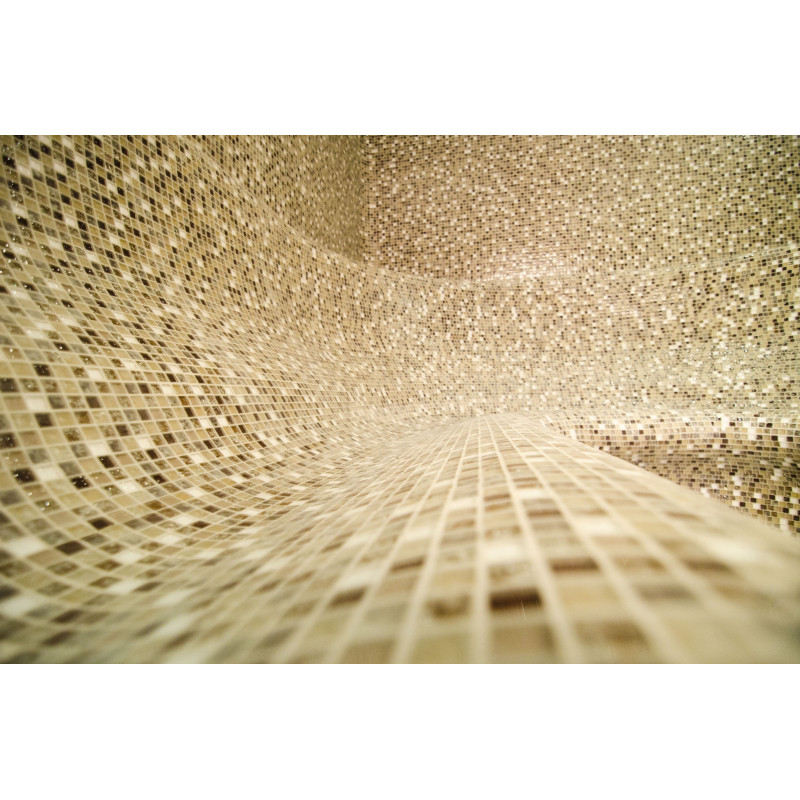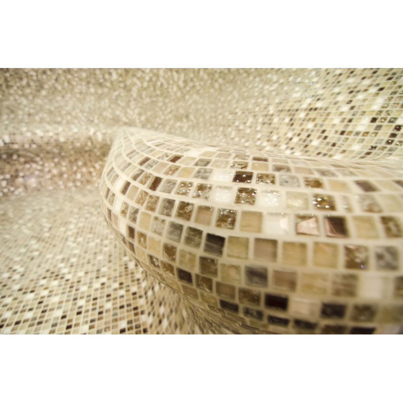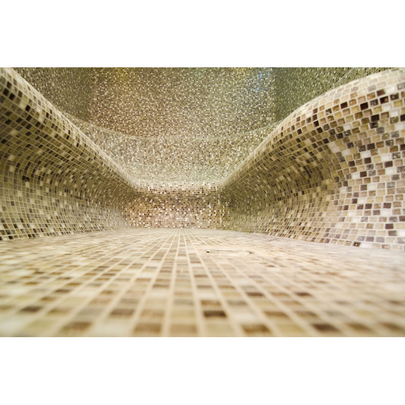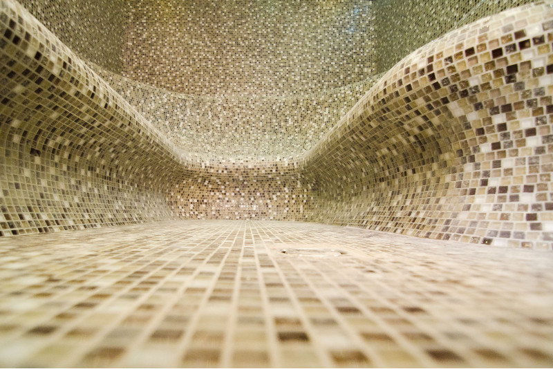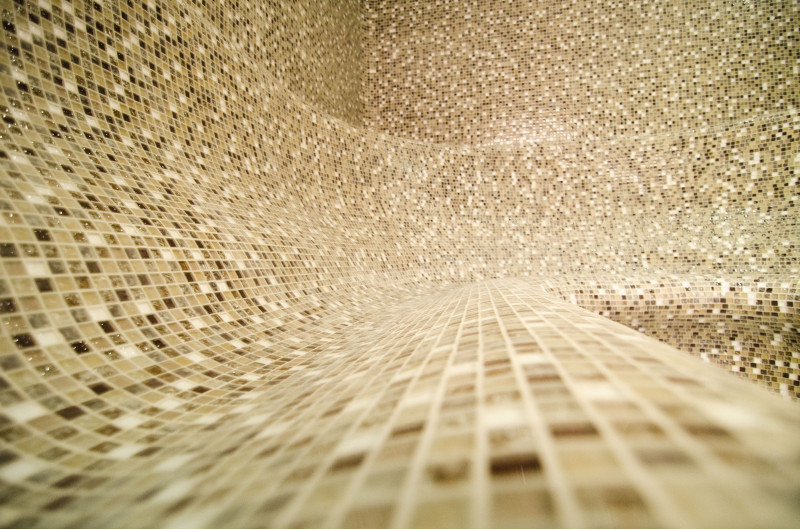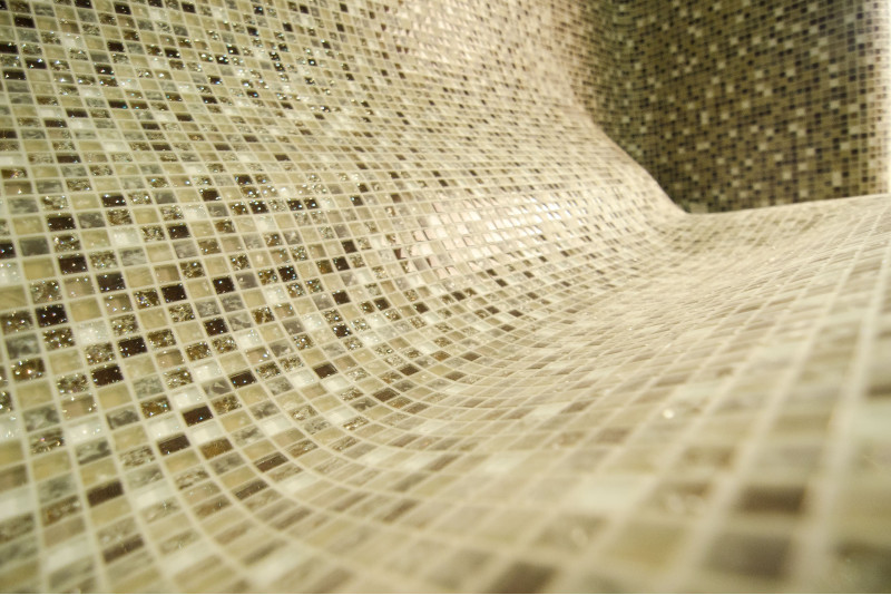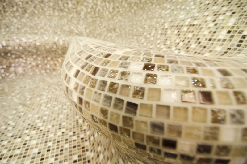 Efterbehandling - vægge, bænke, gulve dekoreret med lille mosaik, naturlige farvefliser.