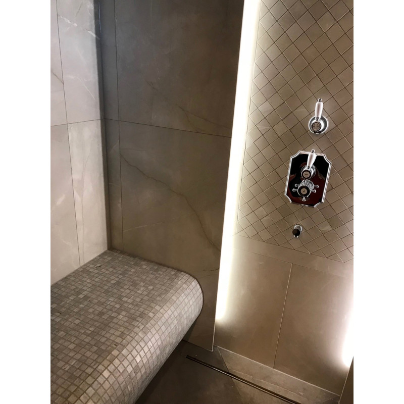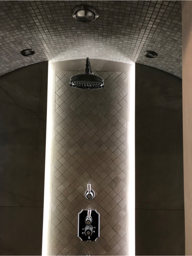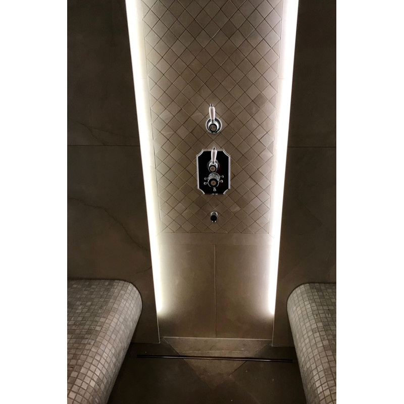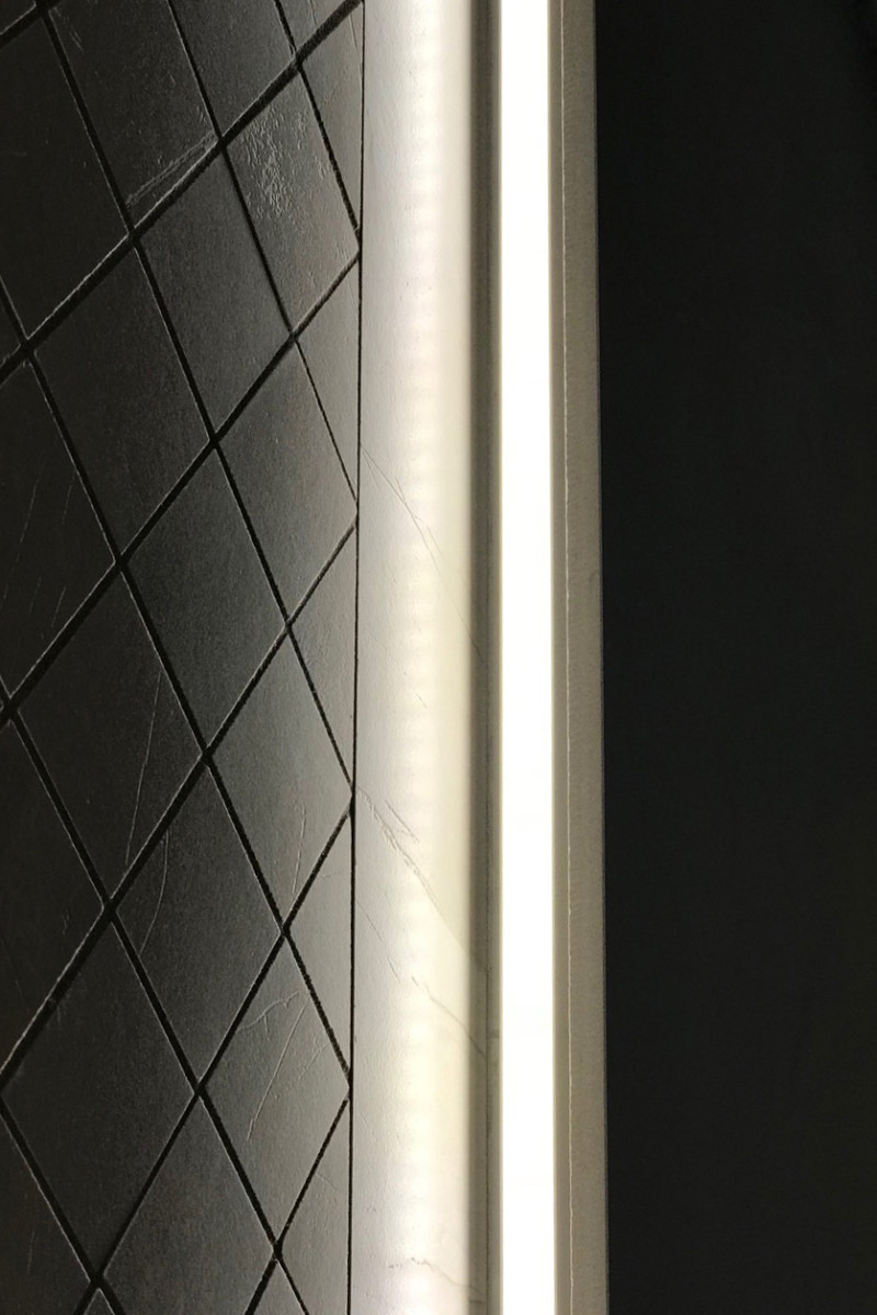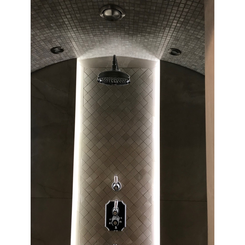 Indbygget LED strip under liggestolene, på væggene og fire lysekroner i loftet.