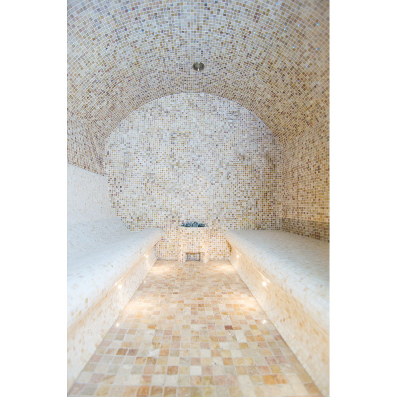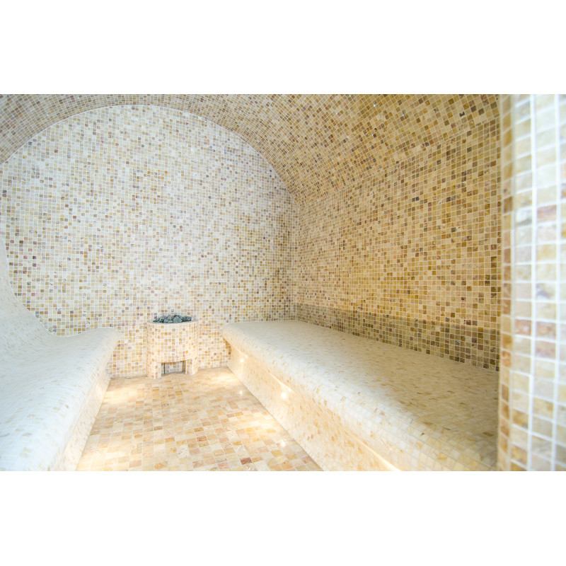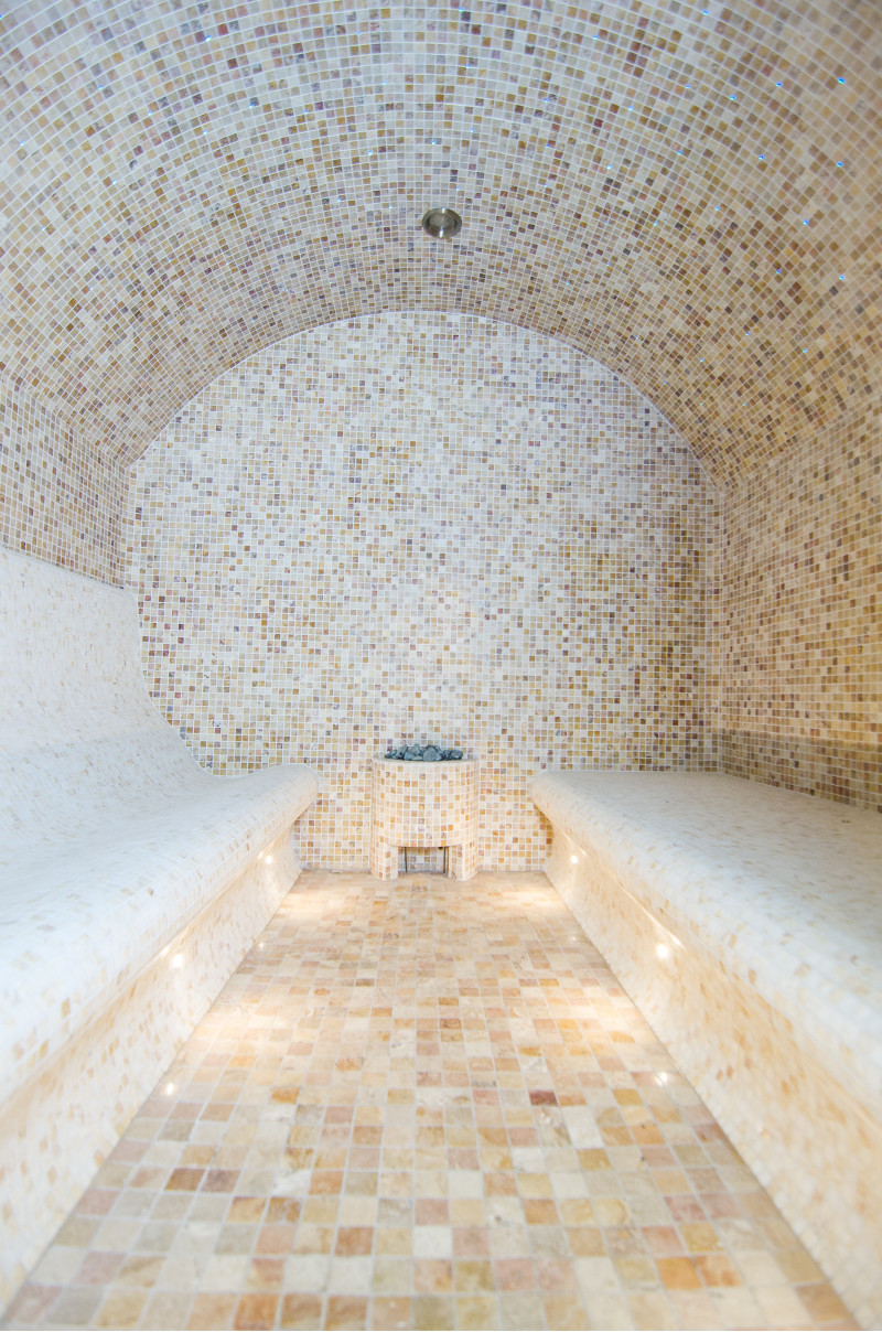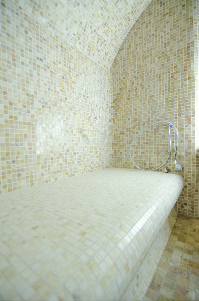 Efterbehandling - hele saunarummet og bænke er dekoreret med mosaikfliser.
