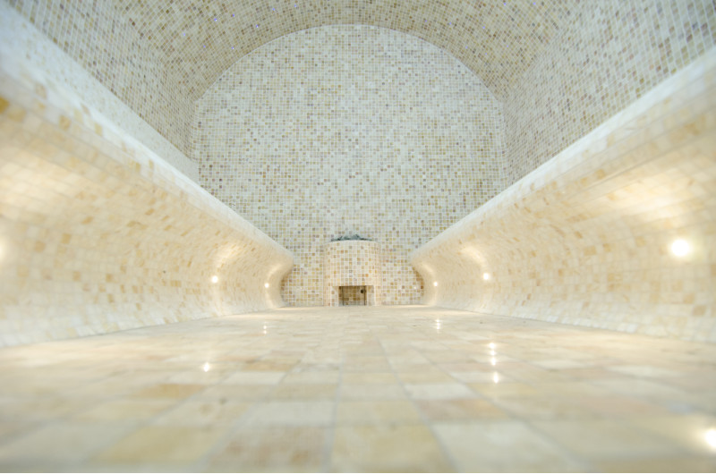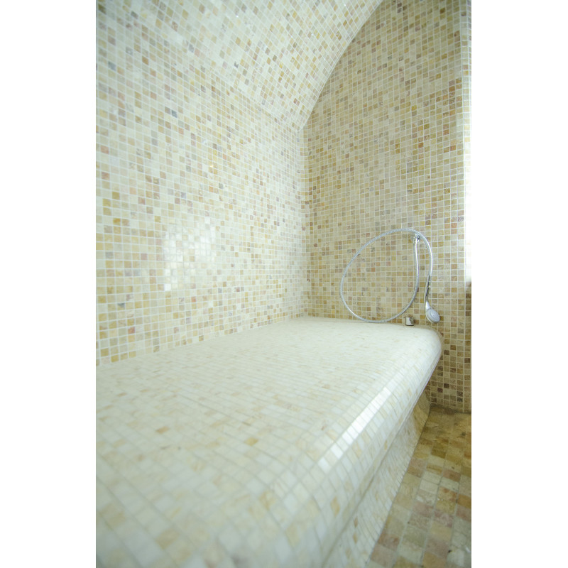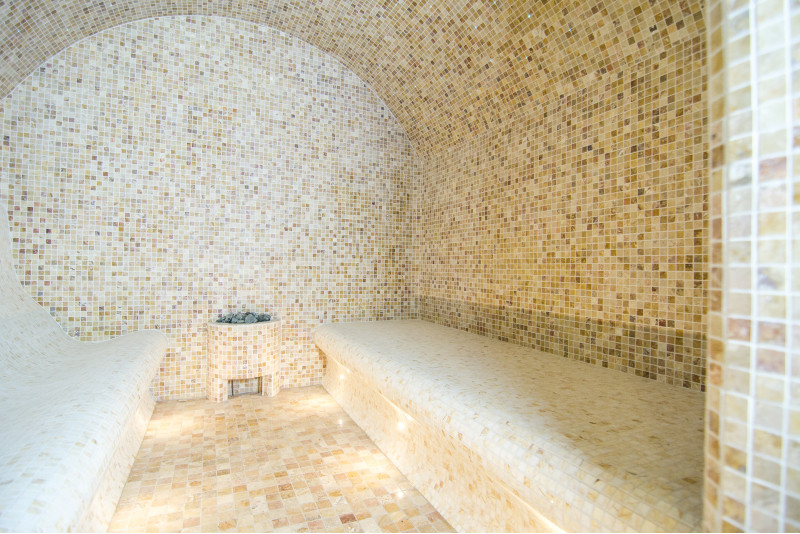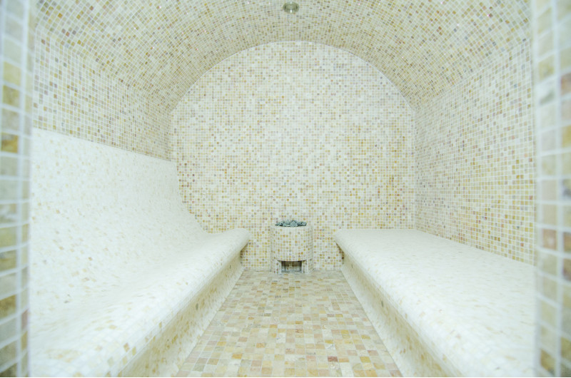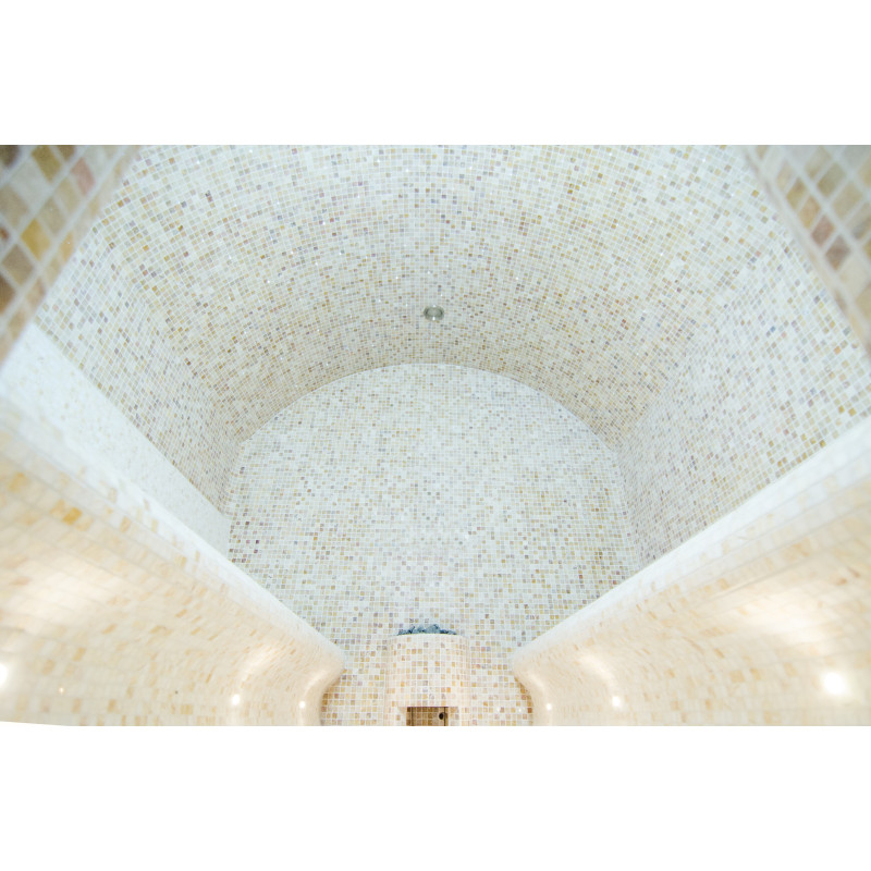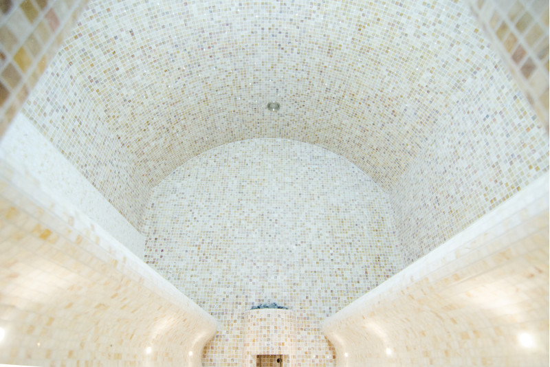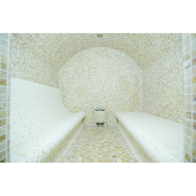 Efterbehandling - hele saunarummet og bænke er dekoreret med mosaikfliser.