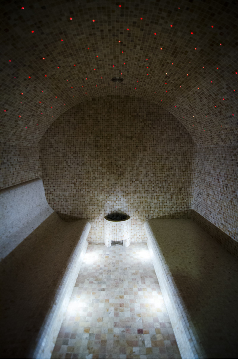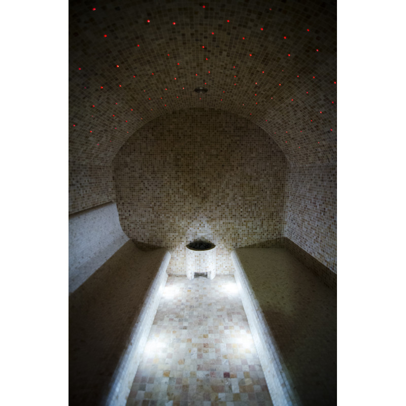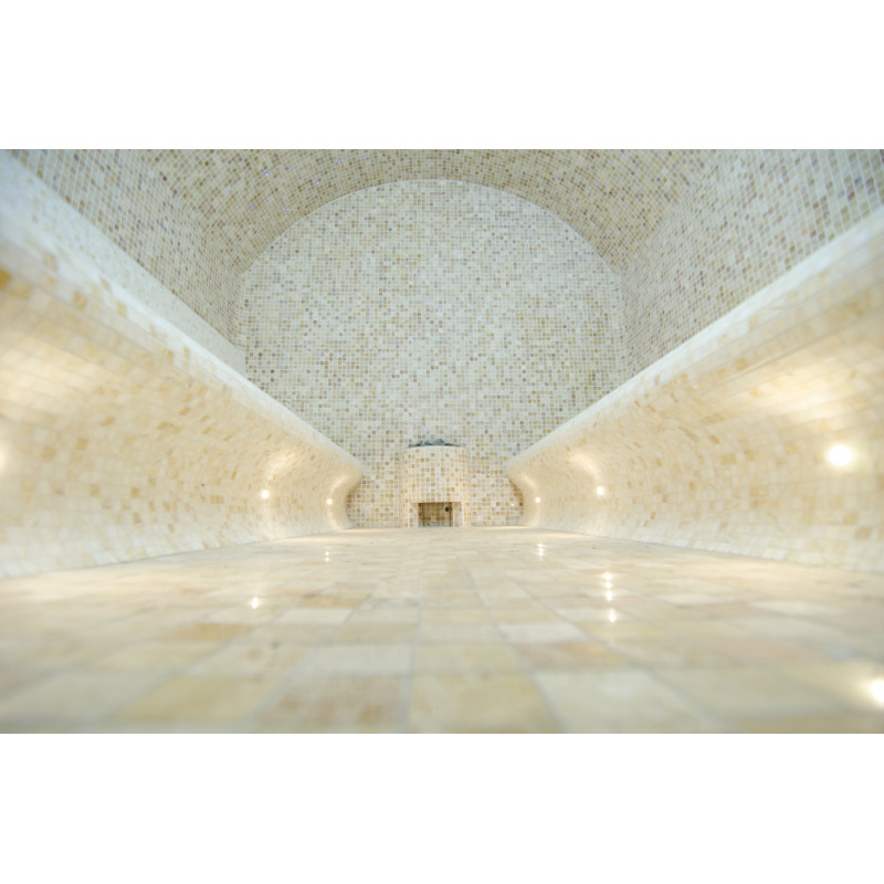 Efter kundens ønske er saunasengene designet på to måder - du kan nyde saunaen både liggende og siddende. Dampbadssenge, vægge og lofter er lavet individuelt af speciel ekstruderet polystyren. Bænkene til at sidde er placeret i højre side og i venstre side er bænke til at nyde saunaen, mens du ligger. Buede lofter forhindrer kondensering af damp i at dryppe fra dem.