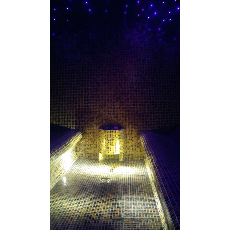 Fiberoptisk belysningssystem til loftet - "stjernehimmel". Fiberoptisk belysning er en langtidsholdbar, alsidig, økonomisk og enkel løsning. Takket være det kan du udtrække de mest imponerende belysningsmuligheder. Under bænkene - belysning tilpasset til dampsaunaen for at oplyse gulvet.