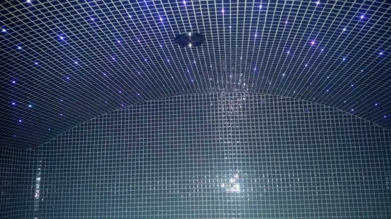 Fiberoptisk belysningssystem - stjerneklar, farvet himmel. Farven på denne belysning kan ændres. Under bænkene - LED-belysning til gulvbelysning, styret af en smart enhed online.