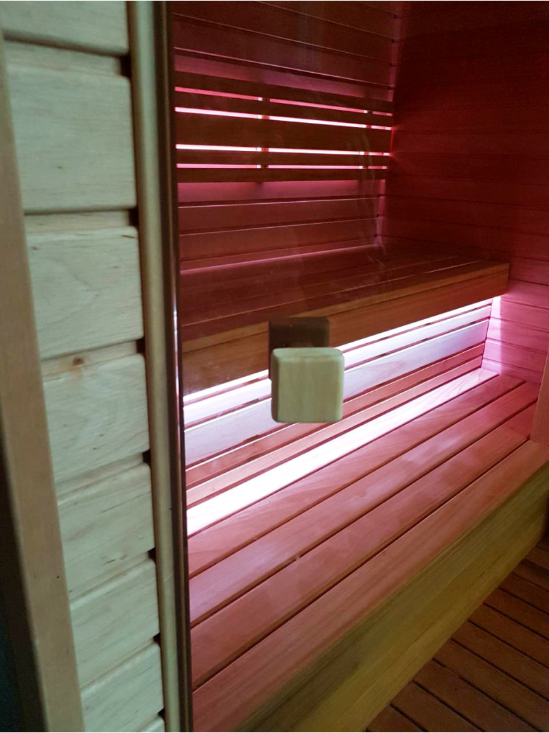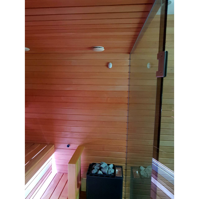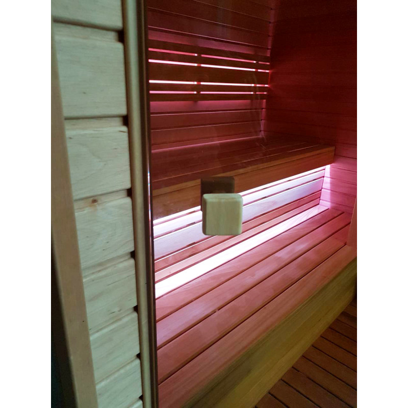 Saunabelysning er en meget vigtig detalje, der giver en halvt afslappende effekt i saunaen. Under bænke og ryglæn er der LED RGB farvebelysning, som du kan skifte farve, når du vil. Saunaen er desuden udstyret med et fiberoptisk hvidt lyssystem "Moon".