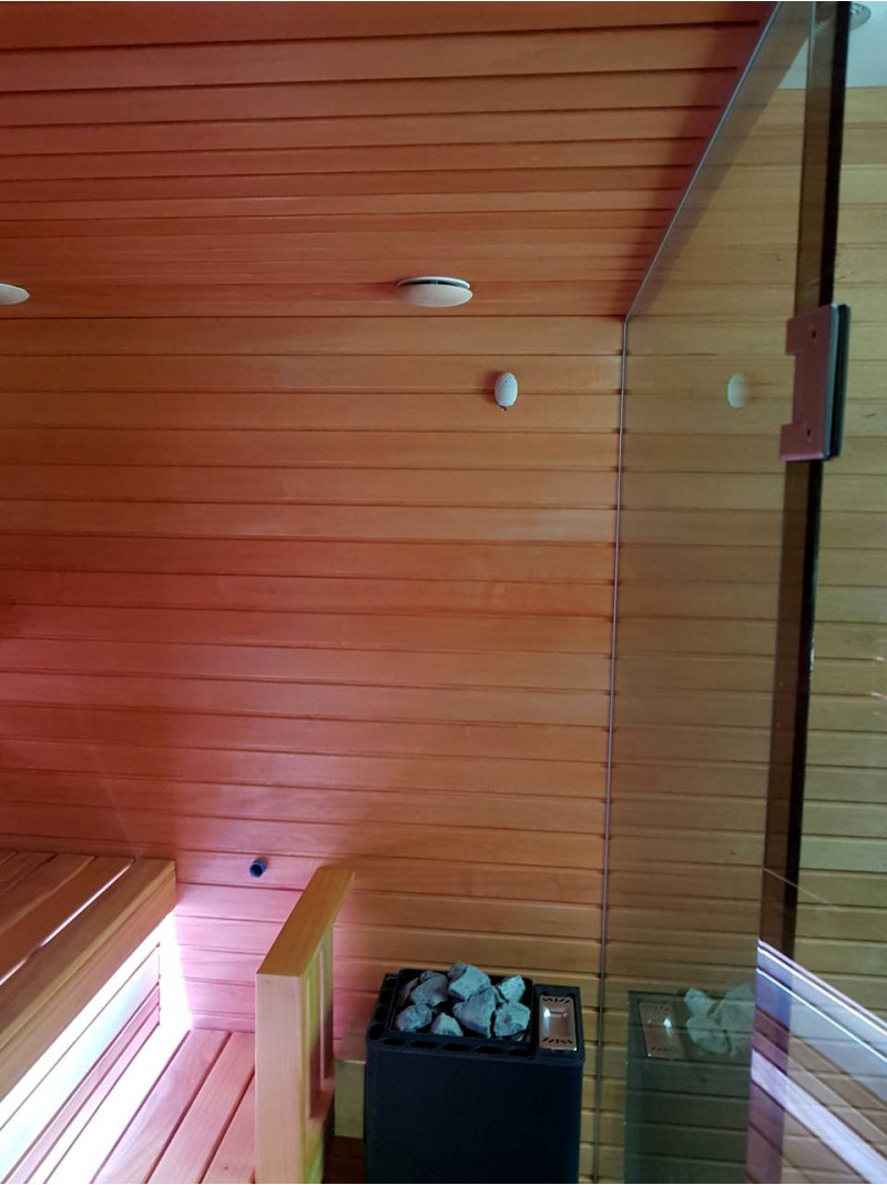 Saunaen er udstyret med højttalere, så du kan lytte til din yndlingsmusik, mens du nyder saunaen.