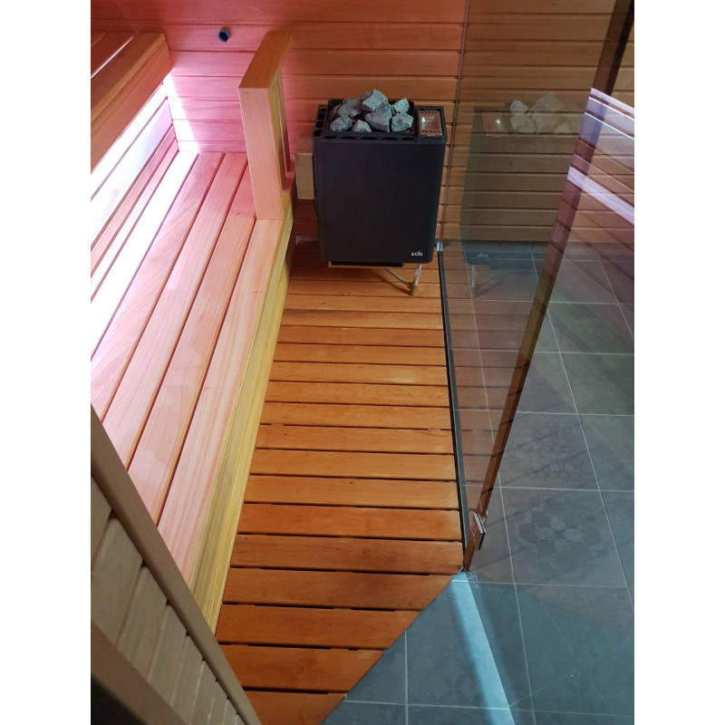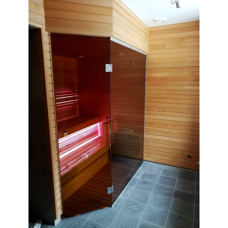 I stedet for traditionelle døre og vægge har denne kombinerede sauna et moderne udseende udstillingsvindue lavet af hærdet tonet glas. Sådan et udstillingsvindue er moderne og giver rumfornemmelse.