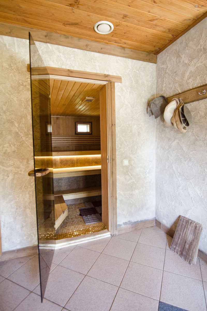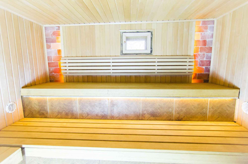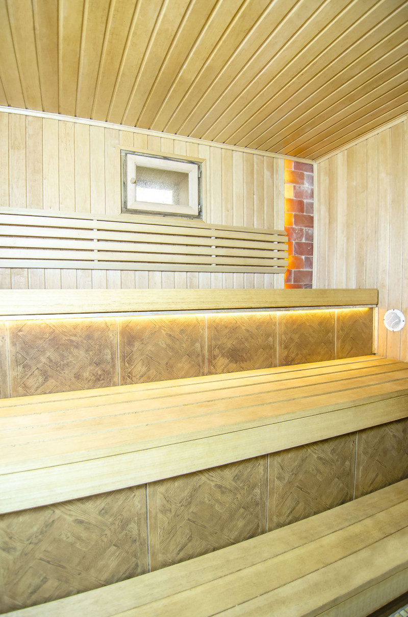Til vægge og lofter blev der valgt bred sort elbeklædning. Bænkene var lavet af højkvalitets ikke-varmende abachi træ, så det er rart at sidde eller ligge på sådanne bænke uden at brænde huden. LED-belysning er installeret under bænkene.