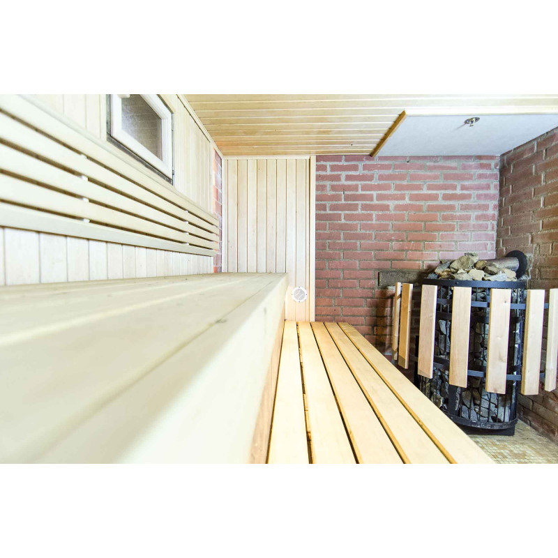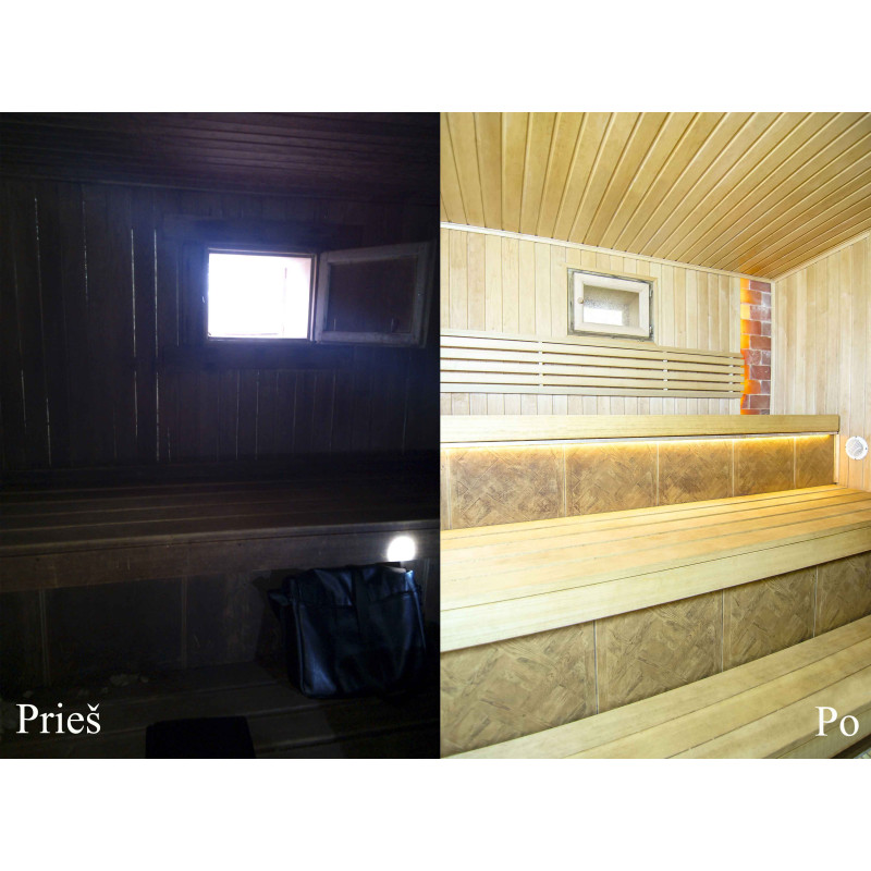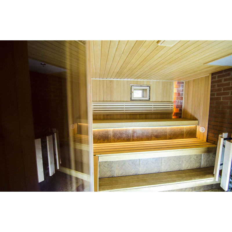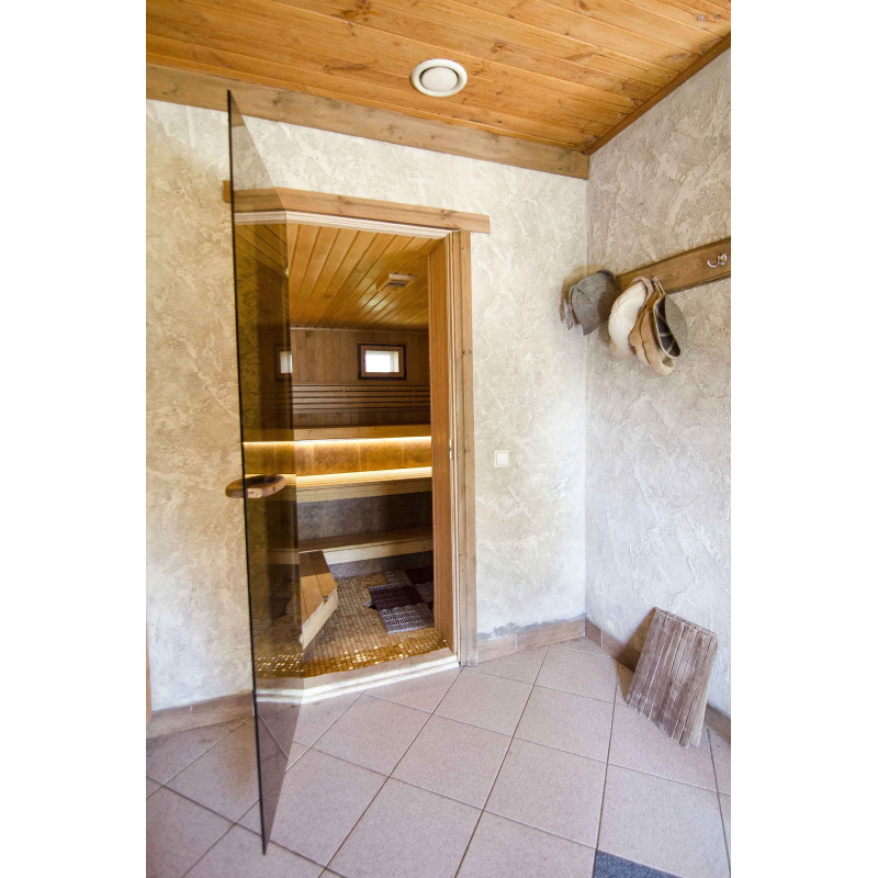 Udskiftet vindue - træramme, hærdet glas. Slidte saunadøre er skiftet ud med nye - specielt designet til saunaer med hærdet glas og træramme. Dette glas er varmebehandlet, 5 gange stærkere end normalt. Rammen er lavet af specielt forberedt træ for at forhindre deformation af rammen på grund af svingende temperaturer.
