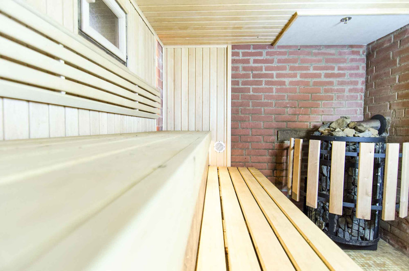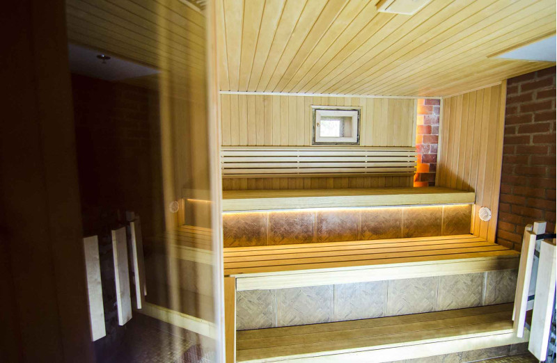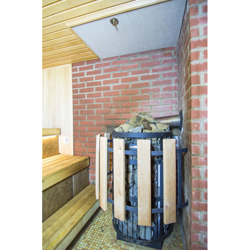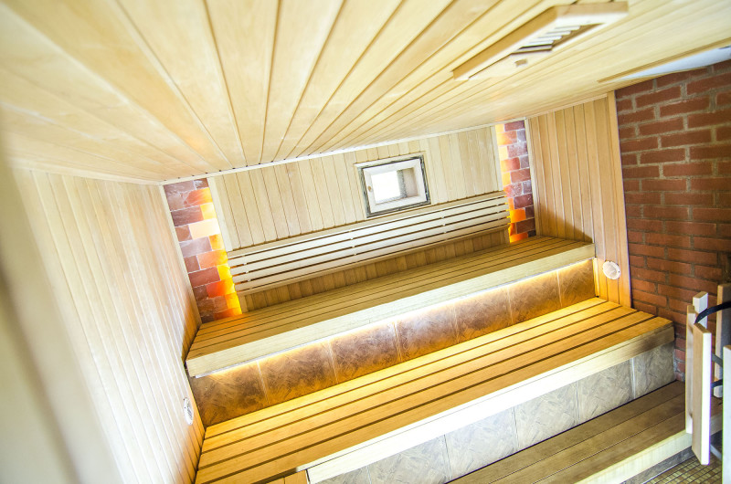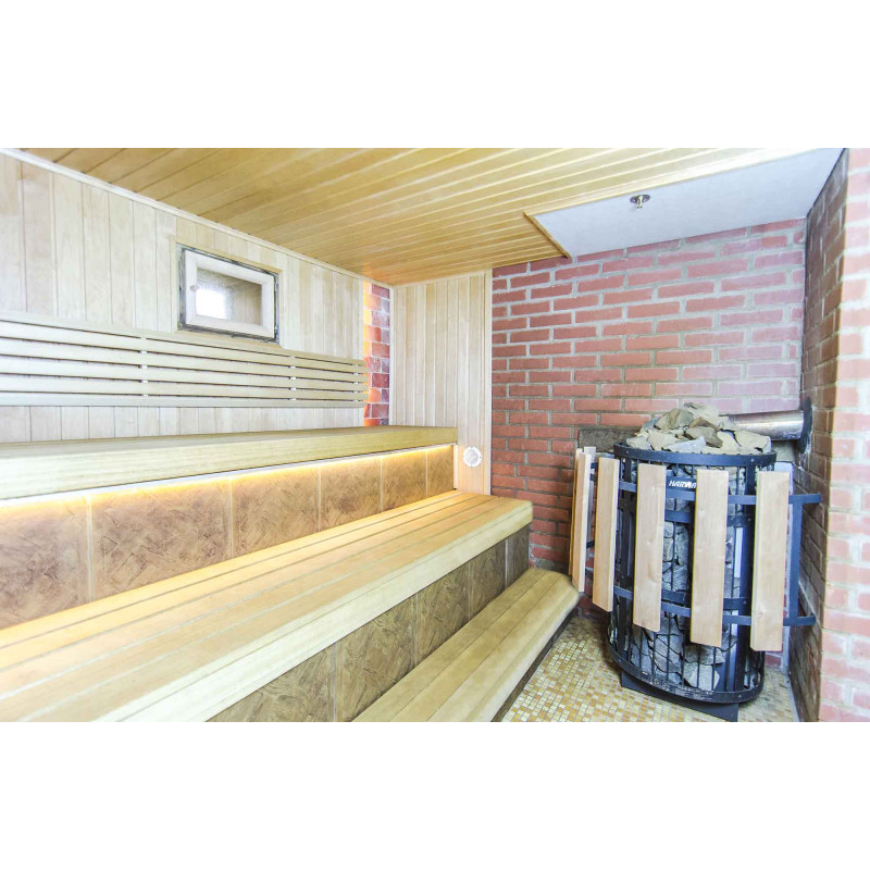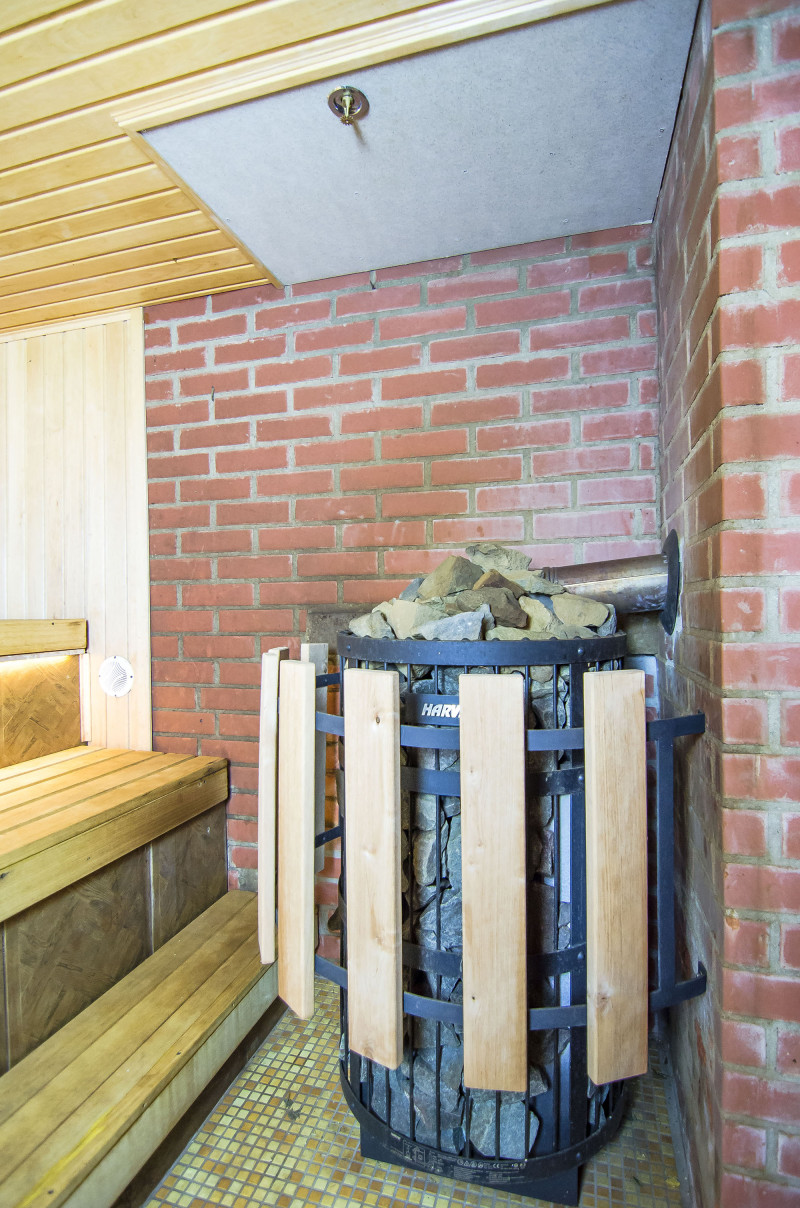 Saunavarmeudstyr blev skiftet. Det håndlavede varmelegeme er blevet omdannet til en brændebrændende Harvia Legend 300 Duo med et eksternt brændkammer, der rummer en stor mængde sten, så du kan nyde den varme, de udstråler, selv i fravær af høje temperaturer. Loftet er udstyret med et brandsikringssystem - plade Minerit Sauna, sprinkler. En beskyttende kant af træ og metal er installeret rundt om varmeren.