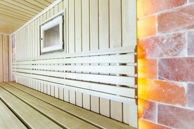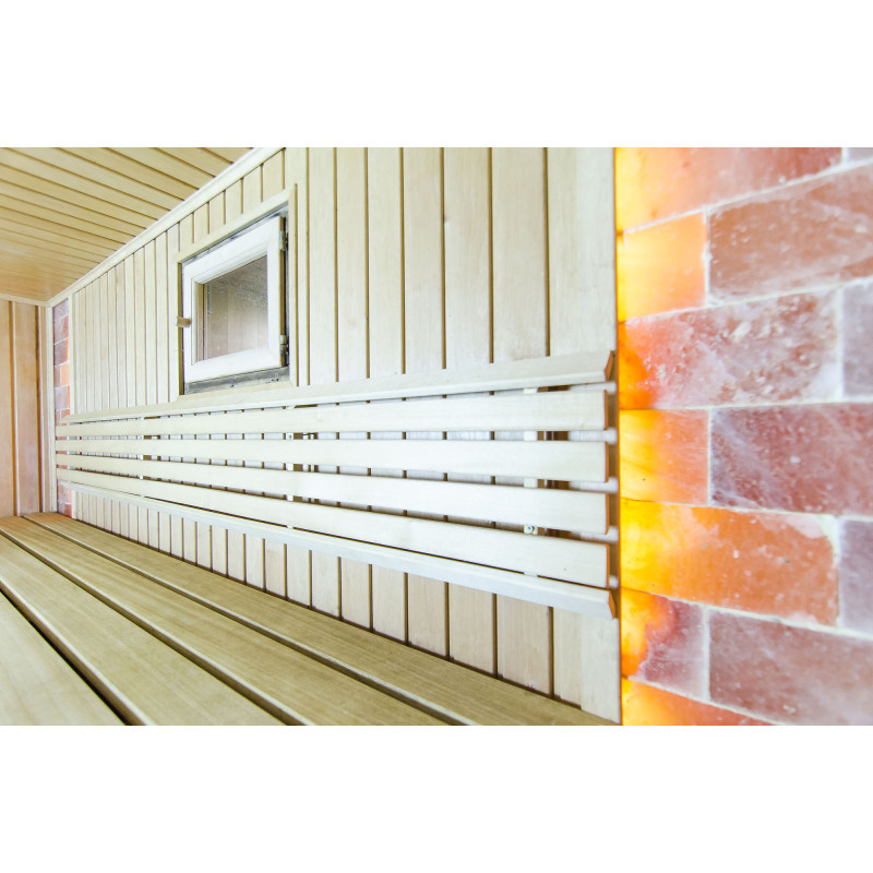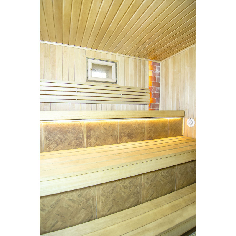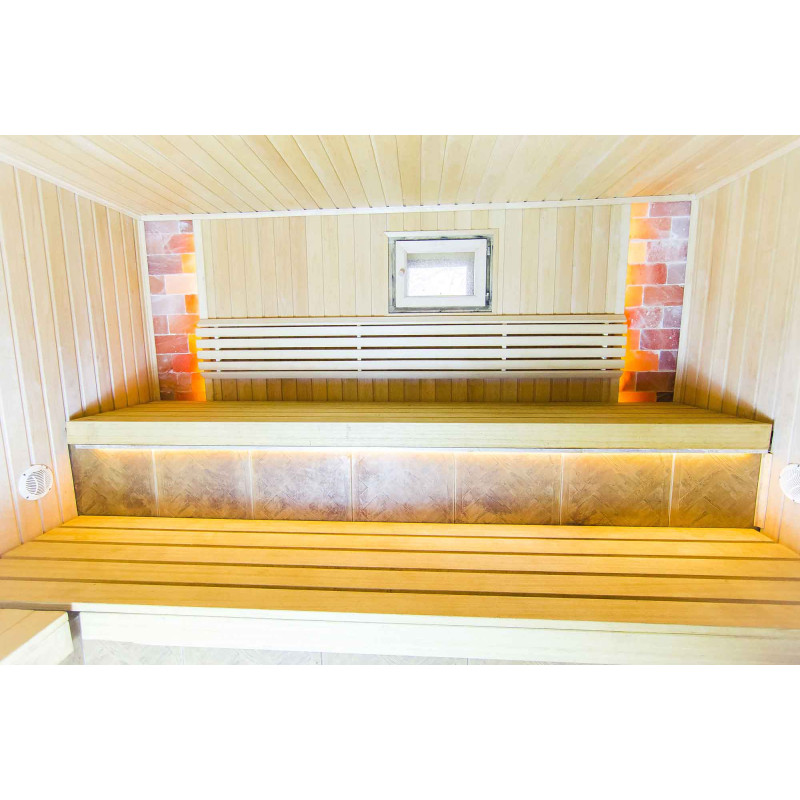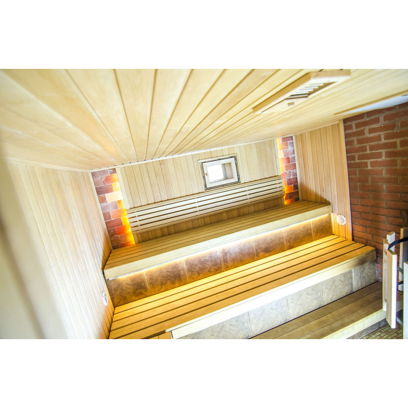 Et fremragende dekorativt element blev valgt til udsmykningen af saunaen - Himalaya saltblokke. Himalayasalt ser ikke kun godt ud, men forbedrer også indendørs luftkvalitet, reducerer symptomerne på allergi og astma, løfter humøret og giver energi, neutraliserer elektromagnetisk stråling, reducerer statisk elektricitet i luften. Den indbyggede LED-belysning bag saltblokkene skaber et endnu mere hyggeligt miljø i saunaen og fremhæver Himalayas saltblokkens udseende.