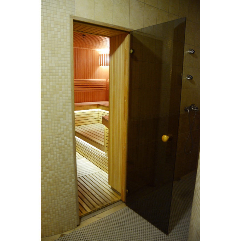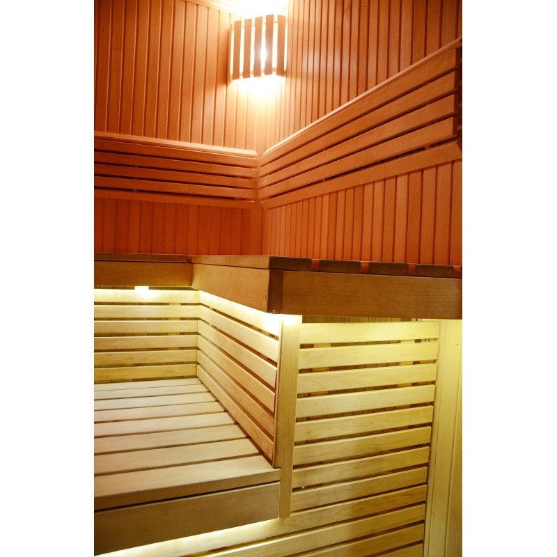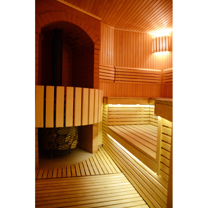 Saunaens vægge og bænke er lavet af lindetræ af højeste kvalitet, som er kendetegnet ved sin lyse, smukke farve og udstråler en behagelig naturlig aroma. Armaturdæksler, ryglæn og et originalt beskyttelseshegn rundt om varmelegemet er også lavet af træ.