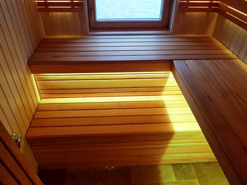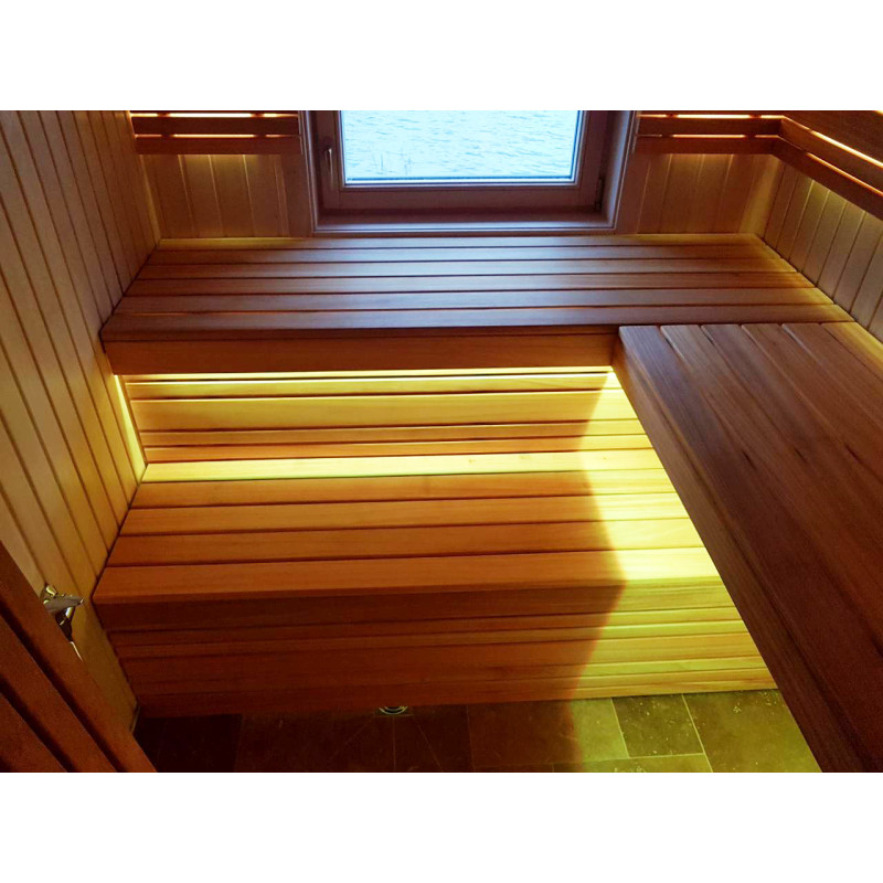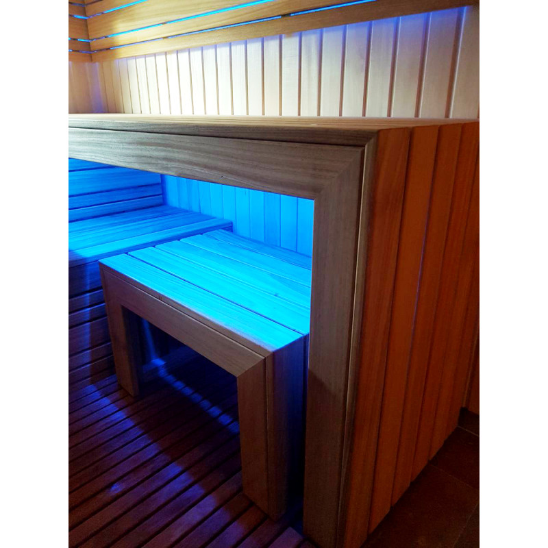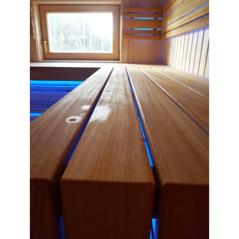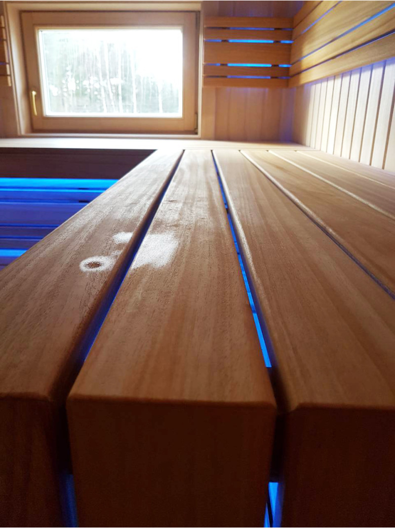 De indvendige trædetaljer og bænke i saunaen er af afrikansk abachi-træ. På grund af sin struktur er dette træ blødt og meget lavt i varme, hvilket gør det meget velegnet til montering af saunabænke.