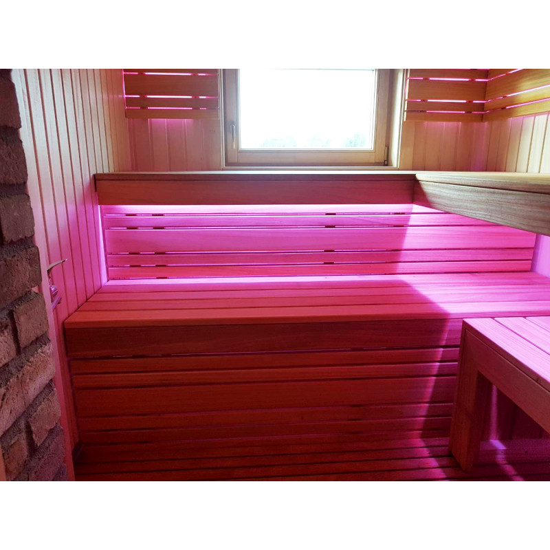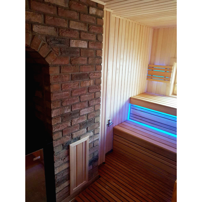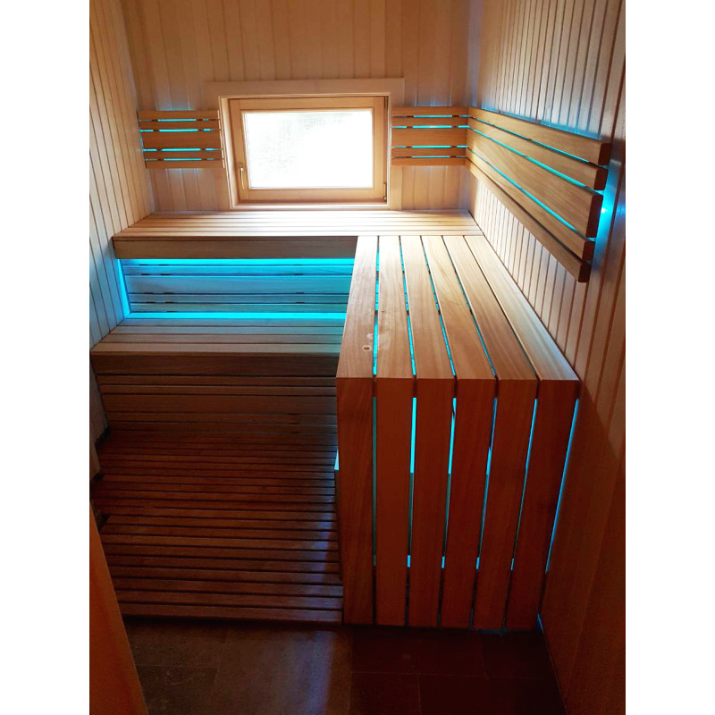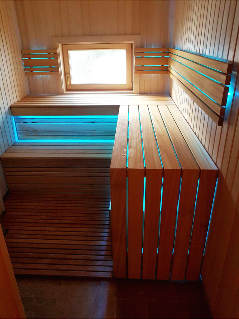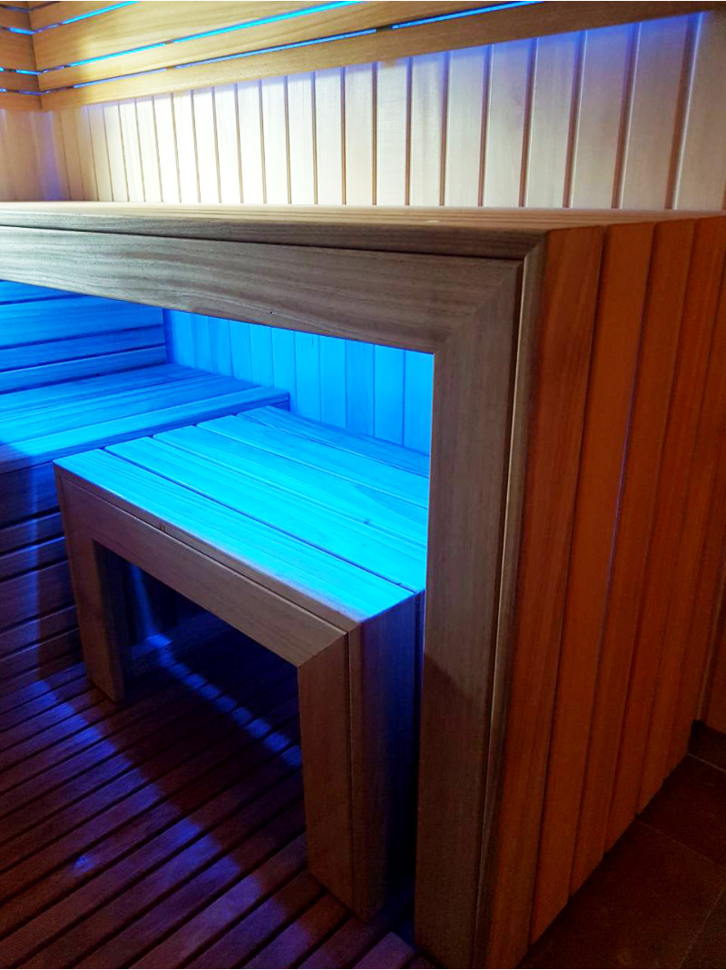 De indvendige trædetaljer og bænke i saunaen er af afrikansk abachi-træ. På grund af sin struktur er dette træ blødt og meget lavt i varme, hvilket gør det meget velegnet til montering af saunabænke.