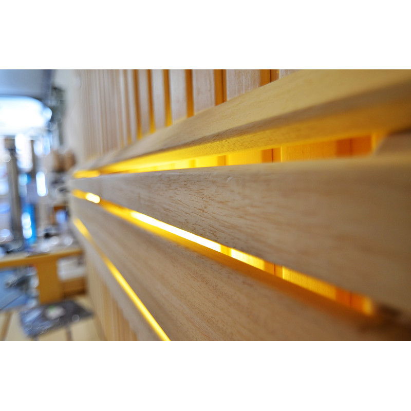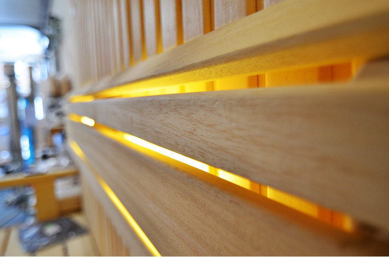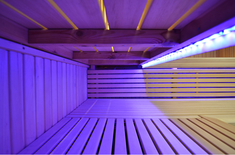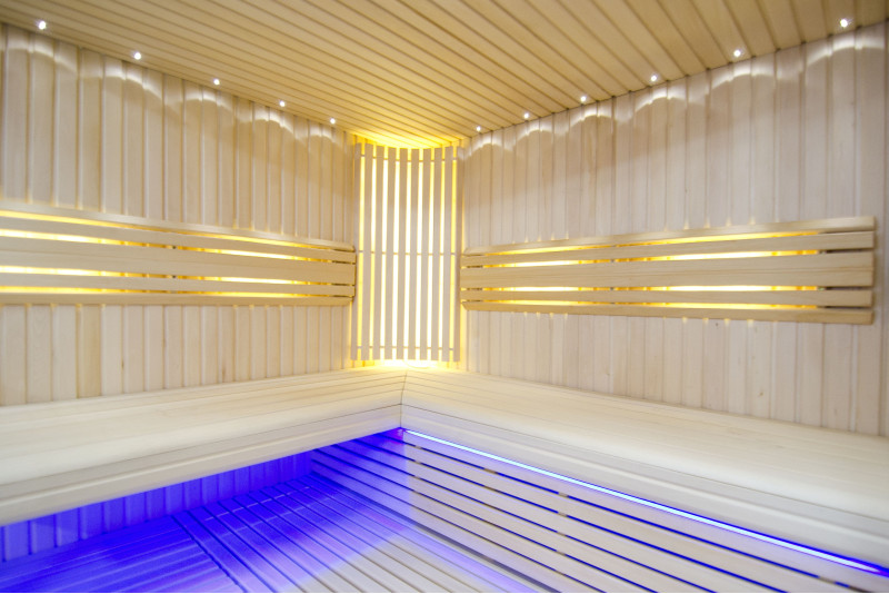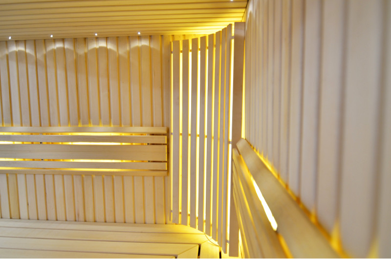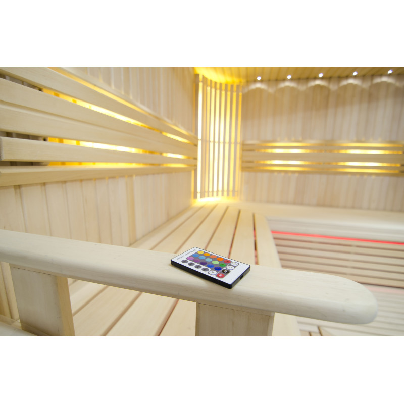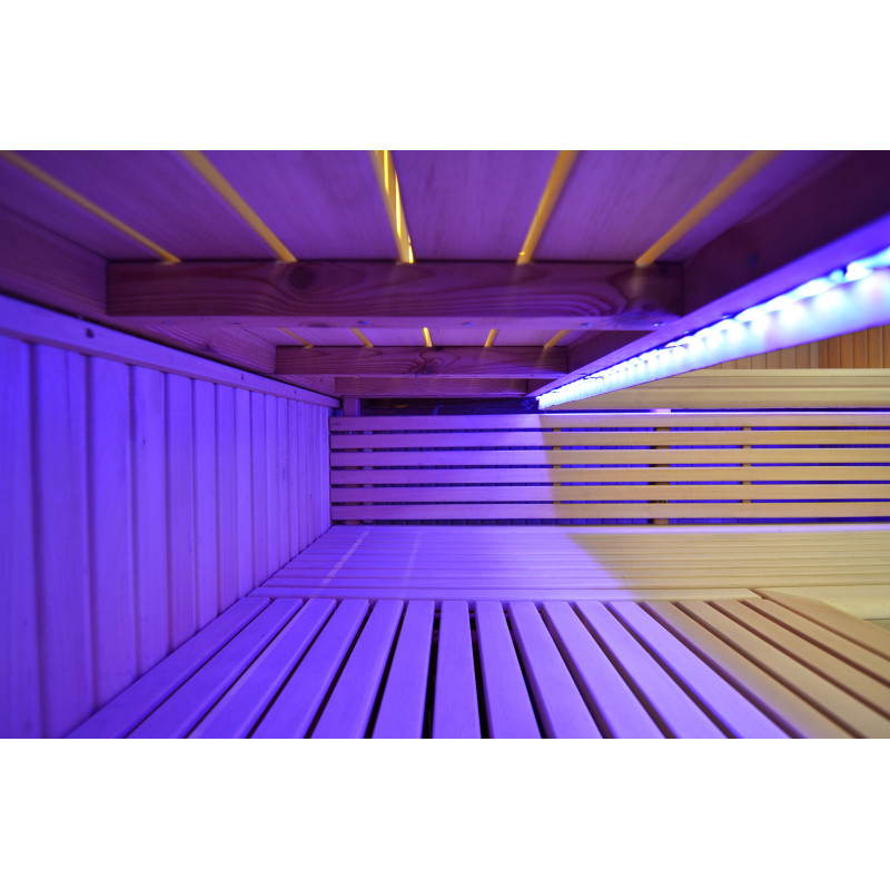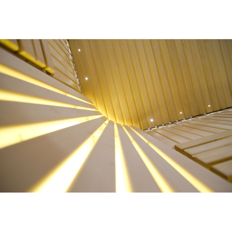 Loftet er oplyst med hvid LED-belysning "måne" - et godt alternativ til fiberoptisk belysning. På væggene under ryglænene - LED hvid varm belysning, som perfekt fremhæver træets tekstur. Under bænkene - LED RGB farvebelysning, hvis farver du nemt kan styre med fjernbetjeningen for at skabe den ønskede atmosfære i saunaen.