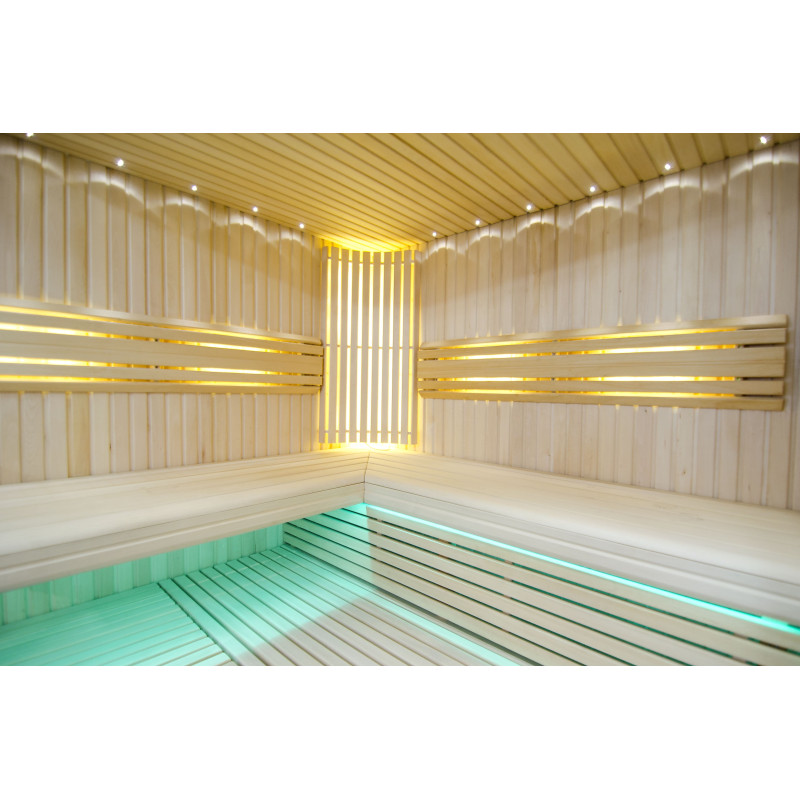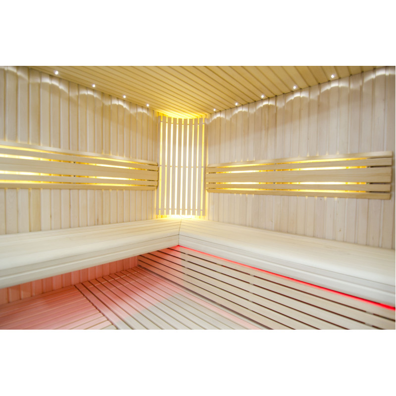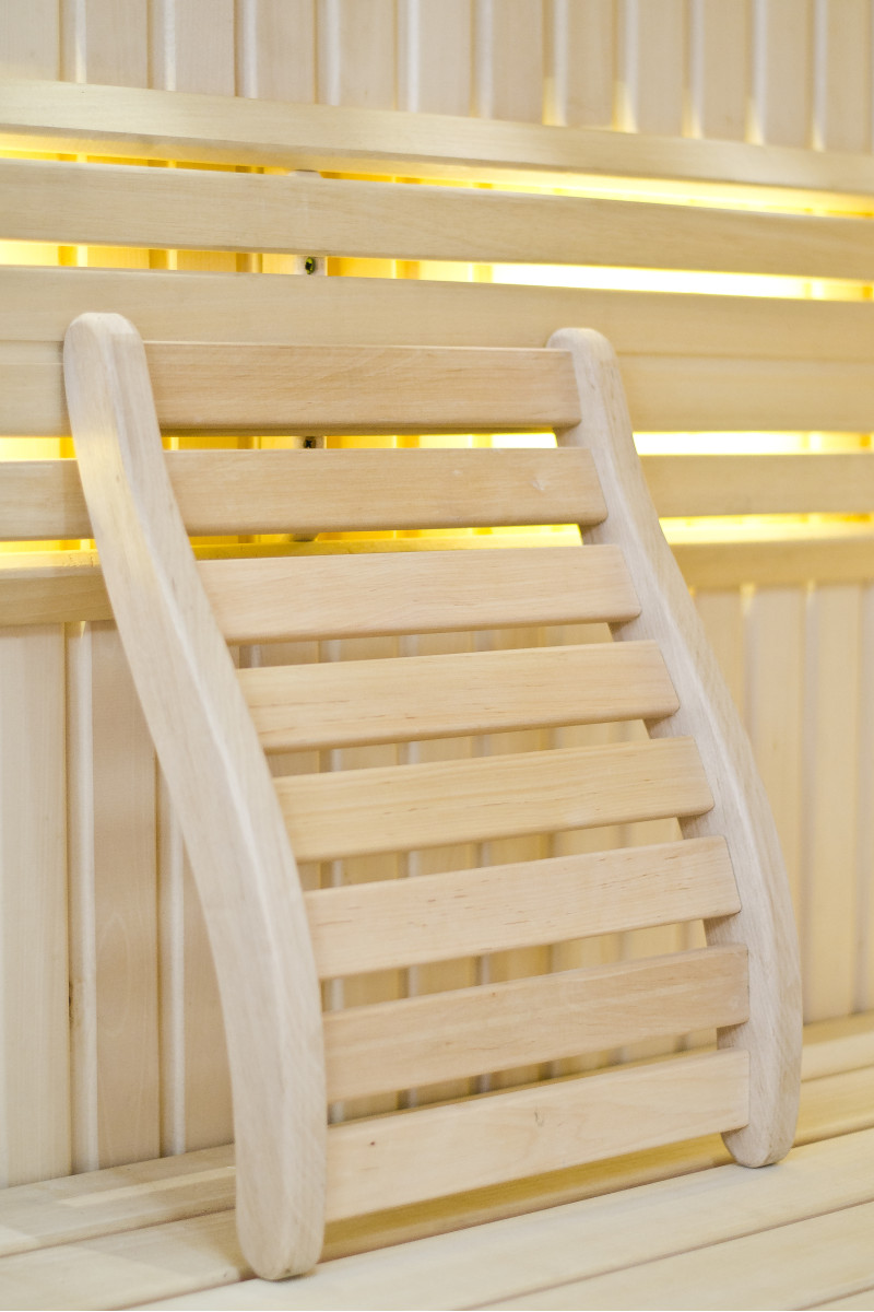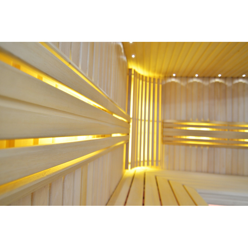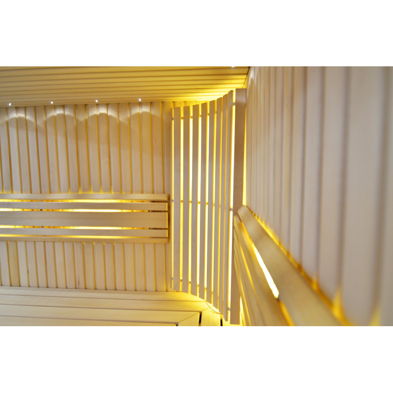 Væggene er lavet af lys lindetræ af højeste kvalitet, og bænke og ryglæn er lavet af afrikansk abachi træ, som ikke varmer meget op, hvilket gør det særligt behageligt og behageligt at sidde på.