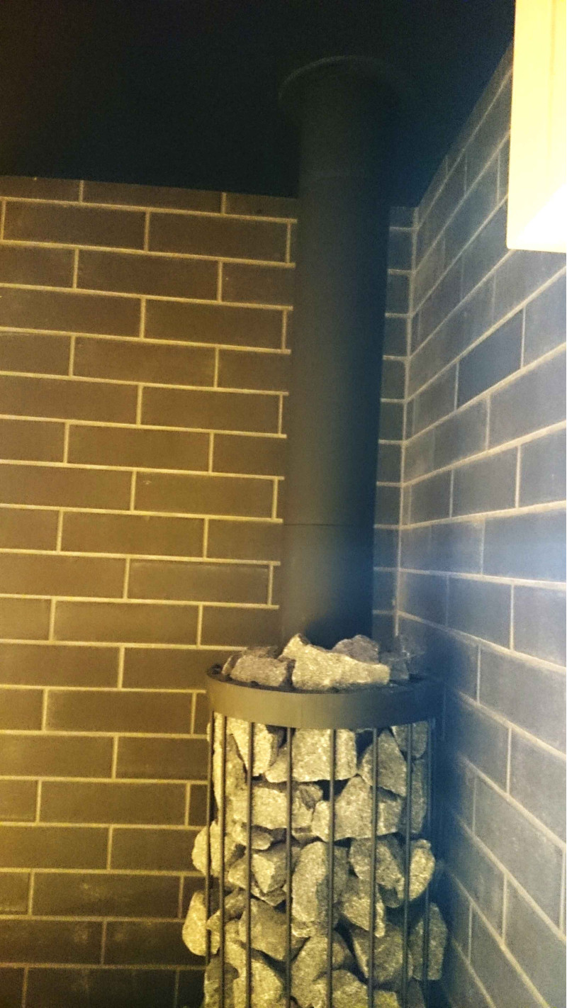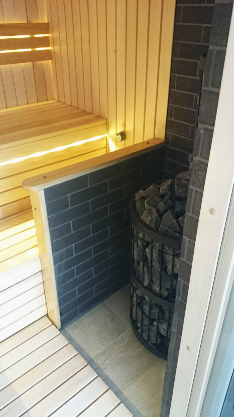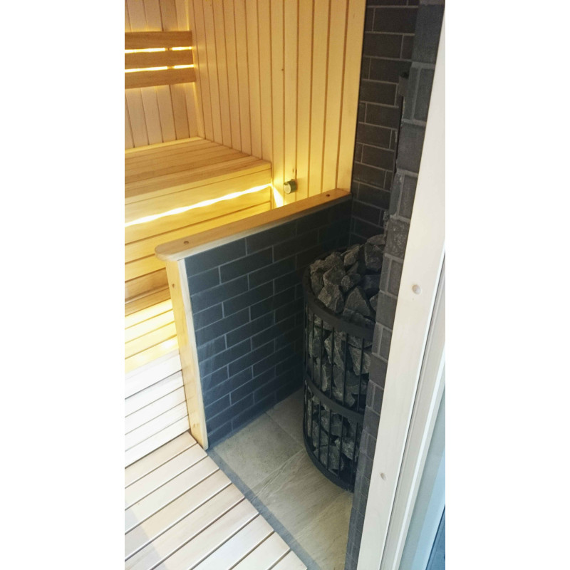 Dette saunaprojekt med en beskyttende væg til varmelegemet. Væggen er lavet af en Minerit varmebestandig plade, på en metalramme.
