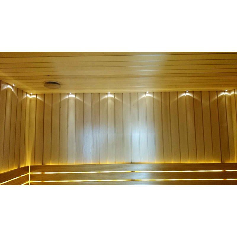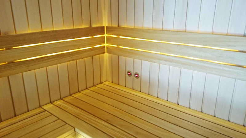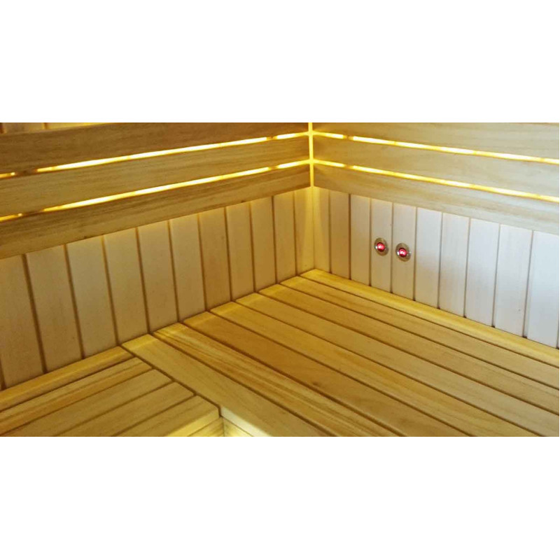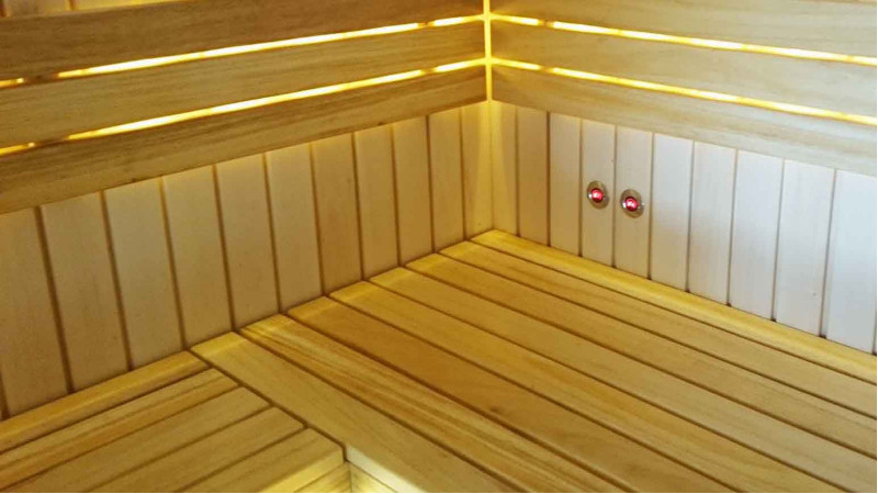 Bænkene er lavet af sort elletræ. Sort el varmer ikke op i en varm sauna, så det er umuligt at brænde i kontakt med overfladen. Af denne grund er sort el perfekt til saunabænke.