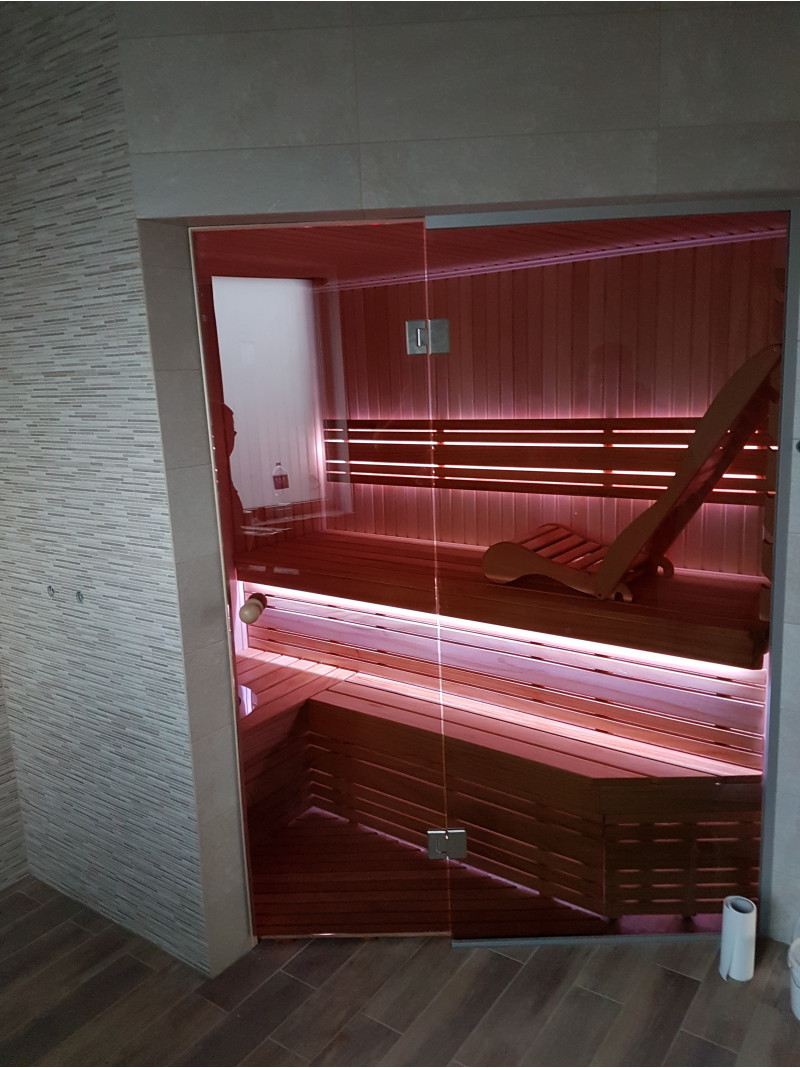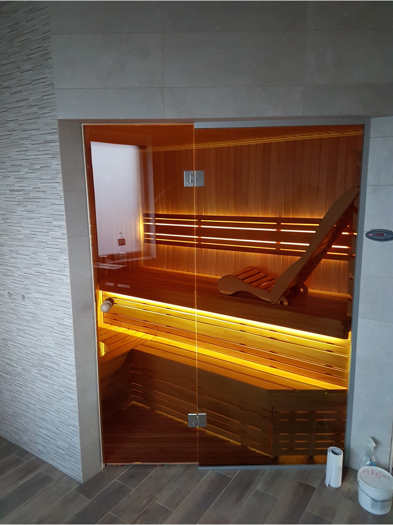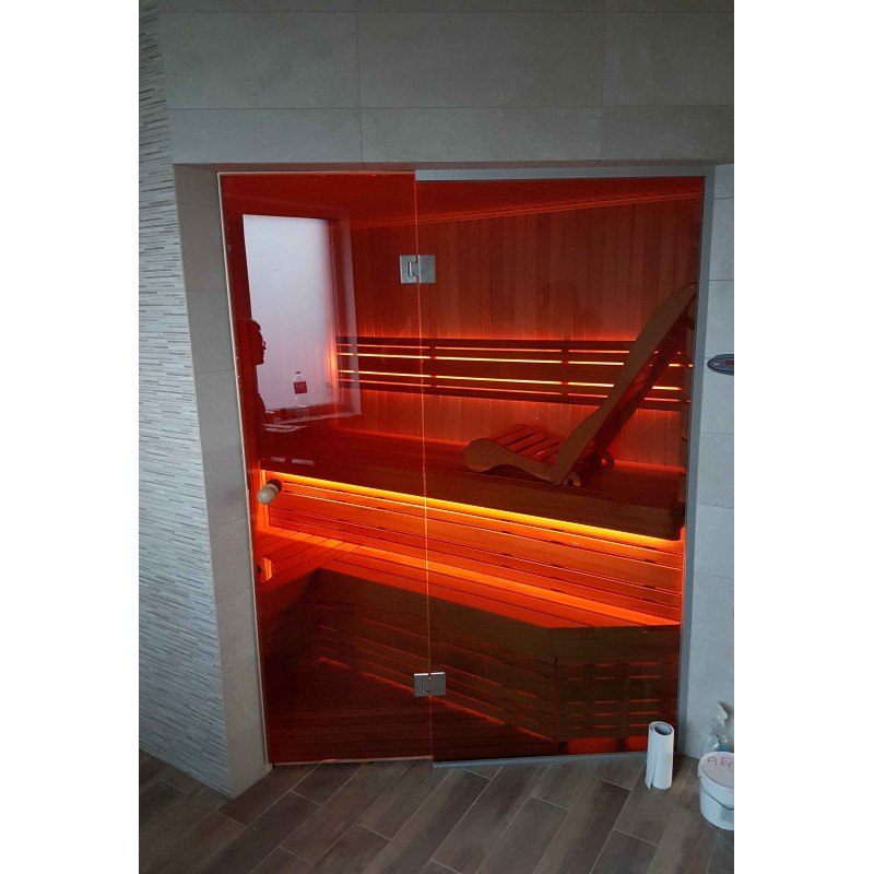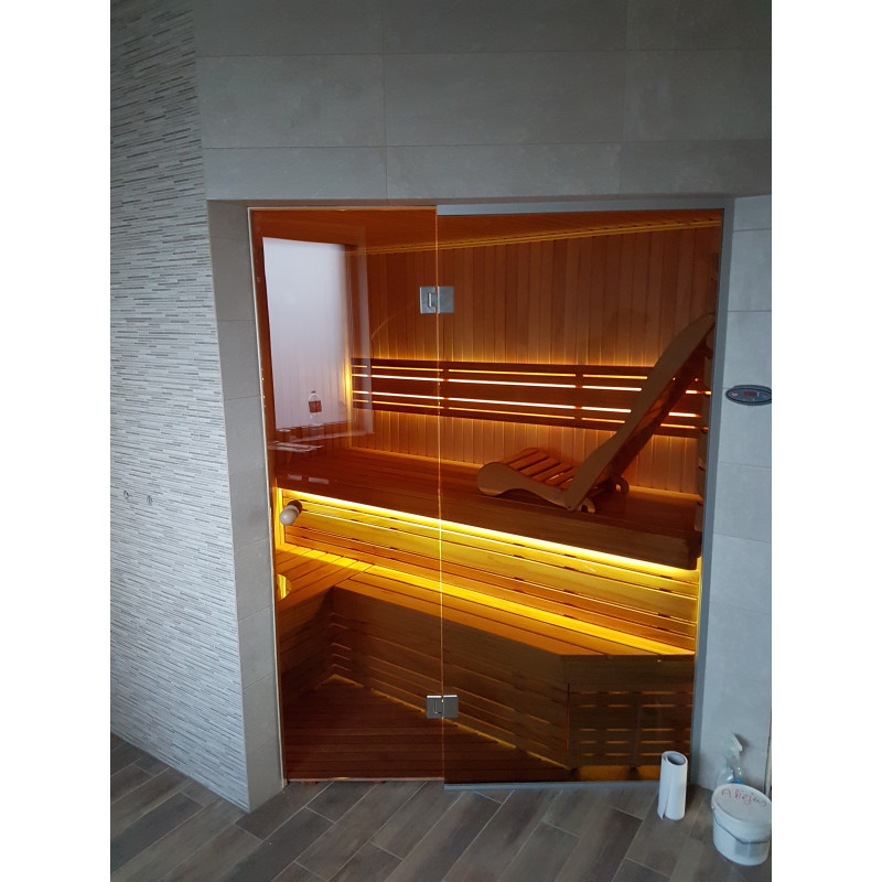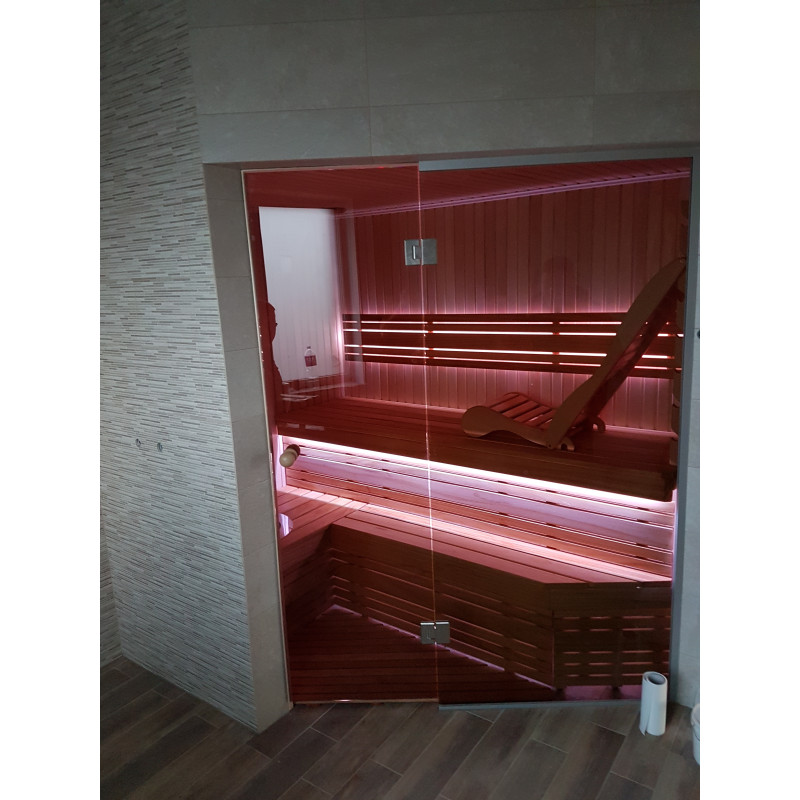 Saunadøren er en hærdet, bronze, 8 mm glasmontre med en aluminiumsramme, som er modstandsdygtig over for varme og fugt samt temperaturudsving.