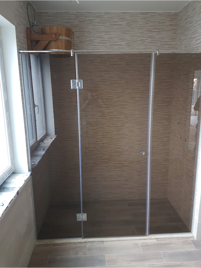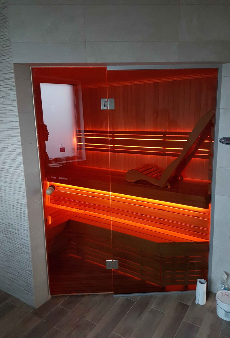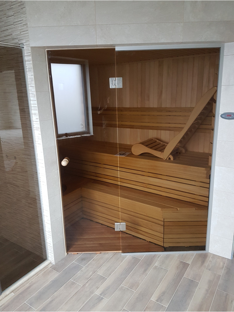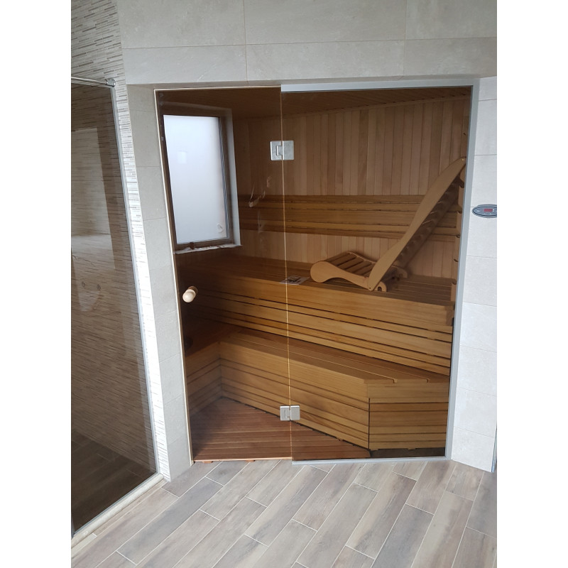 Saunadøren er en hærdet, bronze, 8 mm glasmontre med en aluminiumsramme, som er modstandsdygtig over for varme og fugt samt temperaturudsving.