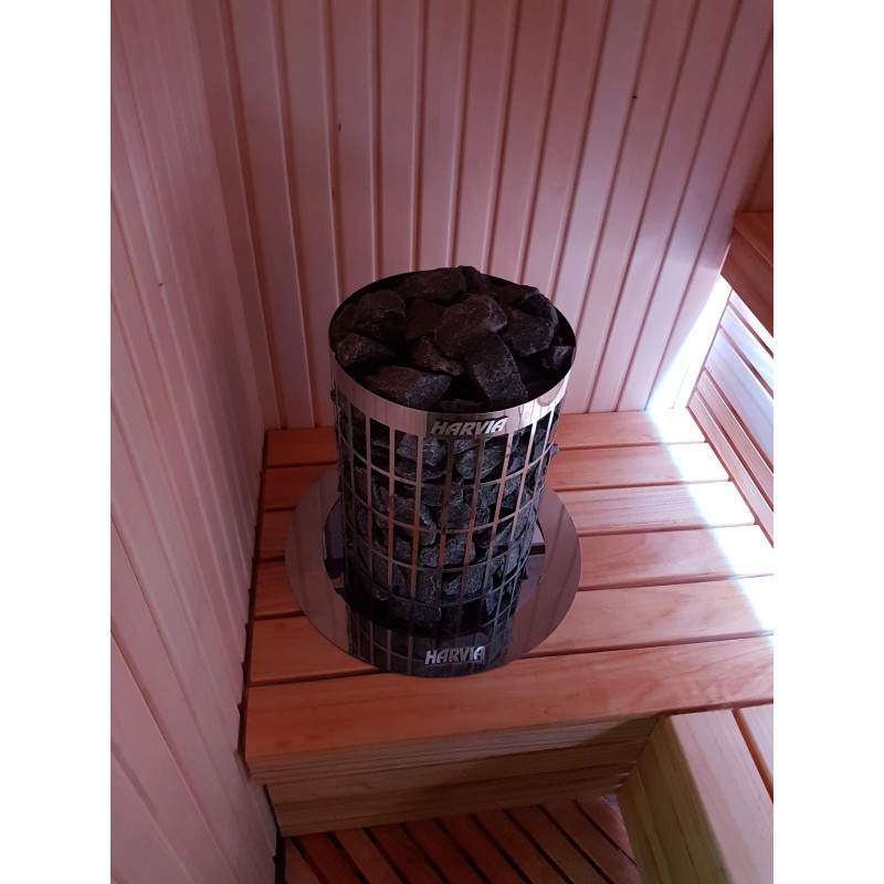 Varmelegemet med et moderne design - Harvia Cilindro med en kantring af rustfrit stål, integreret i sauna liggestolene. Holder en stor mængde sten, producerer meget let damp.