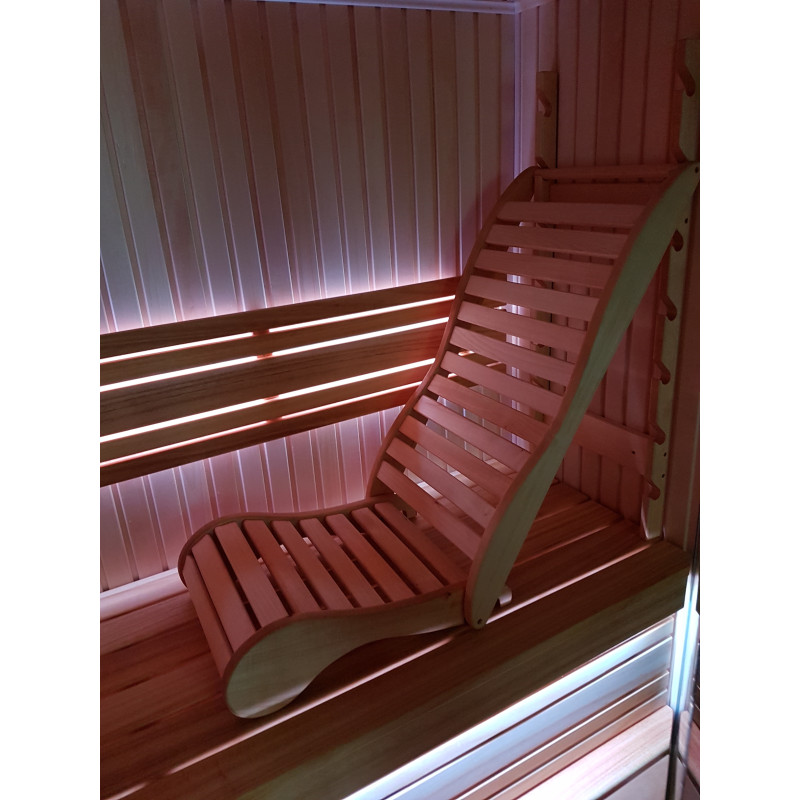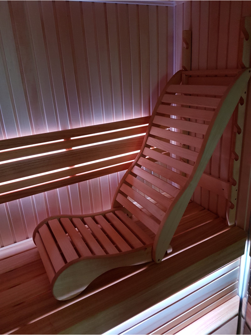 Der er en afslappende, håndlavet bænk på den øverste saunaseng for mere behageligt at sidde og slappe af i saunaen. Den mest behagelige position kan vælges, da højden og positionen af denne afslappende saunabænk kan justeres. Det elegante design tilføjer ekstra hygge til saunarummet.
