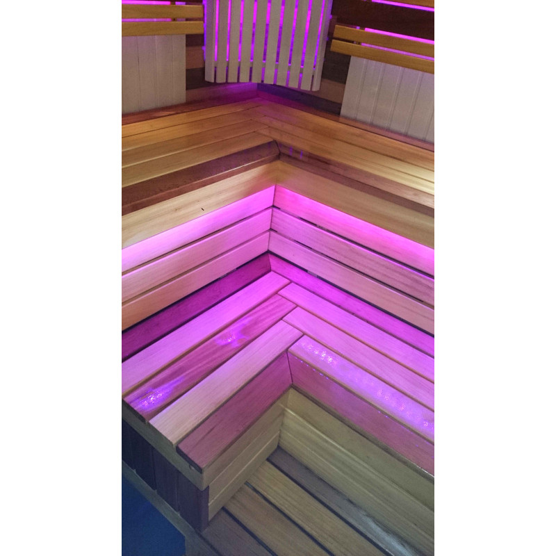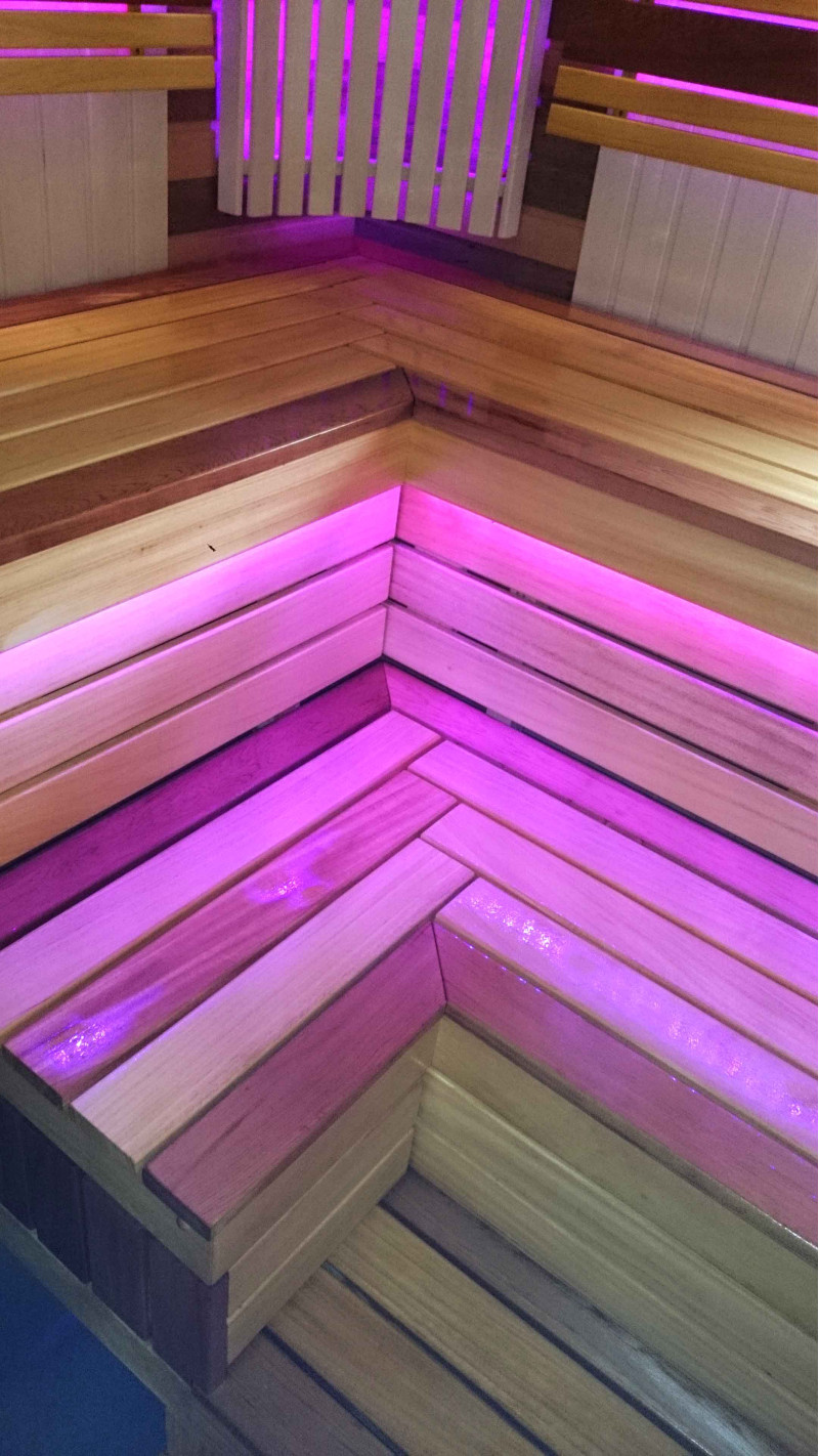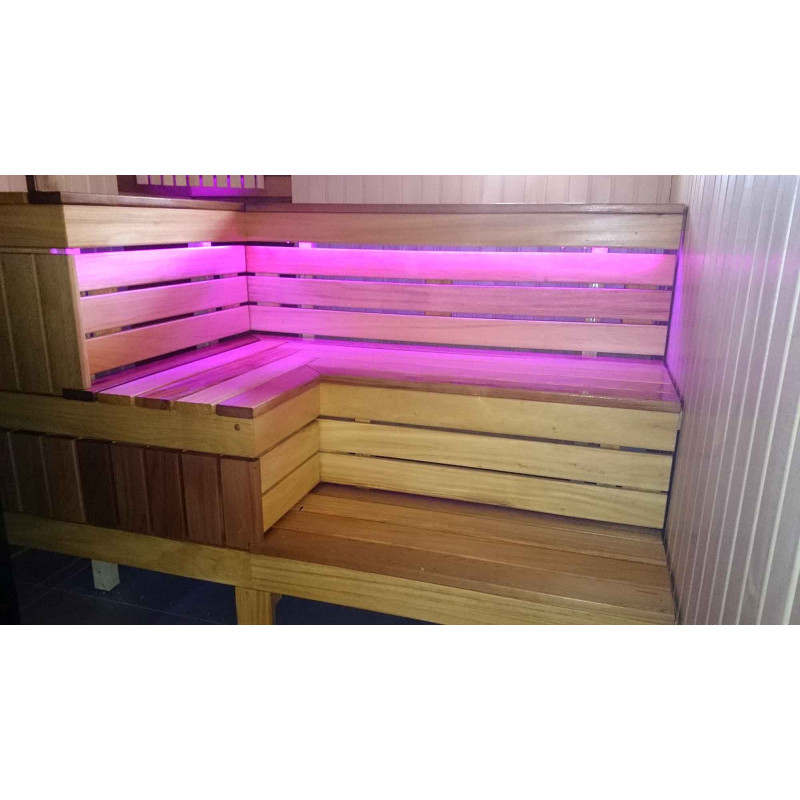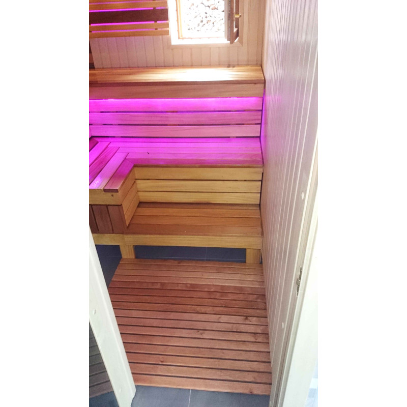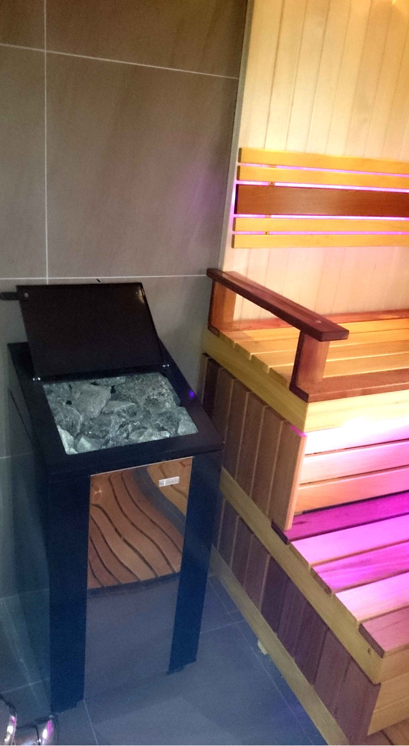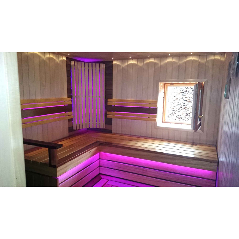 Saunaen er udstyret med et ventilationssystem. Farvet belysning installeres under bænke og bag ryglænene, hvilket skaber et hyggeligt, beroligende miljø. Hængelampe Harvia med abachi træbetræk. Harvia termometer og hygrometer, to skalaer.