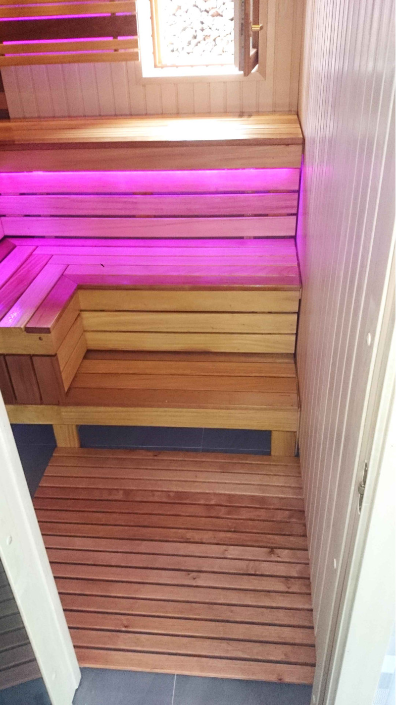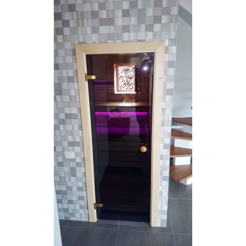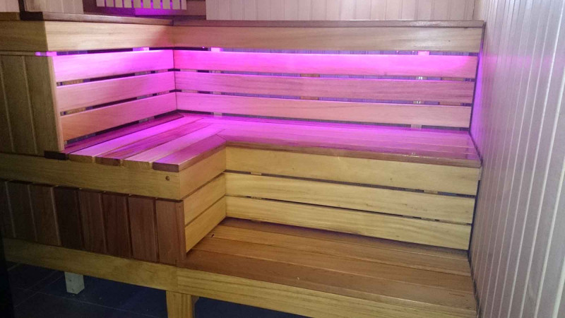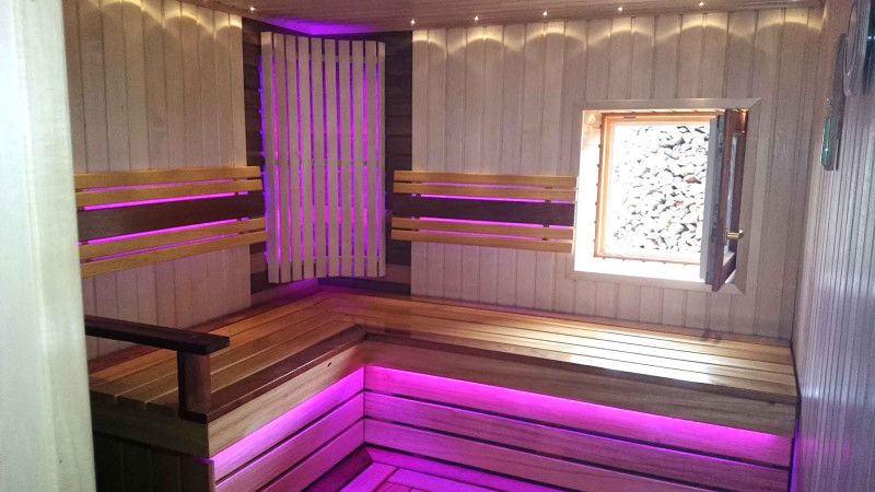 Saunabænkene og lampeskærmen er lavet af afrikanske abachi træplanker. Dette træ af høj kvalitet varmer mindst af alt, så det er rart at røre ved det i saunaen. Vægge og lofter er udført i fyrretræspaneler. Vinduet i saunaen understøtter strømmen af naturligt lys, udvider rummet og skaber sammenhæng med naturen. Vinduesglas - hærdet, varmebestandigt, bronzeglas.