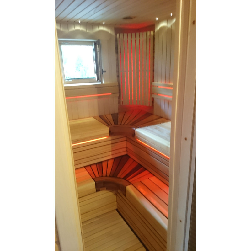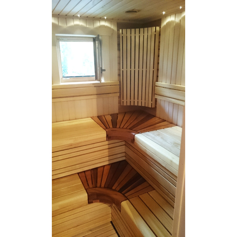 Saunaens indre er lavet af linde- og cedertræ af højeste kvalitet, bænkene er lavet af abachi- og cedertræ. Dette træ er bedst egnet til bænke, da det opvarmer lidt, det er sikkert og behageligt at røre ved sådant træ.