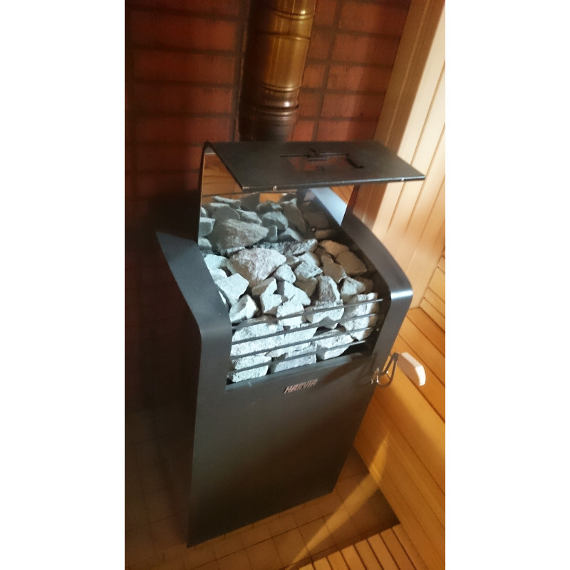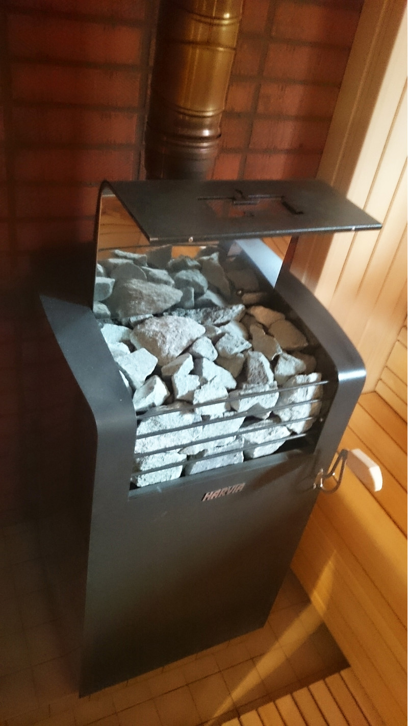 Der er ventilation for at sikre en ordentlig luftcirkulation i saunaen, og der er installeret en skorsten med varmelegeme. Varmemodellen er af den lukkede type, som opsamler varme og giver meget damp. Under opvarmning lukkes låget, hælder vand på stenene - det åbnes.
