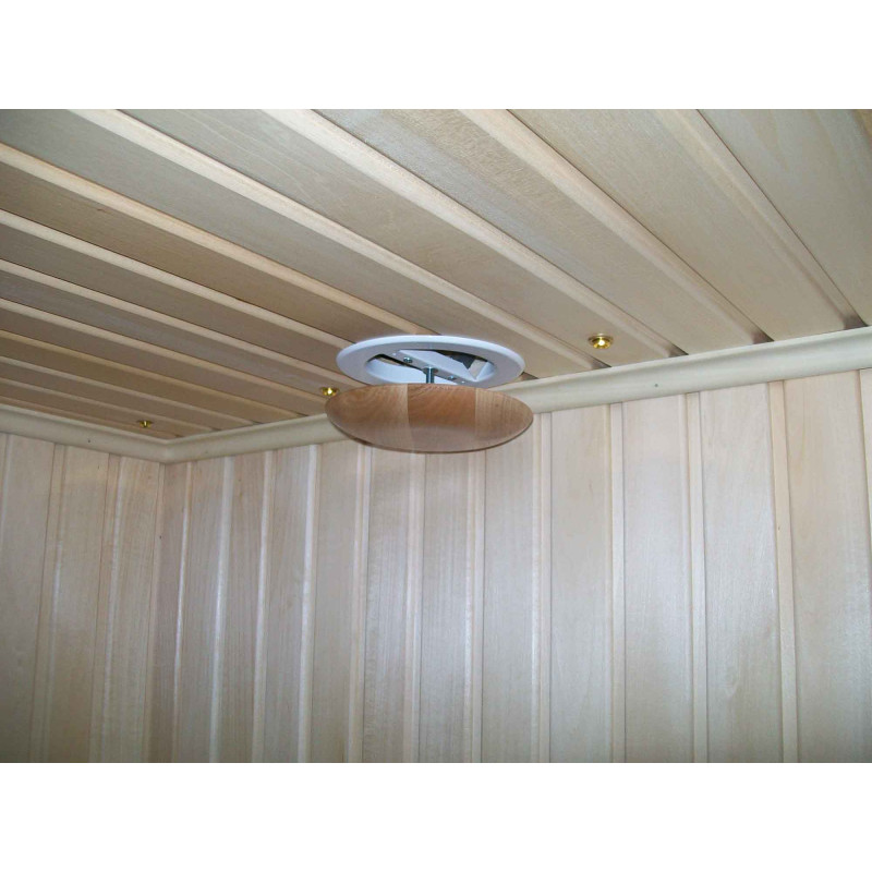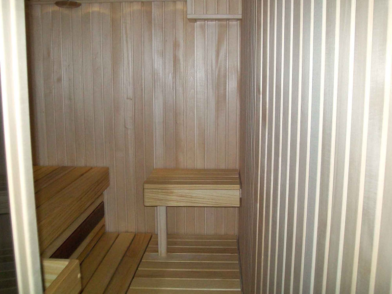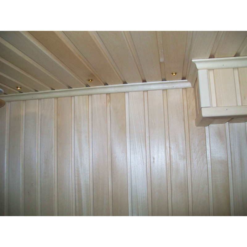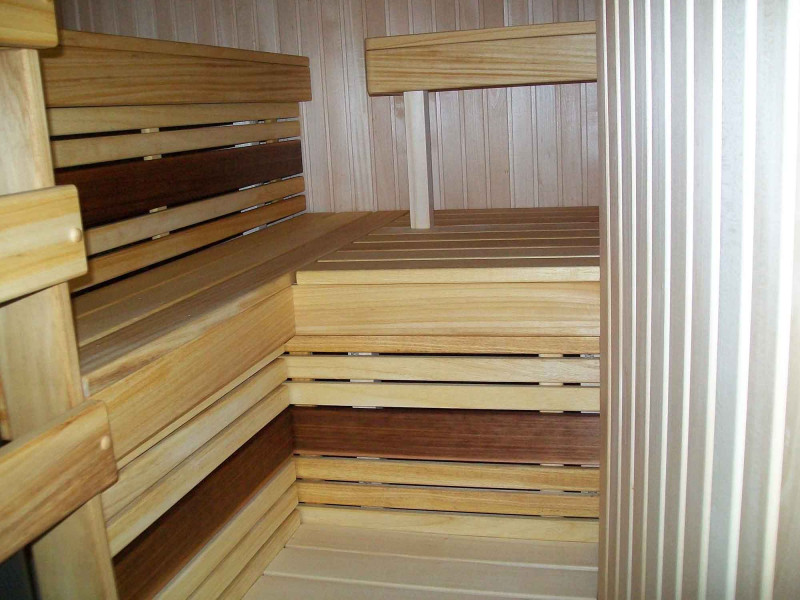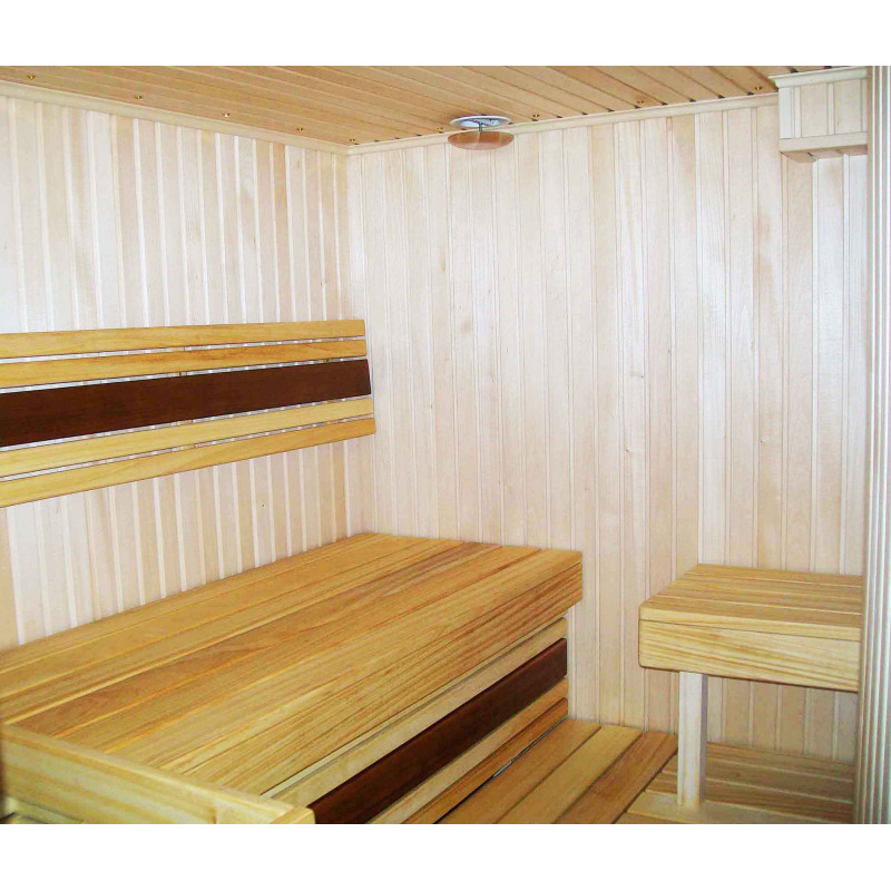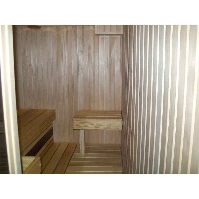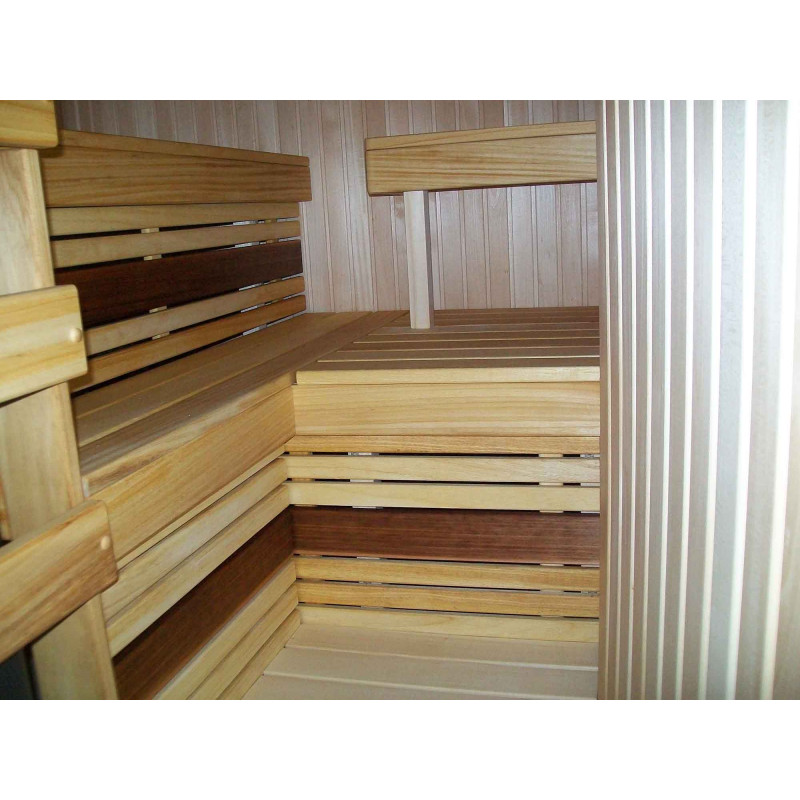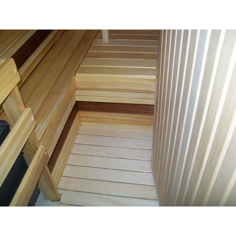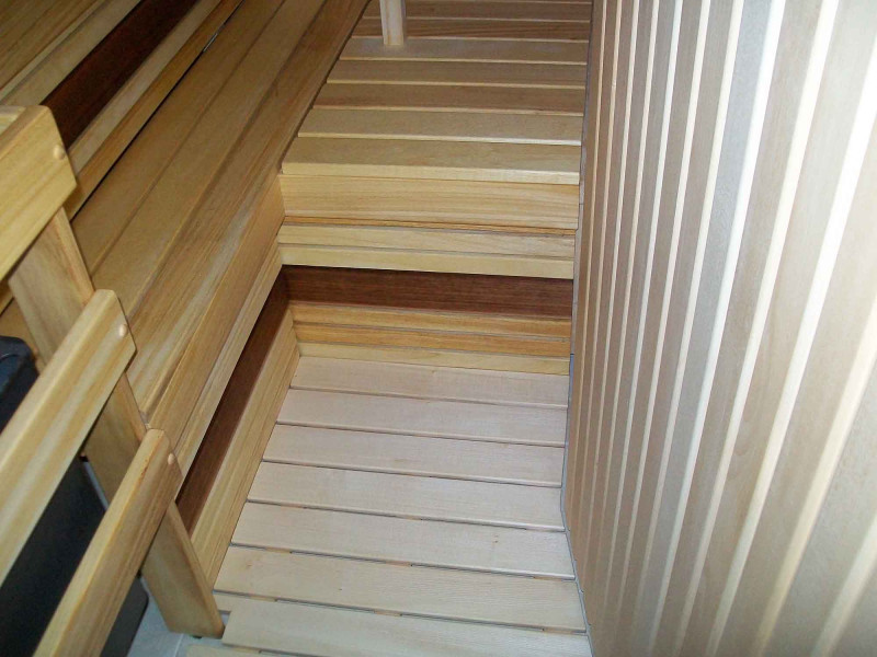 15 mm lindebeklædning bruges til at installere lofter og vægge i saunaen - stilfuldt, let og udsender en behagelig duft af træ. Til bænkene og ryglænene er valgt den højeste kvalitet af cedertræ og abachitræ. Dette træ er af høj kvalitet, ser ikke kun smukt ud, men varmer også mindst i forhold til andre træsorter, så det er rart og sikkert at røre ved sådanne bænke. Gulvrist - sort elletræ.