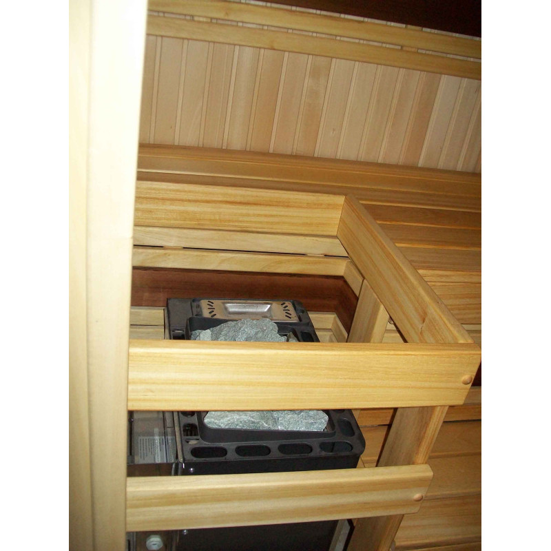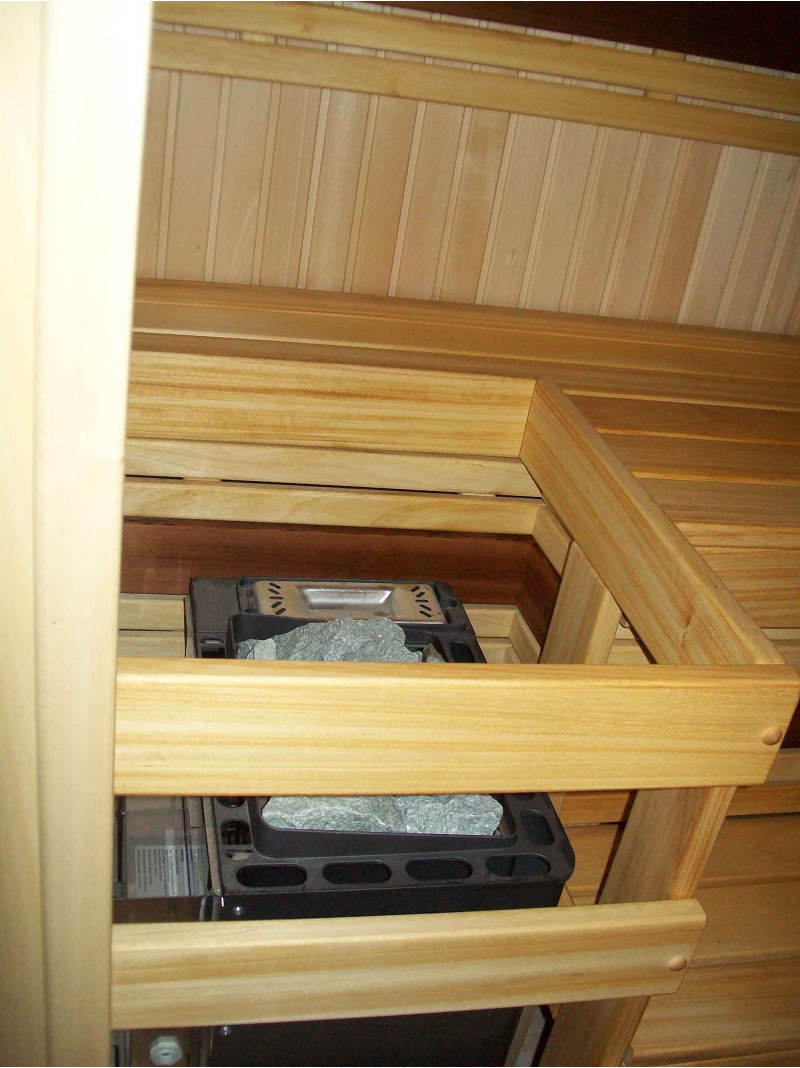 Varmekilden er EOS Bi-O Thermat elektrisk saunavarmer hængt på væggen. Dette varmelegeme er velegnet til langtidsbrug i private saunaer. Varmeren har en fordamper med integreret duftkop. Xenio Combi CX110C kontrolpanelet monteres separat uden for saunaen.