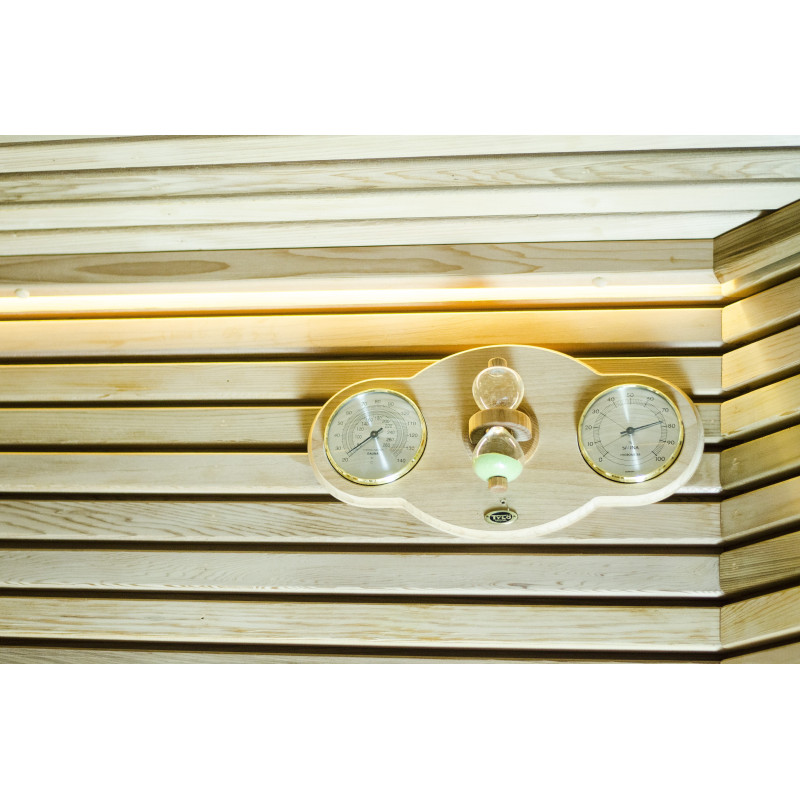 Saunatilbehør: spand- og øsesæt, trætermometer med hygrometer og timeglas.