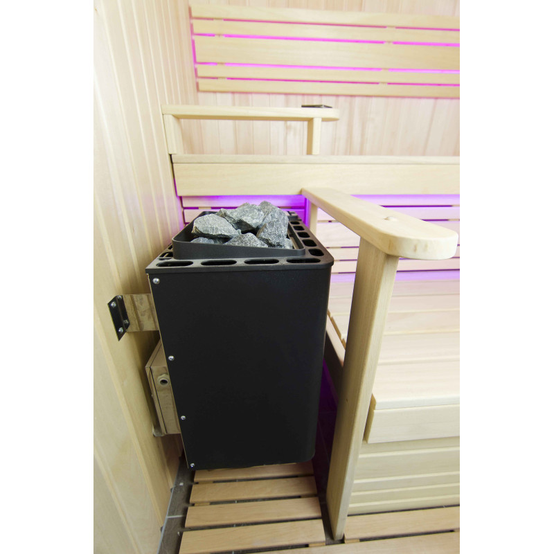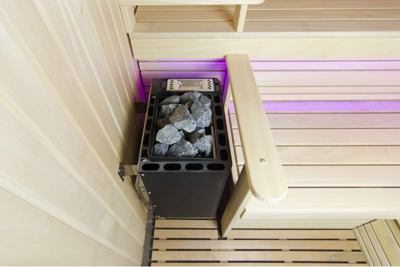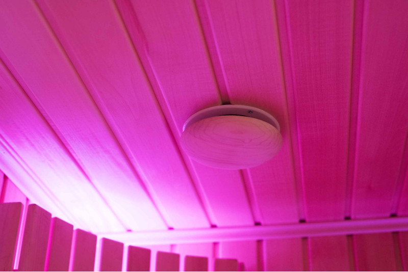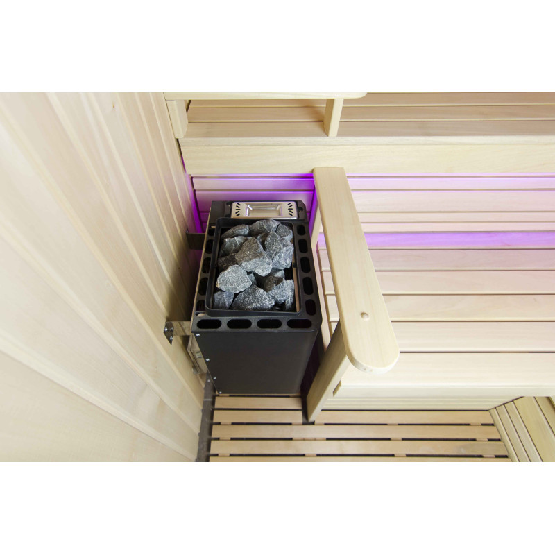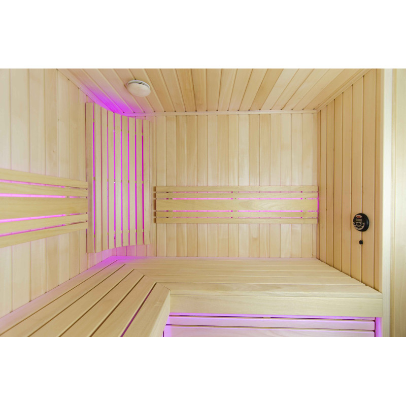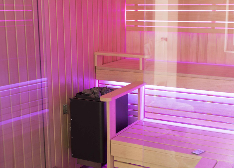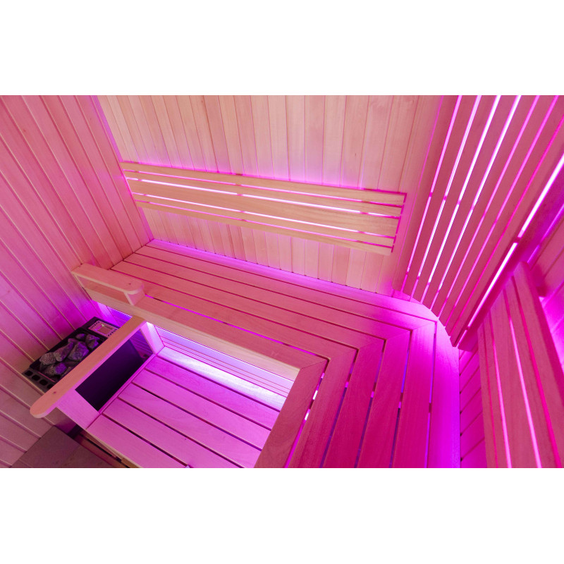 Det indre af saunaen er lavet af lindetræ af højeste kvalitet, solsenge er lavet af abachitræ - ikke -opvarmende og perfekte til saunaen.