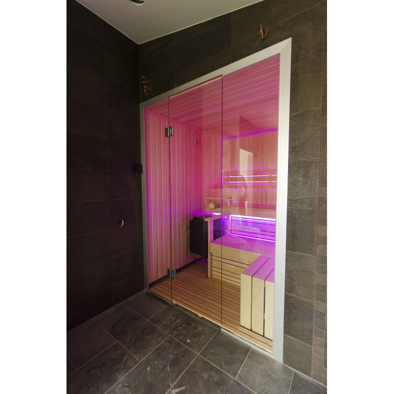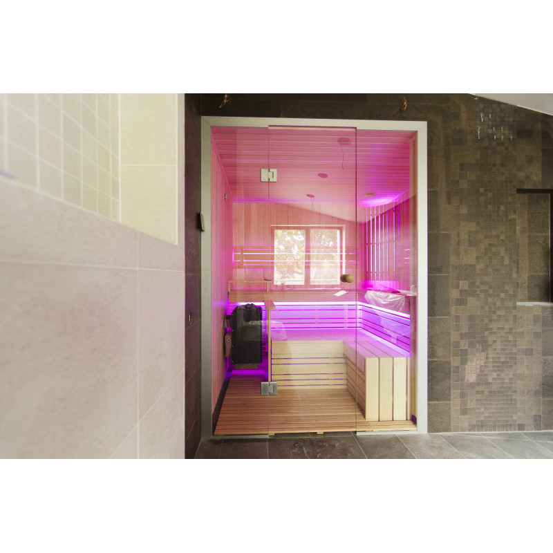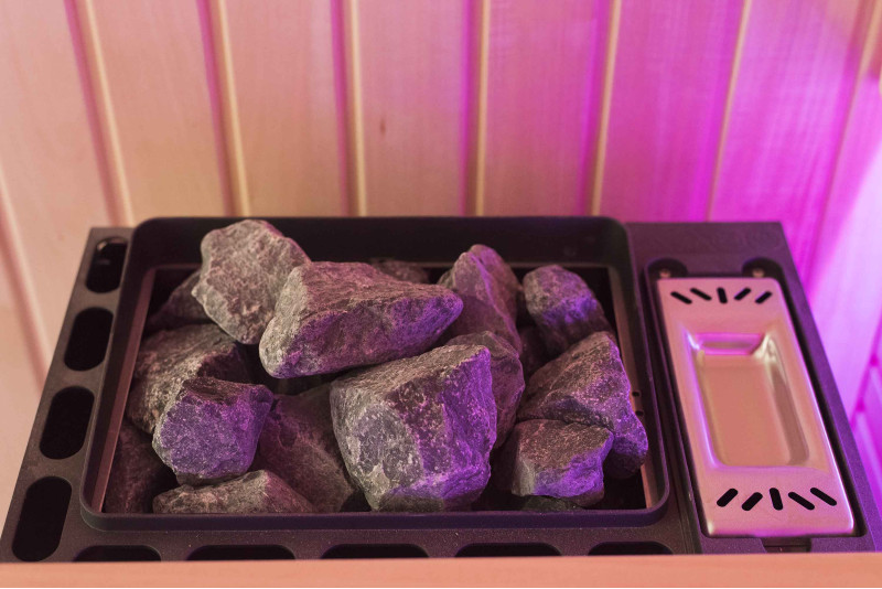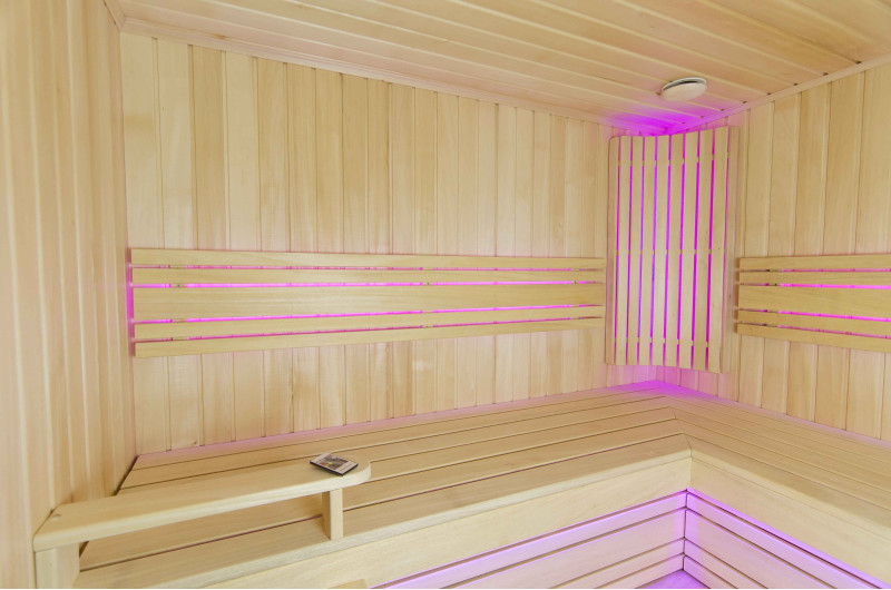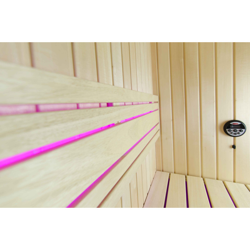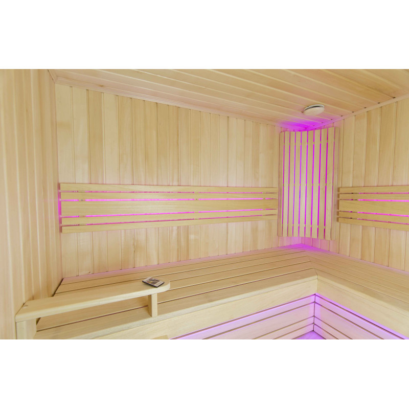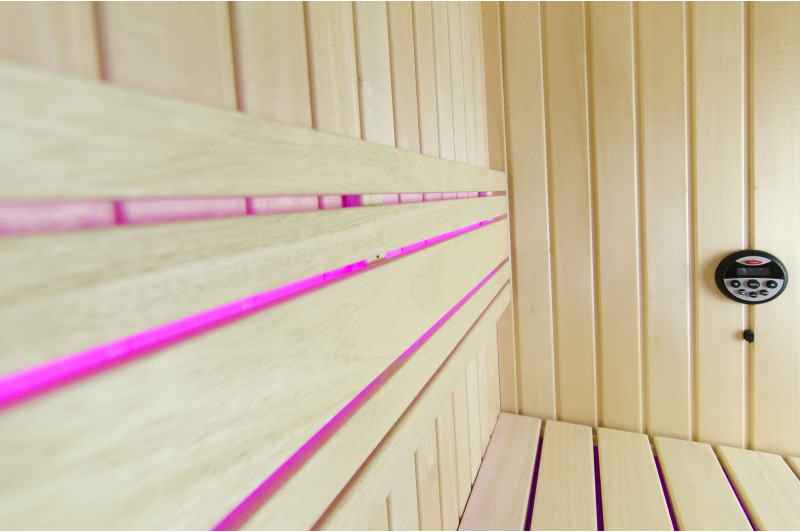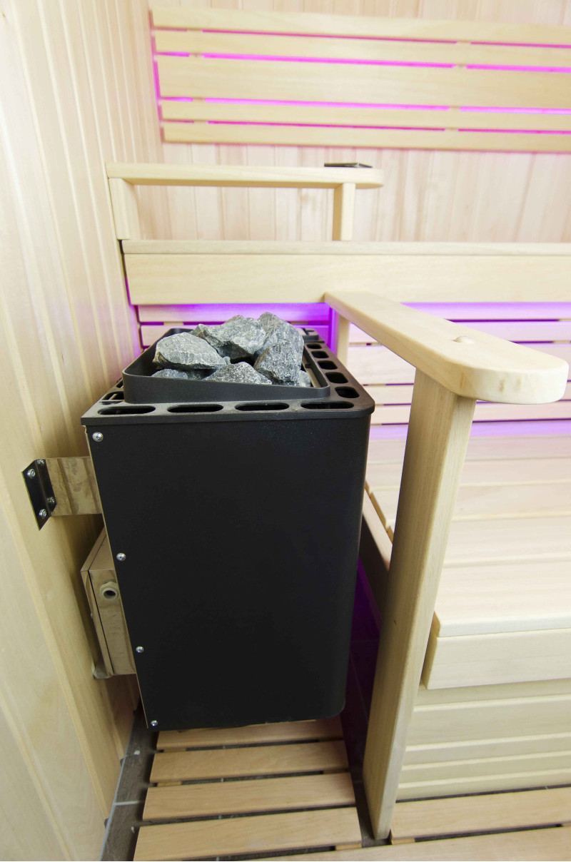 Det indre af saunaen er lavet af lindetræ af højeste kvalitet, solsenge er lavet af abachitræ - ikke -opvarmende og perfekte til saunaen.