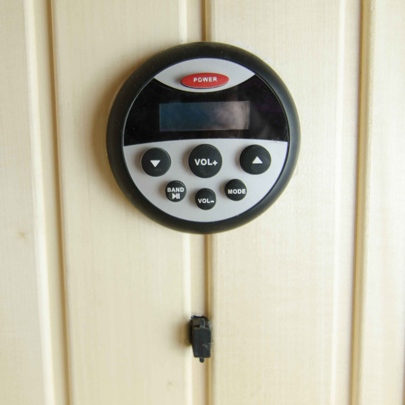Et moderne sauna -projekt til privat brug er blevet implementeret i Melnrage. Der var et hjørne i badeværelset plads til fornøjelser af en familie sauna. De store vinduer i saunaen åbner for udsigten til naturen gennem badeværelsesvinduet, hvilket sikrer en konstant lyskilde og optisk forstørrer rummet i det ikke særlig store saunarum. Ud over den flotte udsigt forstærkes saunaens fornøjelse af lyden - indbygget musikudstyr. Medieafspilleren er specielt tilpasset til brug i en varm, fugtig sauna. Den har en USB -forbindelse, Bluetooth, radio, LCD -skærm, gummikontrolknapper. Højttalerne er også resistente over for sauna fugt, korrosion og temperatur.