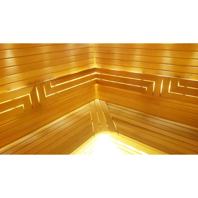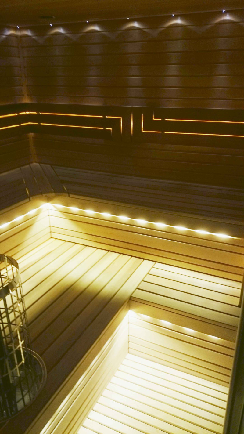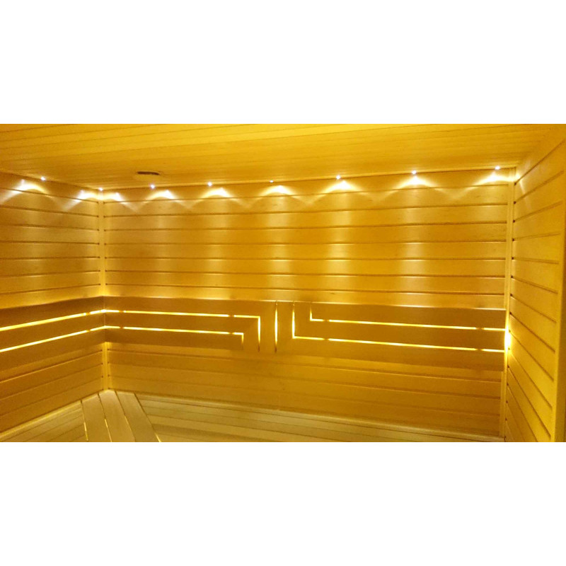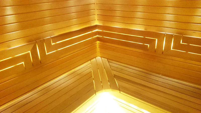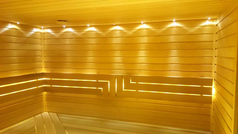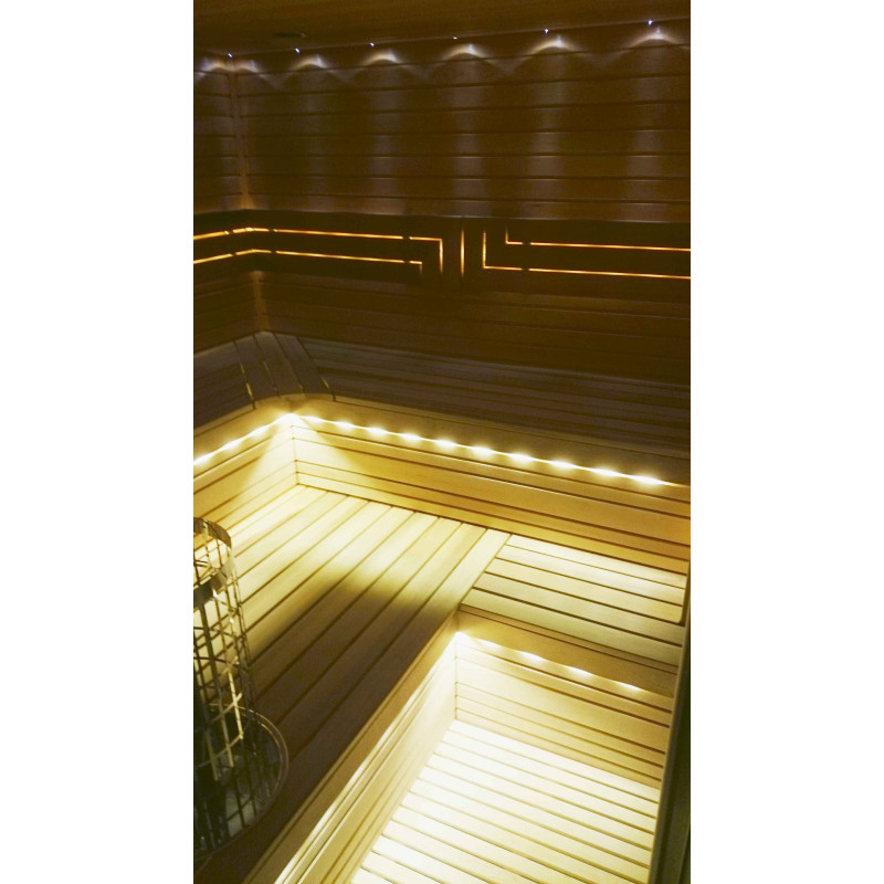 Loftet er udstyret med eksklusiv LED-belysning "Sol", LED-belysningslister er monteret under bænke og ryglæn, varm hvid farve. Takket være belysningen er en del af saunaens afslappende effekt tilvejebragt.