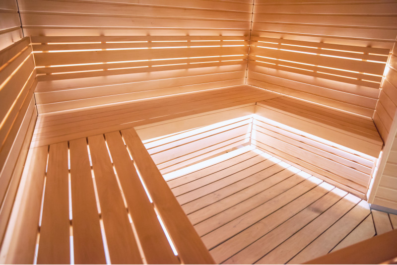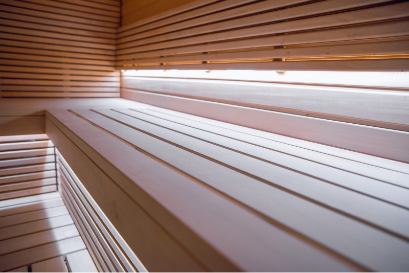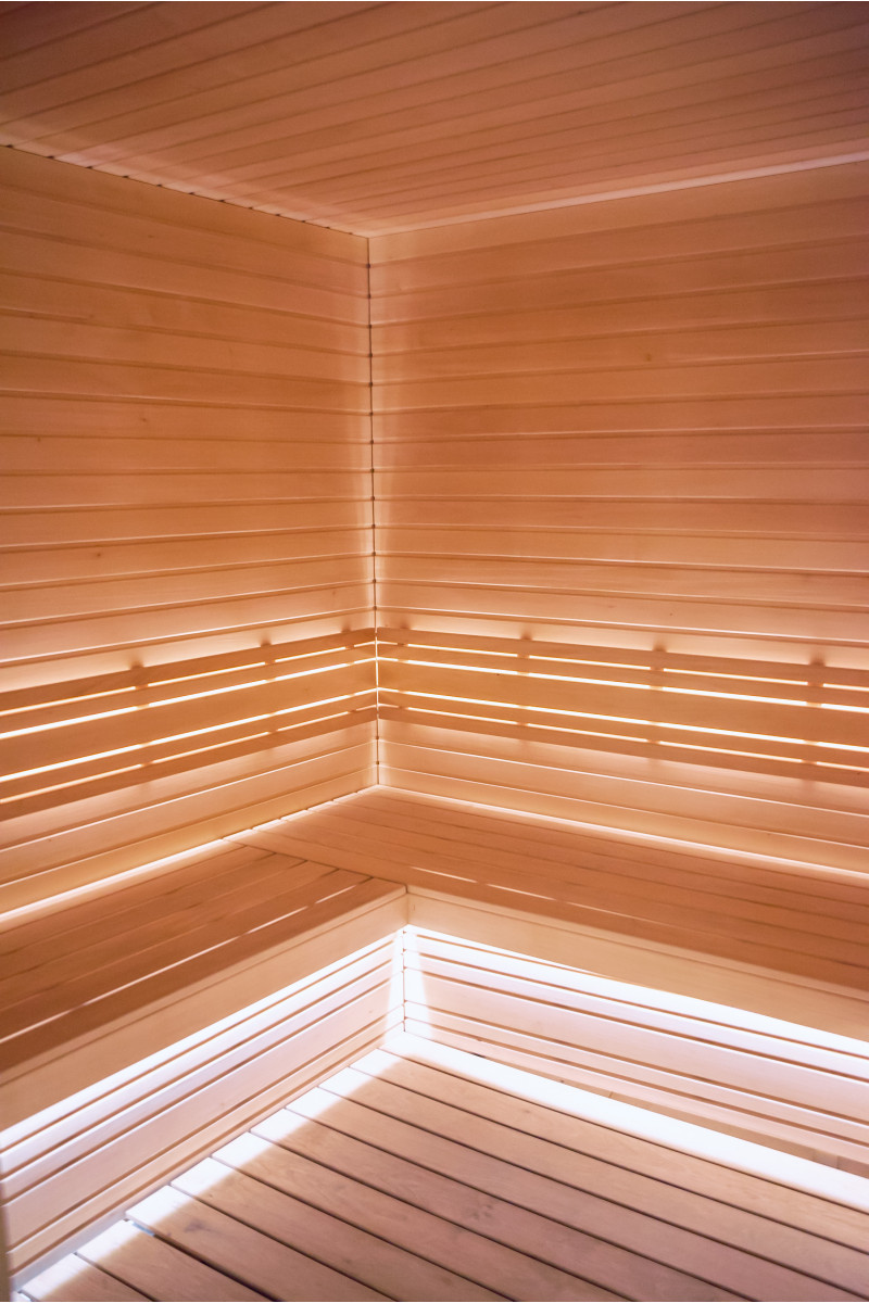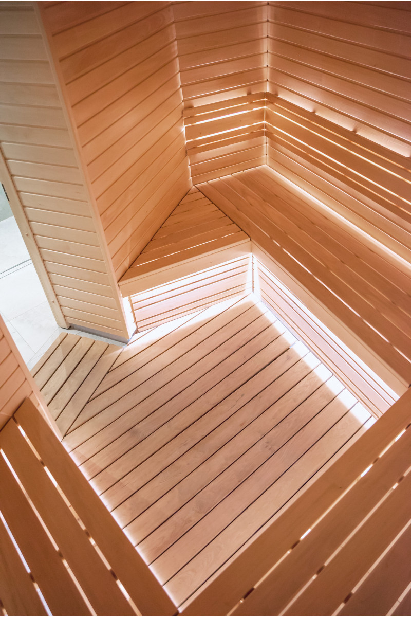 Type A lindetræ blev brugt til saunasenge, rygstøtter, saunaloft og vægpaneler. Gulvristen er udført i sort elletræ.