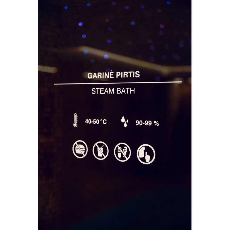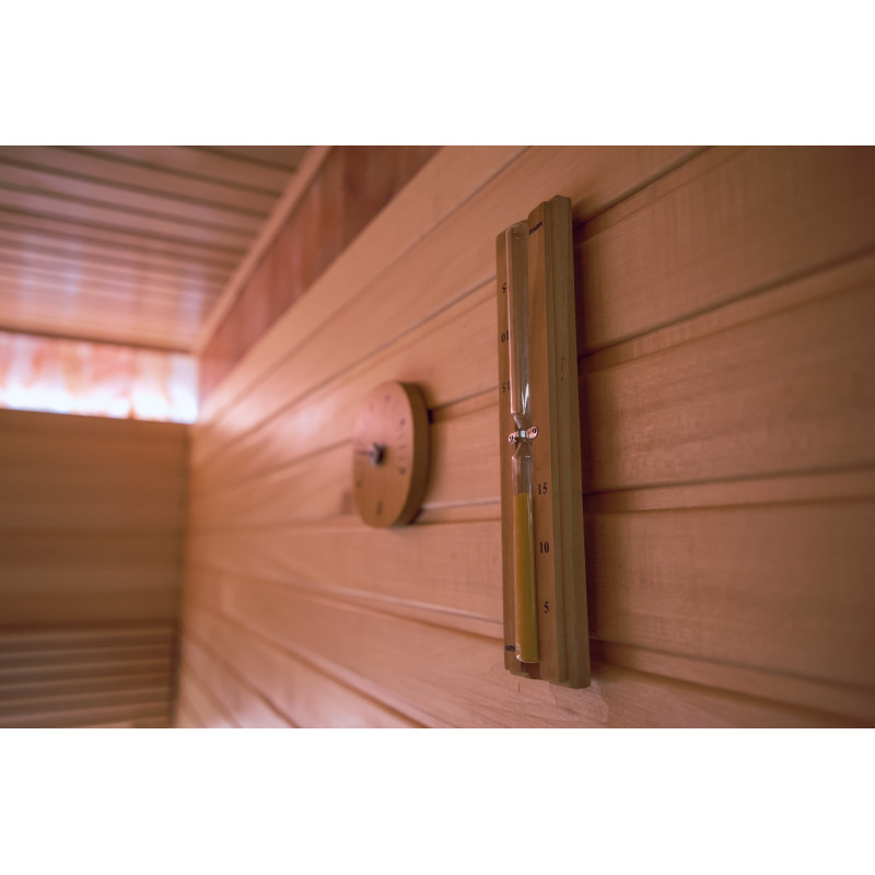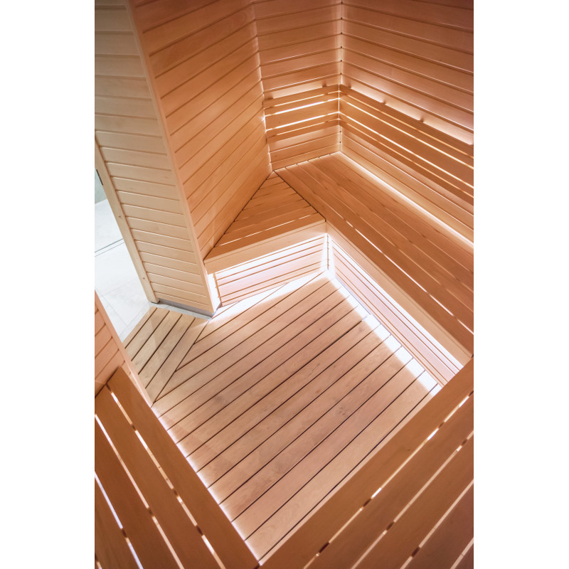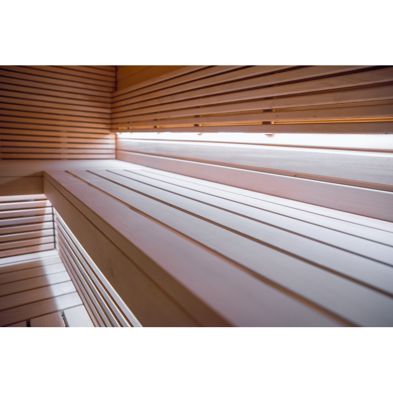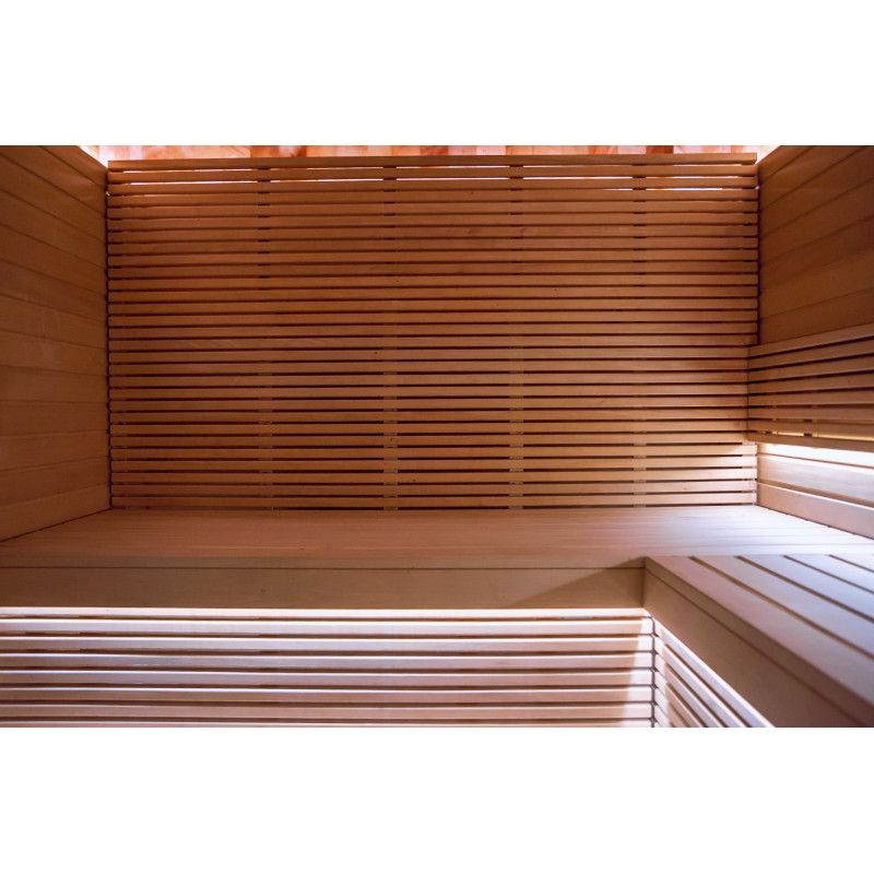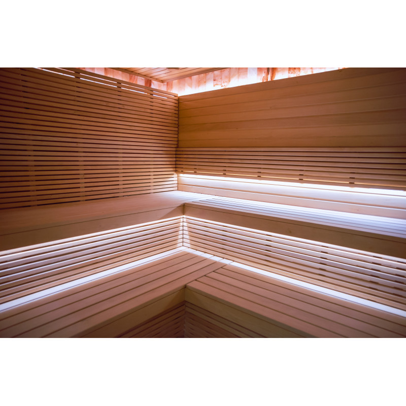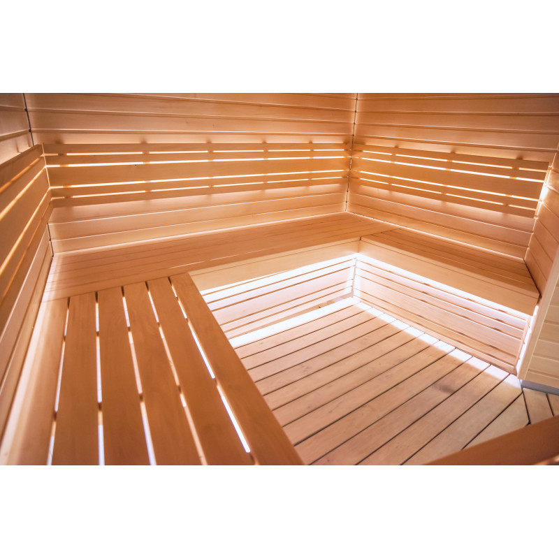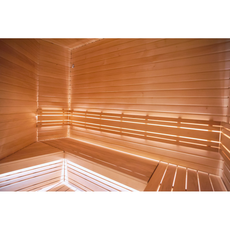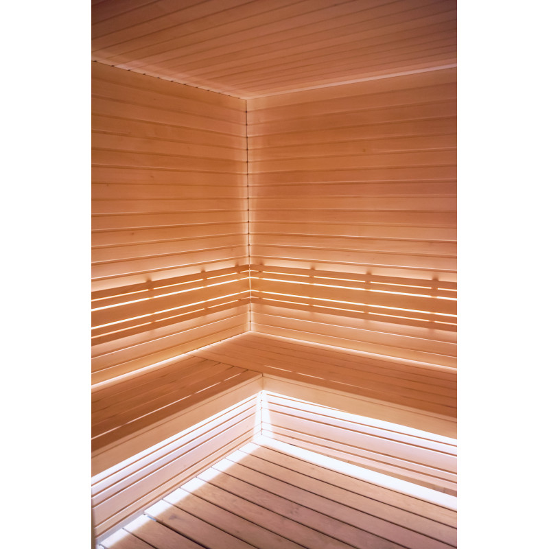 Saunaen er udstyret med ventilationsudstyr, LED-belysning under de øverste køjer og i rygstøtterne.