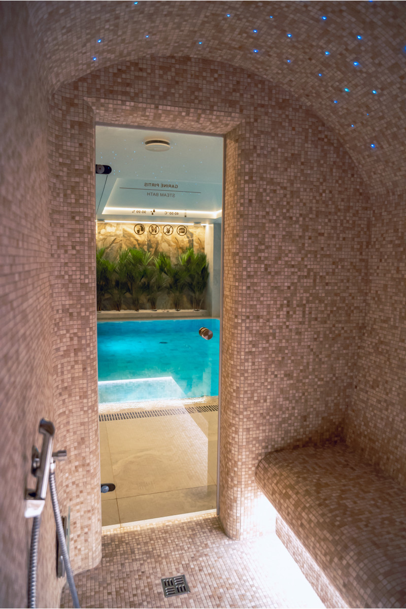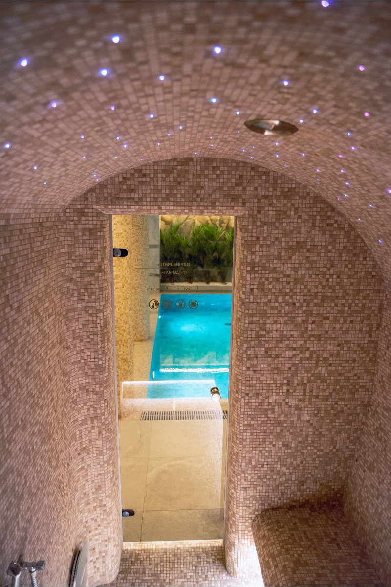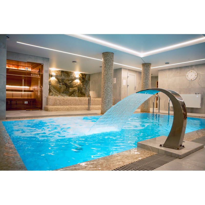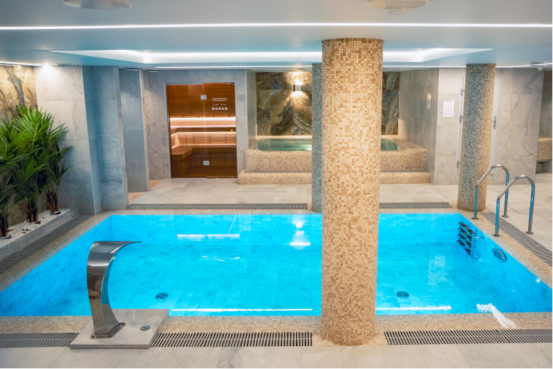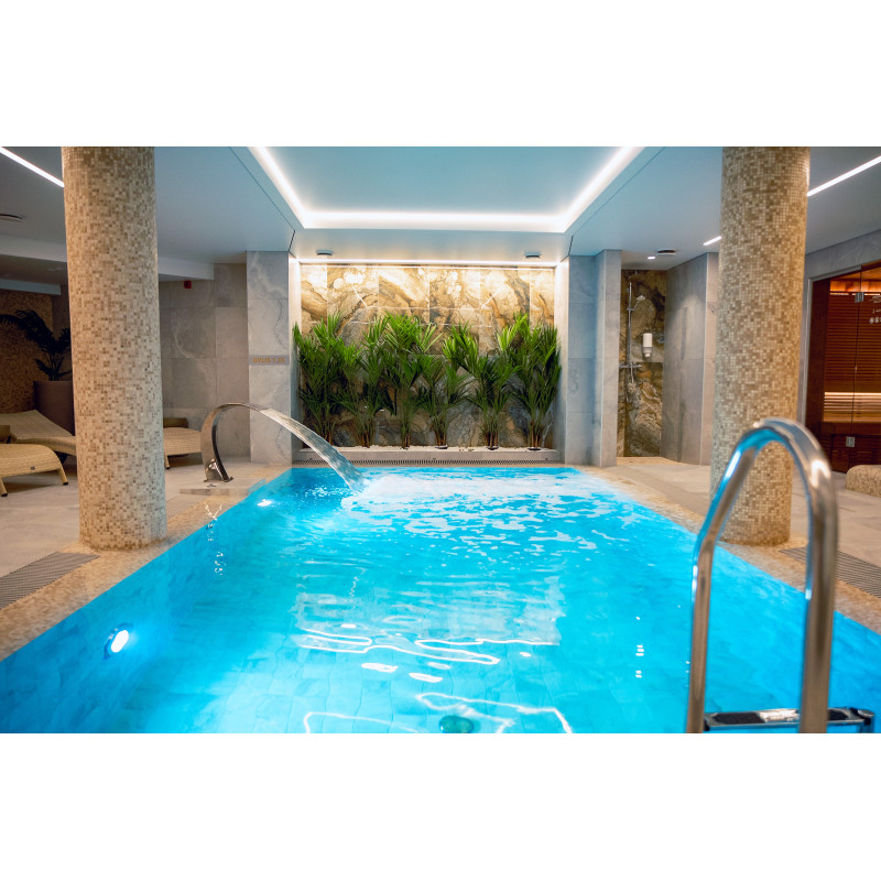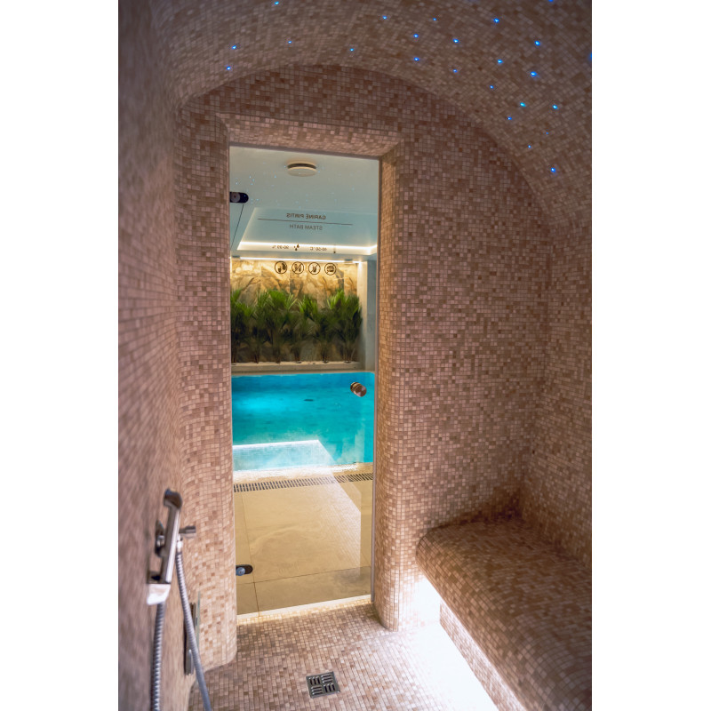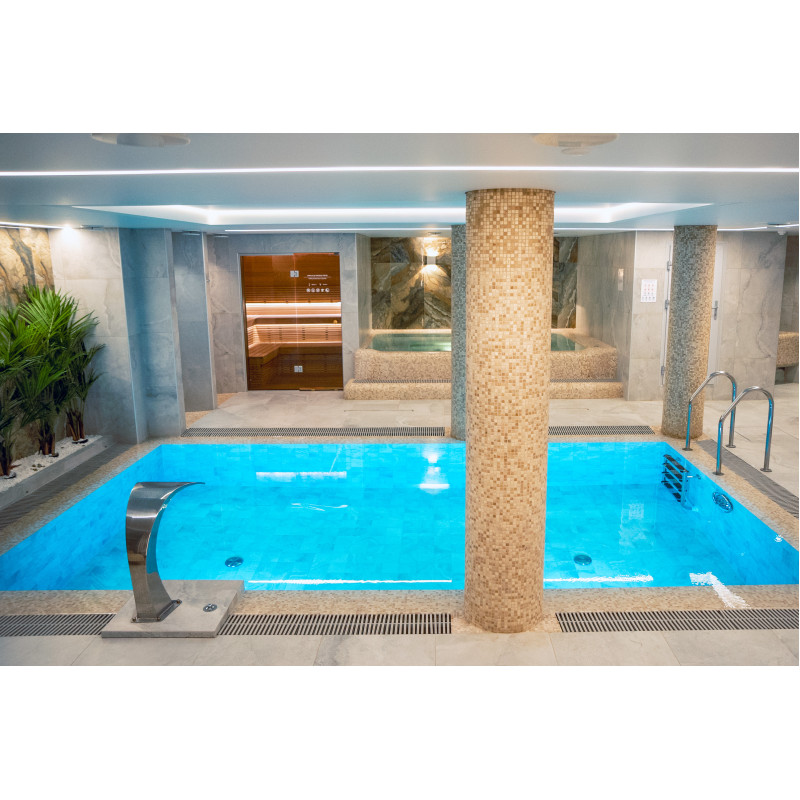 Komplekset omfatter et dampbad, en sauna, en isgenerator og en pool med massagestråle og spabad.