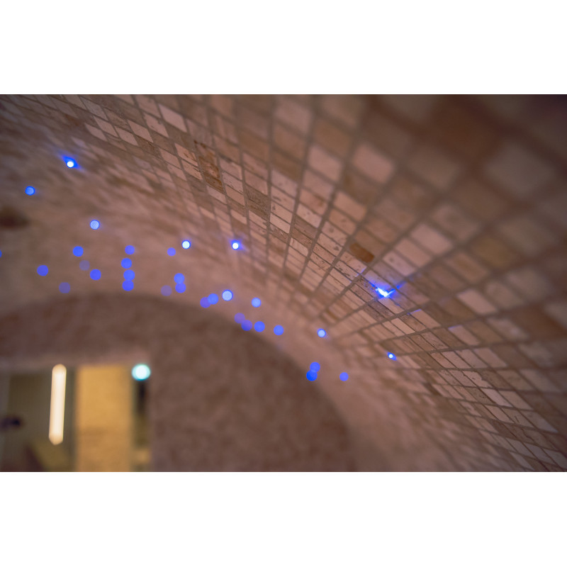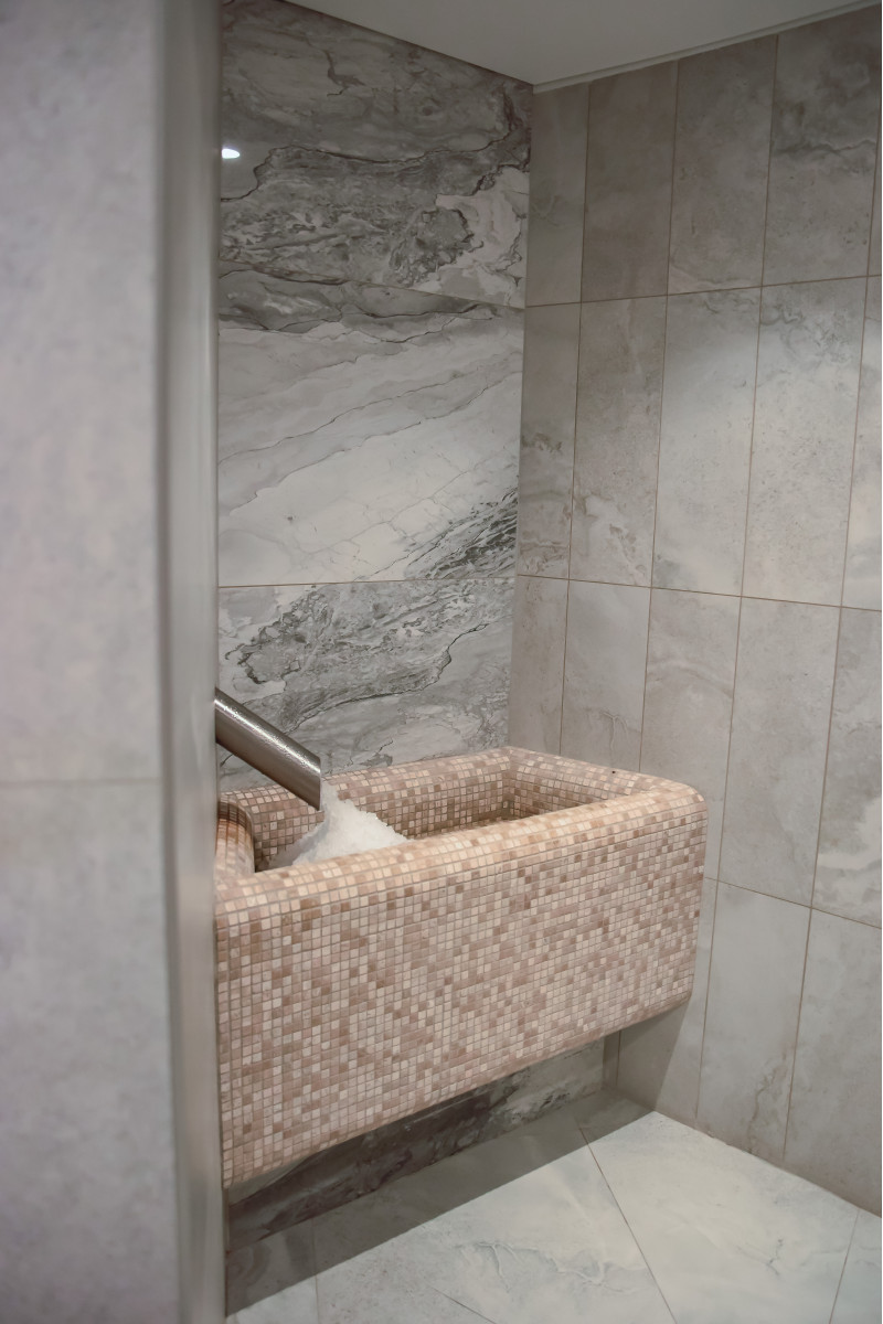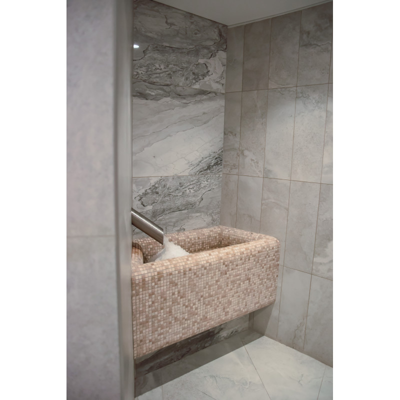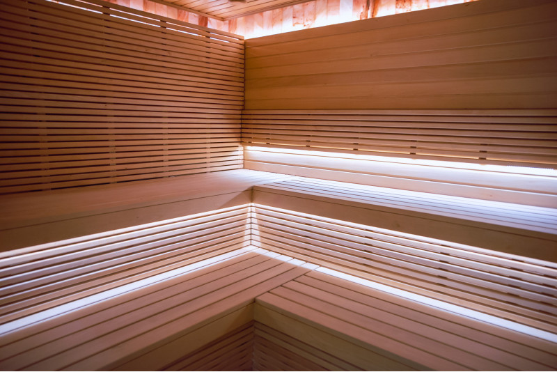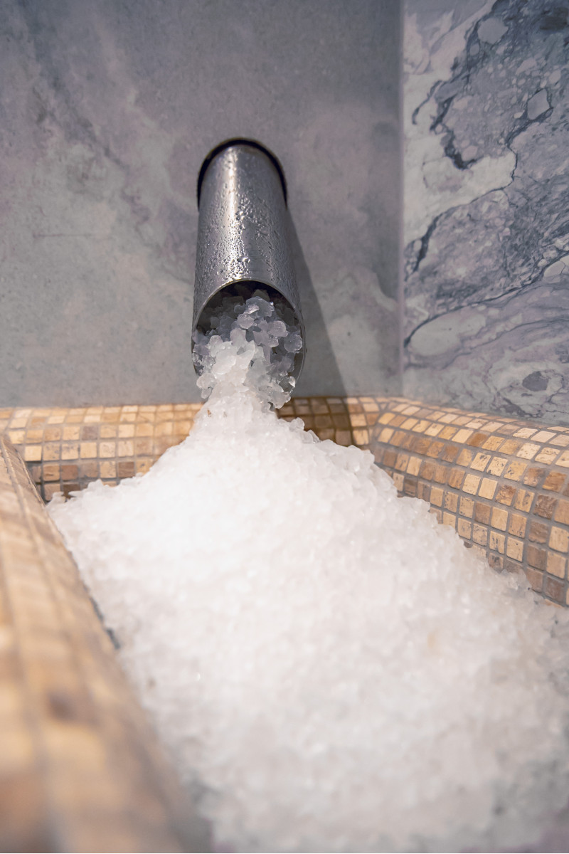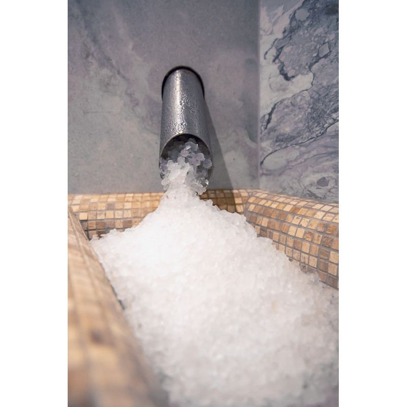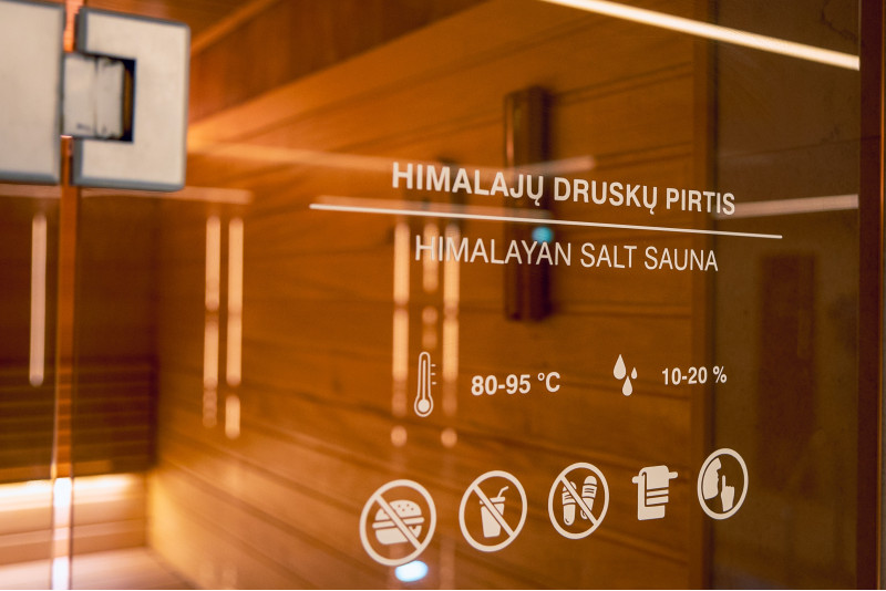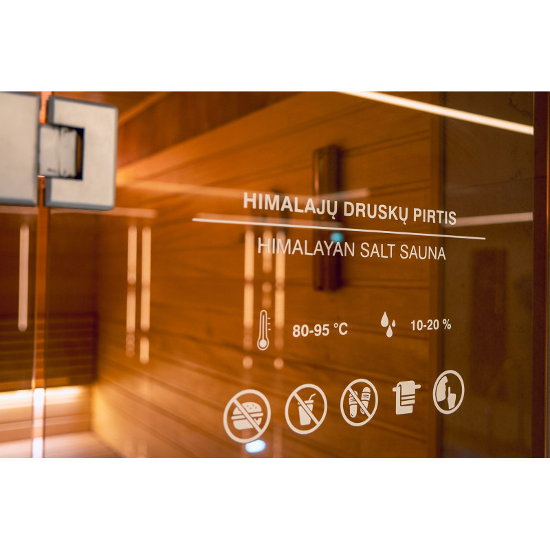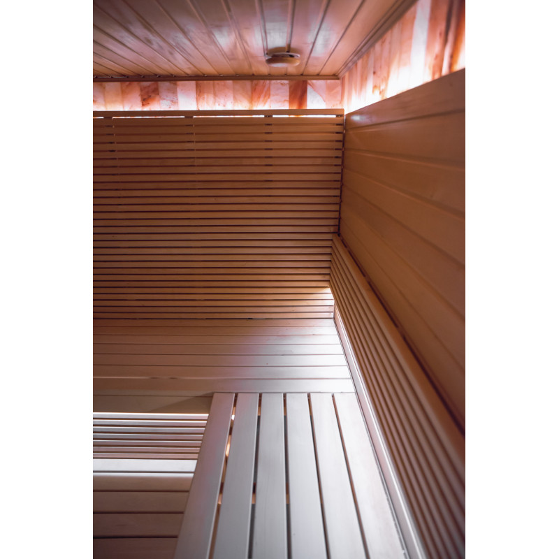 En Himalaya-saltflisevæg i en moderne sauna er en glimrende løsning både med hensyn til æstetik og forbedring af sundheden. En stribe Himalayasalt dannes 20 cm høj på væggen lige ved loftet rundt om hele saunaens omkreds. Der er installeret LED-belysning bag saltfliserne.