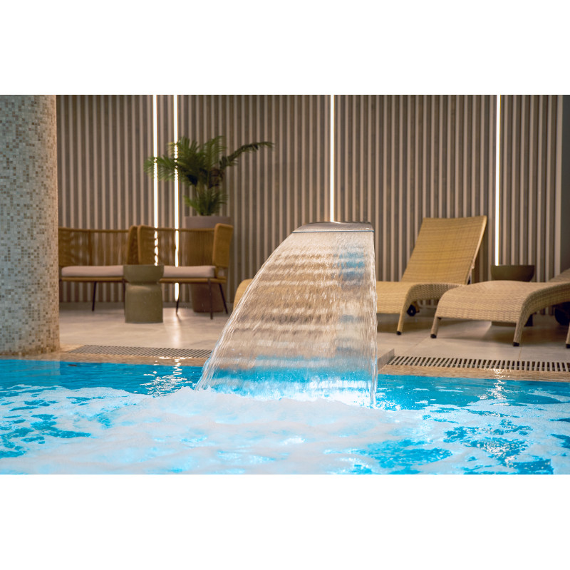 filtre, cirkulationspumpe, massagepumpe, automatisk kemikaliedoseringsstation, vandvarmer, UV-sterilisator, LED undervandsspot, dobbelte vand-luftdyser, luftmassagedyser, overløbsrist, poolafdækning mv.