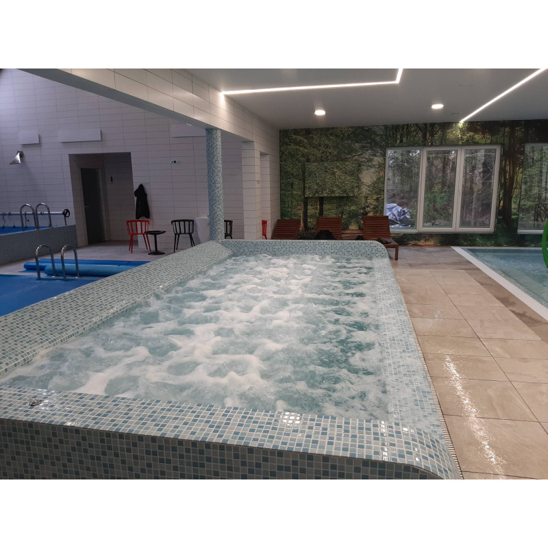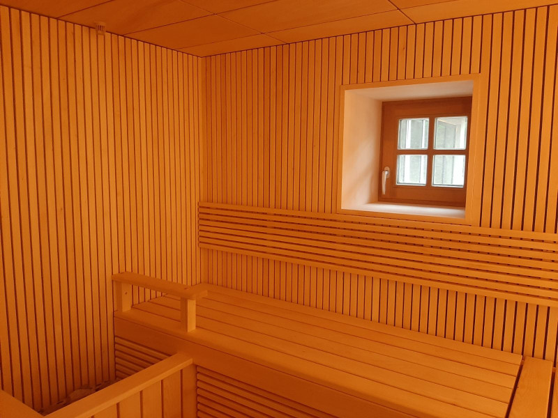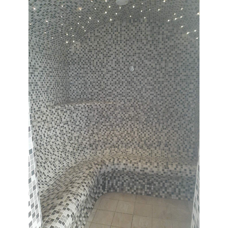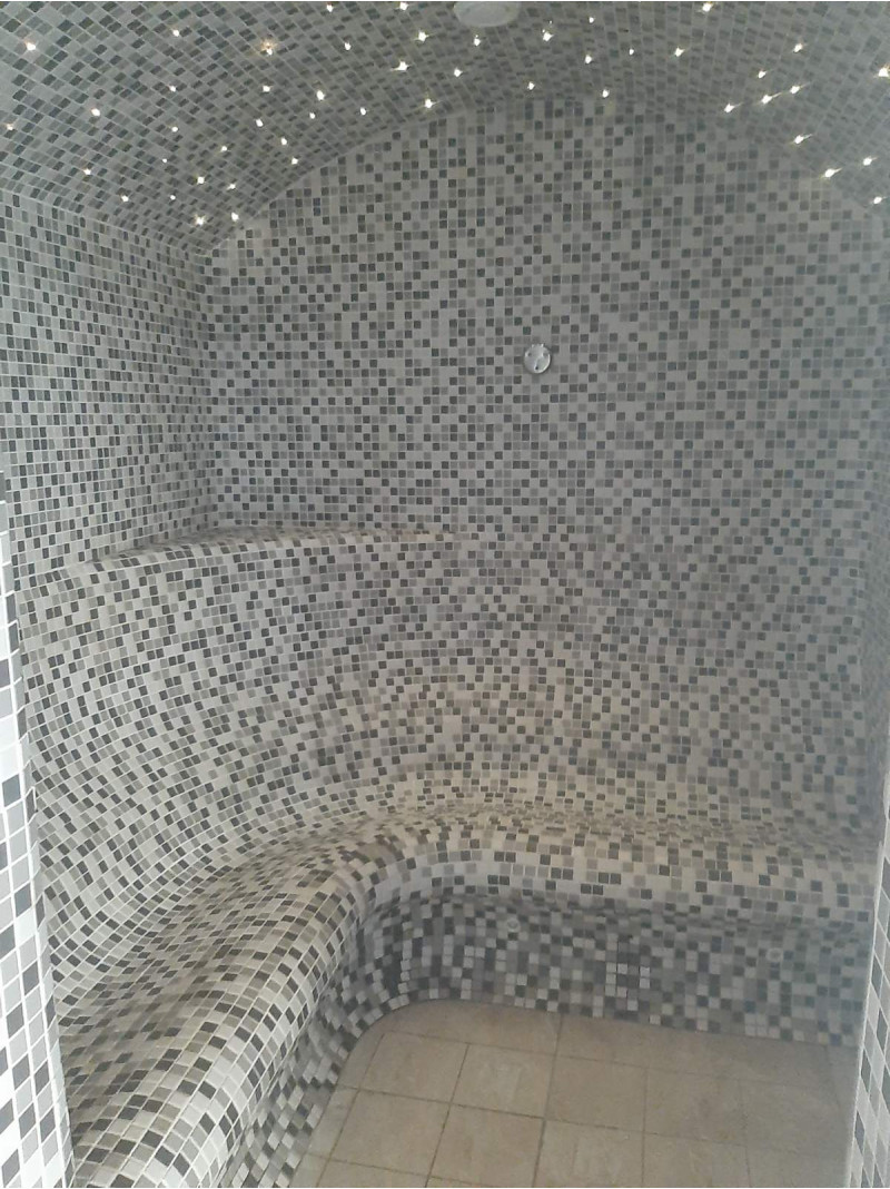 - Dampsauna - brugte materialer, der kan modstå ekstremt høje temperaturer og meget høj luftfugtighed. Loftet er en buetype, så dampkondensatet ikke drypper ned på de mennesker, der nyder saunaen. Der er valgt fliser til dekorationen og fiberoptisk belysning til loftet, hvilket skaber en stjernehimmeleffekt. Bænkene er i en særlig behagelig form.